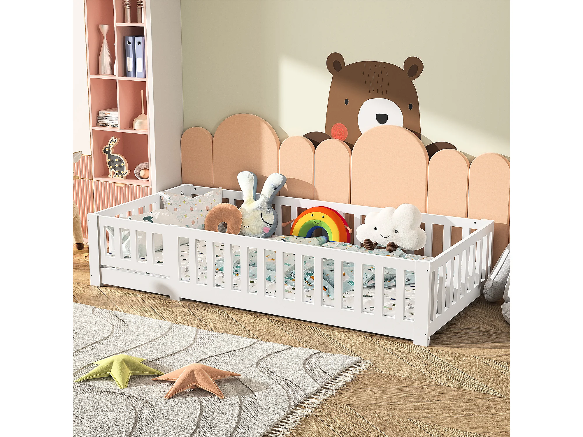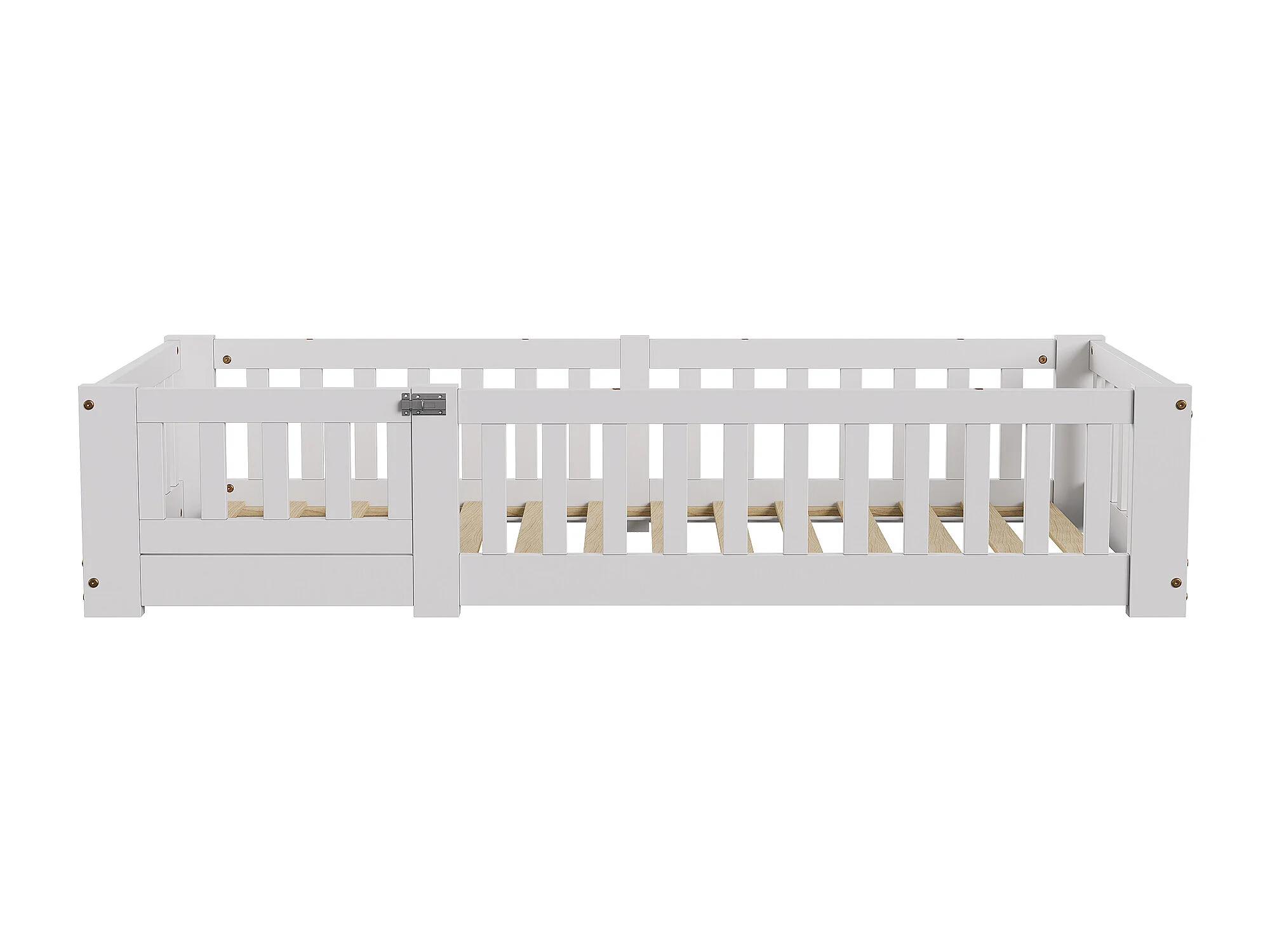 Lit Enfant 90x190 cm, Lit au Sol Montessori avec Barrière de Sécurité et Sommier à Lattes – Bois Massif de Pin – Idéal pour Chambre Garçon et Fille – Blanc