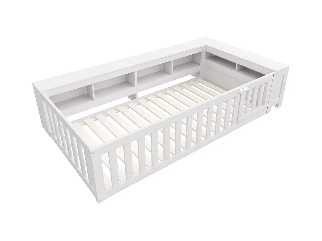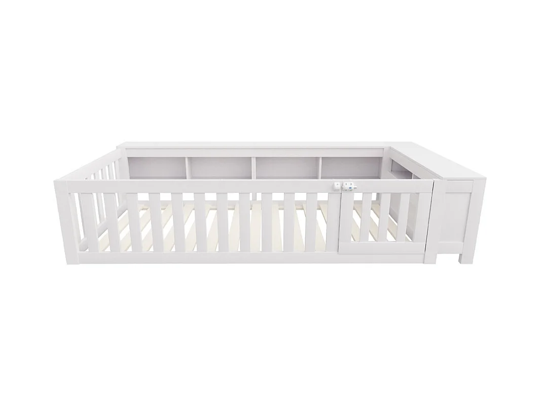 Lit enfant 90x200 avec nombreux compartiments avec barrière de sécurité et petite porte protection de sécurité sur tout le pourtour blanc