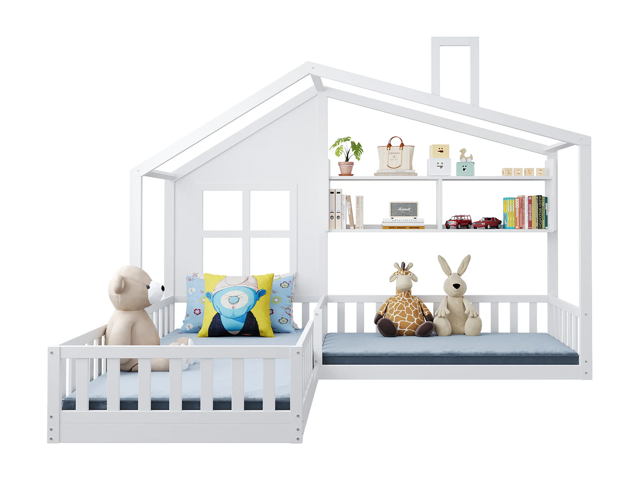 Lit enfant 90x200 cm (140x70 cm), forme maison avec fenêtre et cheminée, étagères, coffre bois massif plein hauteur, garde-corps et lattenrost, blanc