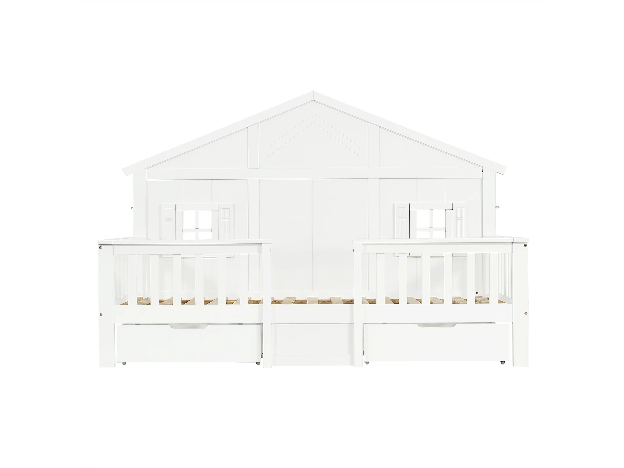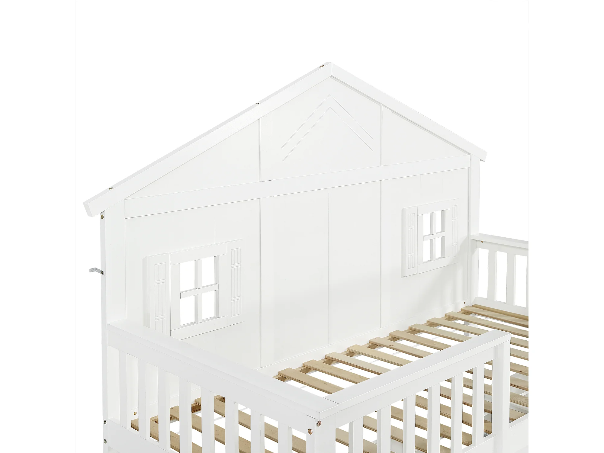 Lit enfant 90x200 cm - avec 2 tiroirs - avec des balustrades et des fenêtres - bois massif + MDF - Blanc (sans matelas)