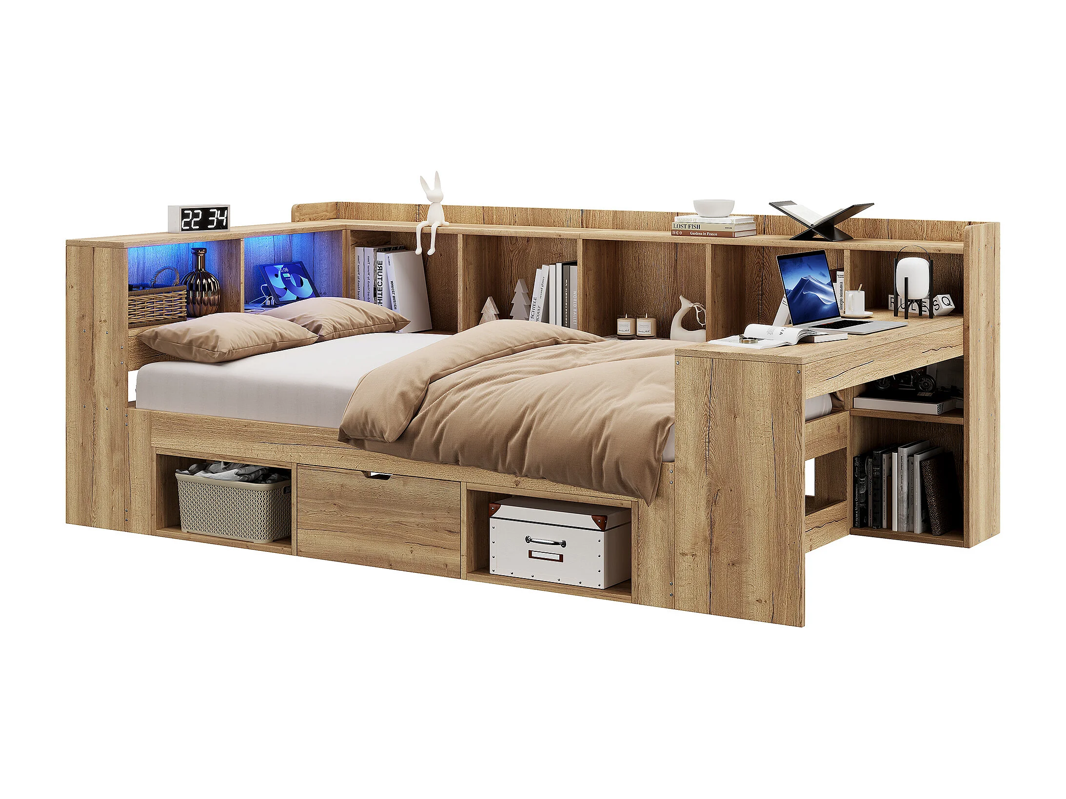Lit enfant 90x200 cm avec bureau, LED, ports USB/Type-C et rangements - Couleur bois naturel