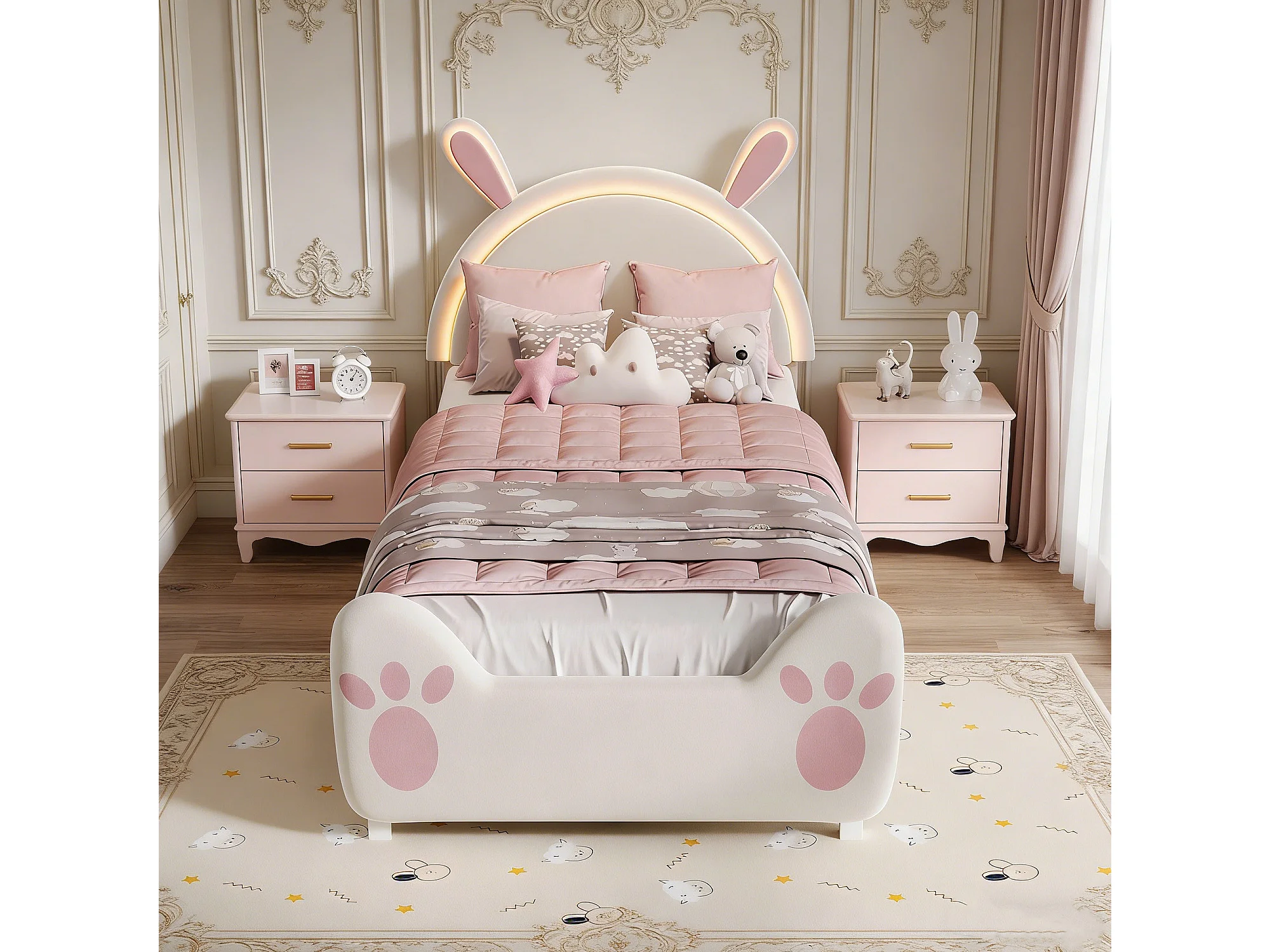 Lit enfant 90x200 cm avec LED et sommier à lattes, tête en forme de lapin, lit fille 90x200 cm, DIY velcro, velours, biege et roes