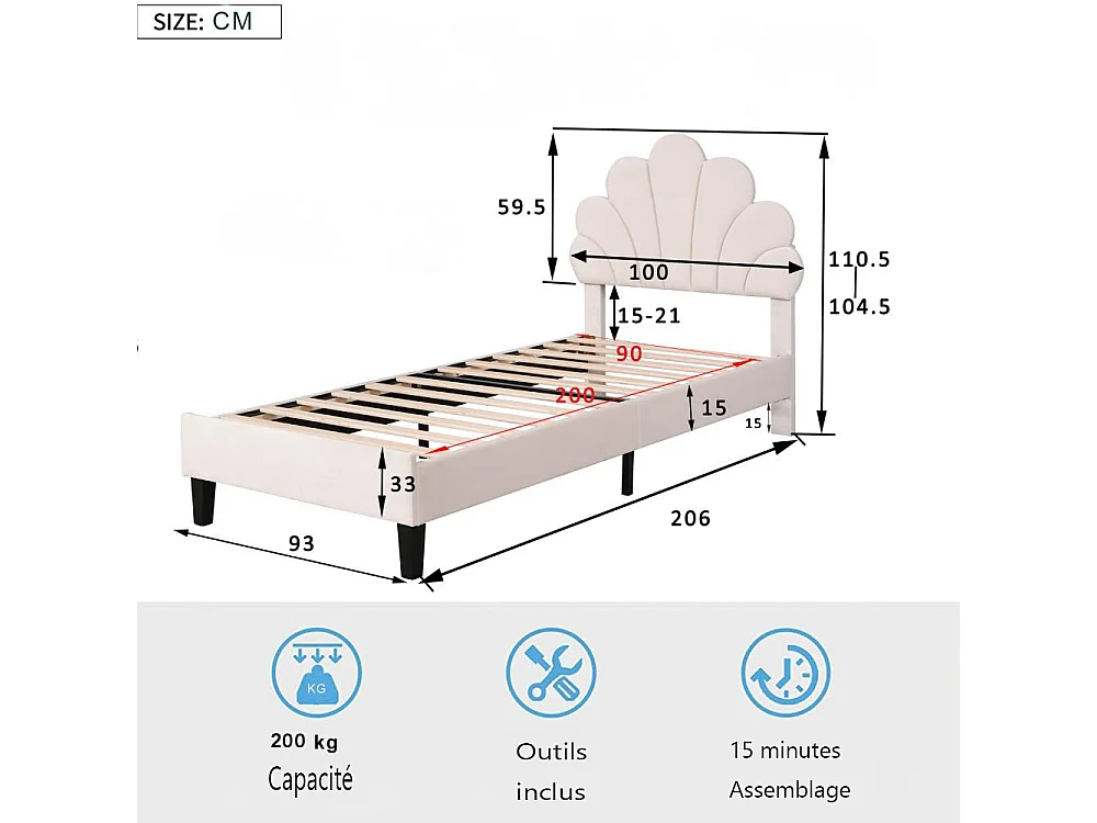 Lit enfant 90x200 cm avec sommier à lattes, lit capitonné en tissu velours 90x200 cm, lit de pétales 90x200 cm- beige
