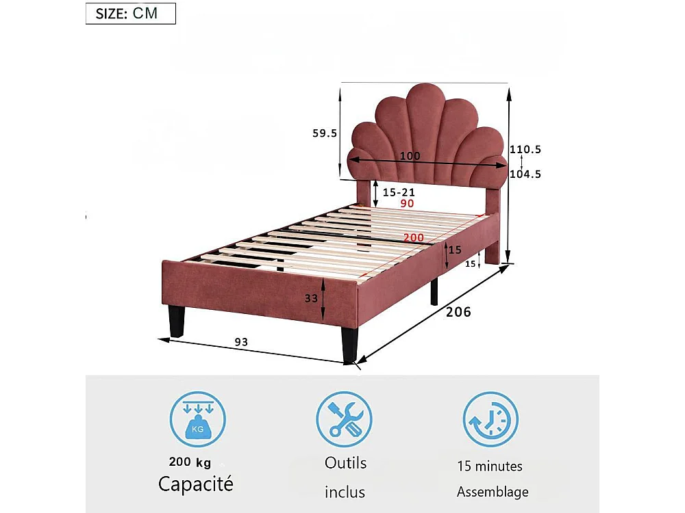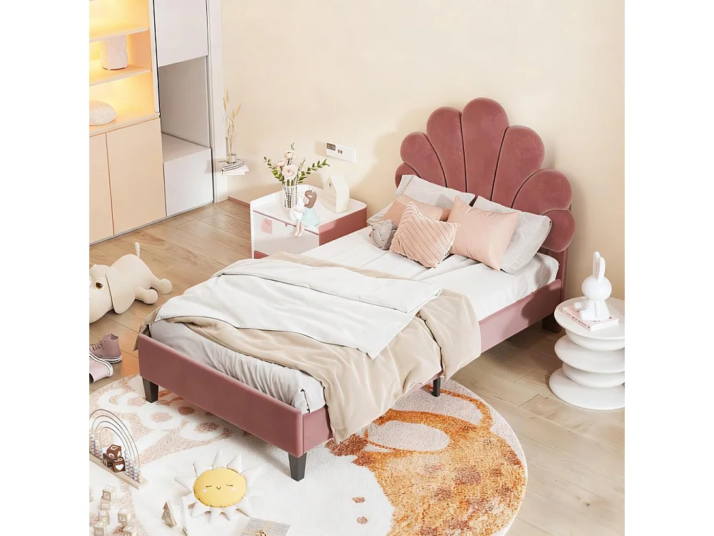 Lit enfant 90x200 cm avec sommier à lattes, lit capitonné en tissu velours 90x200 cm, lit de pétales 90x200 cm - rouge