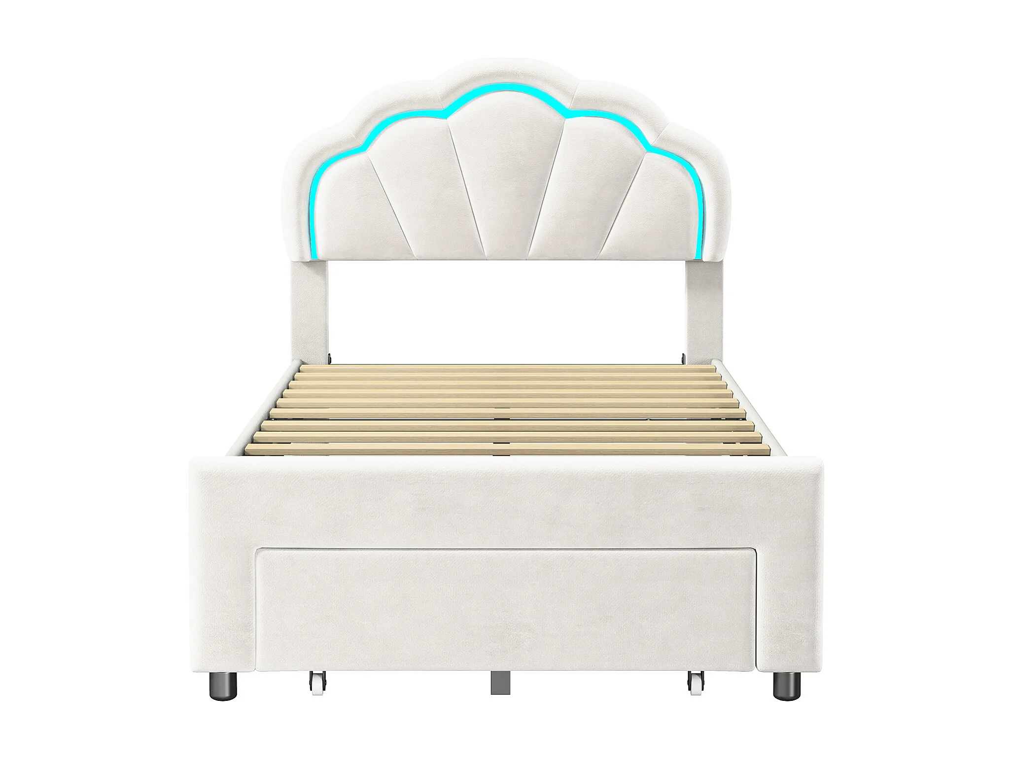 Lit enfant 90x200 cm - avec tête de lit fleurie et LED - un tiroir au pied du lit - lit princesse - velours - blanc