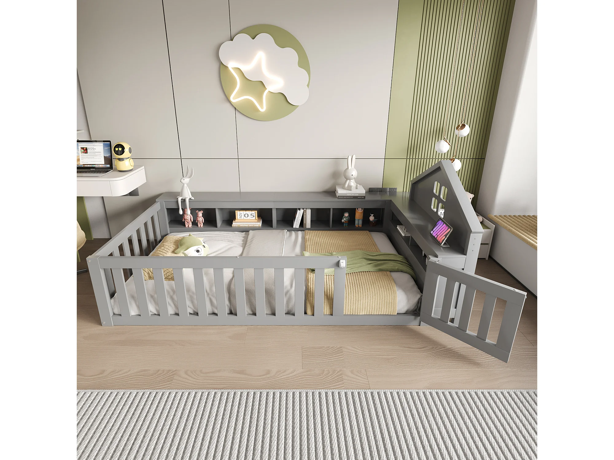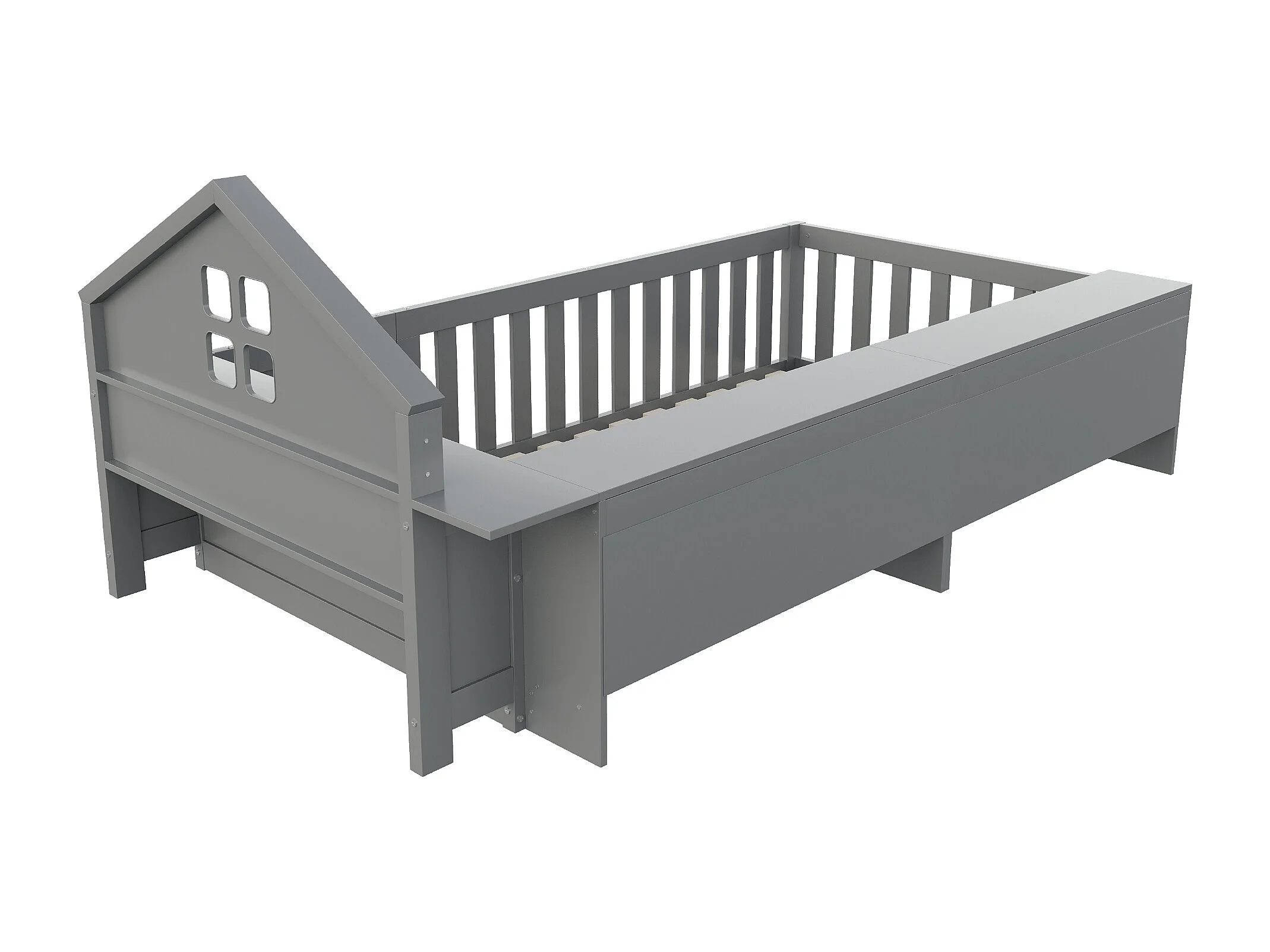 Lit enfant 90x200 cm avec toit et fenêtre, rangement intégré, barrière et porte, sécurité totale, bois massif, gris