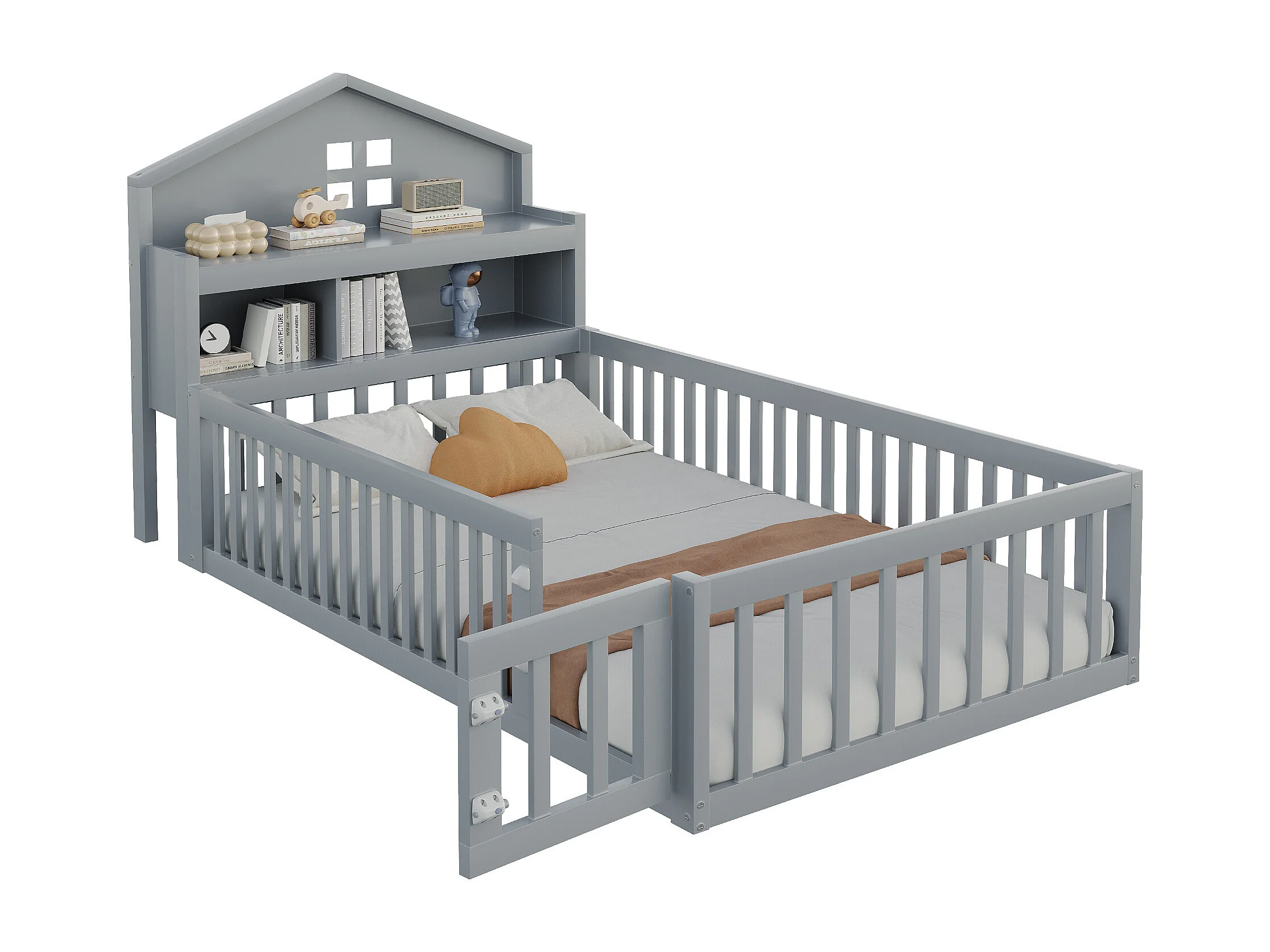 Lit enfant 90x200 cm en bois massif, structure maison avec étagères, rangement, barrière et porte, gris