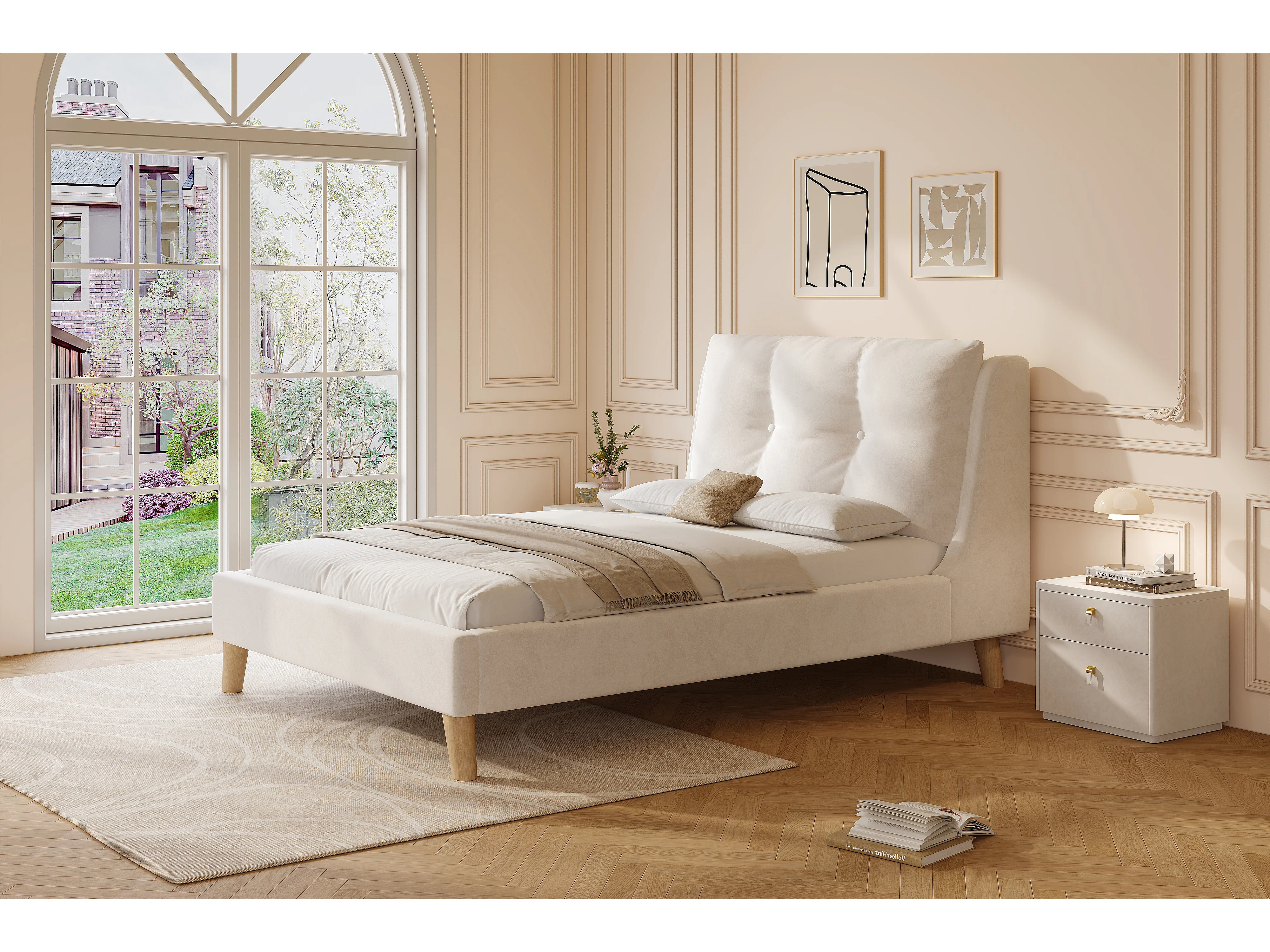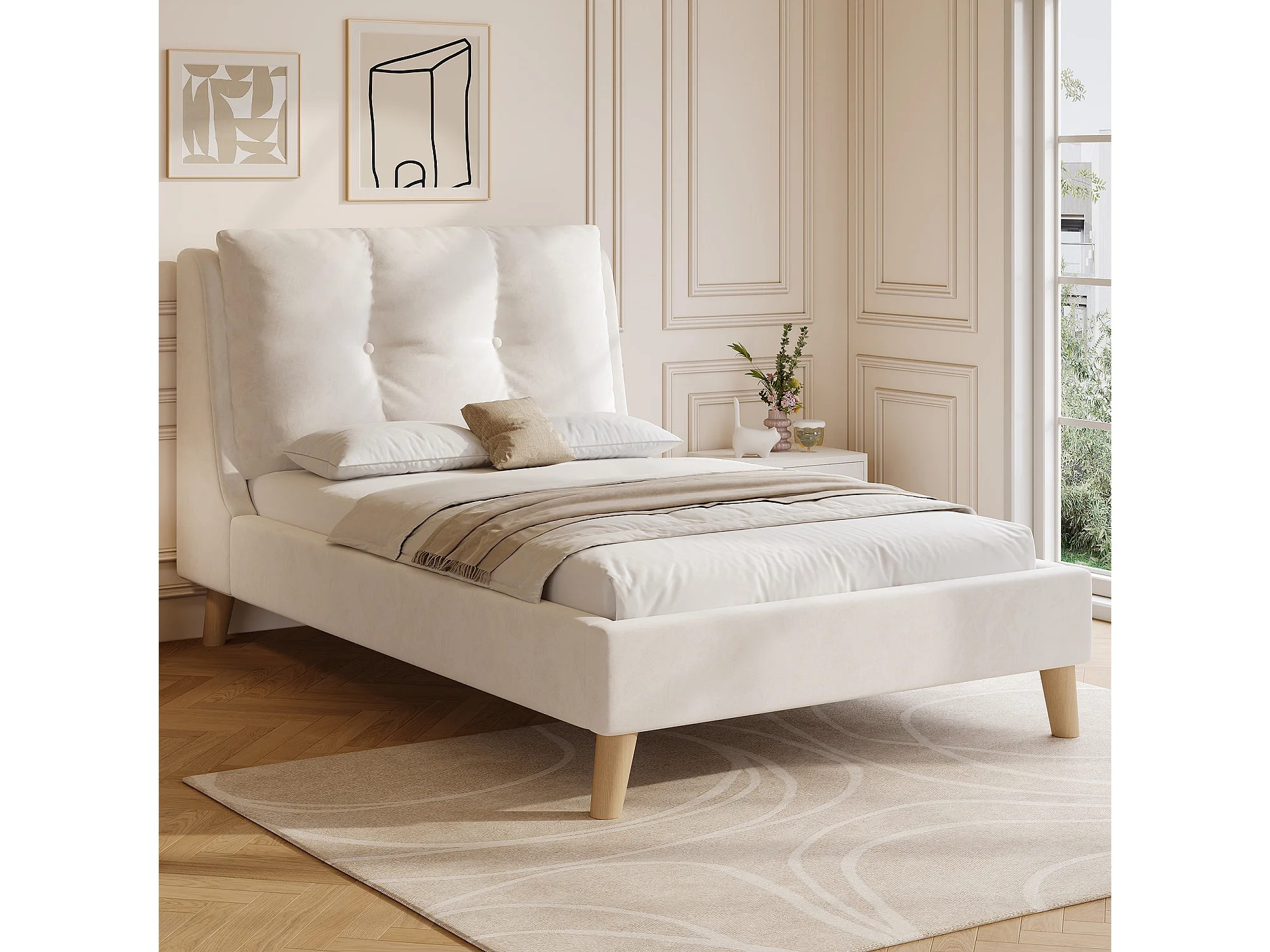 Lit enfant 90x200 cm en velours beige avec tête de lit douce - Pieds en bois