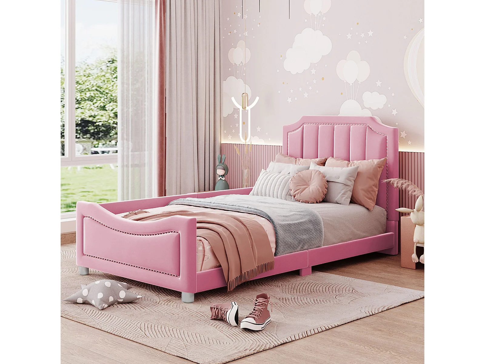Lit enfant 90x200 cm en velours rose, lit banquette multifonction avec dossier et accoudoirs, lit parent-enfant, ado