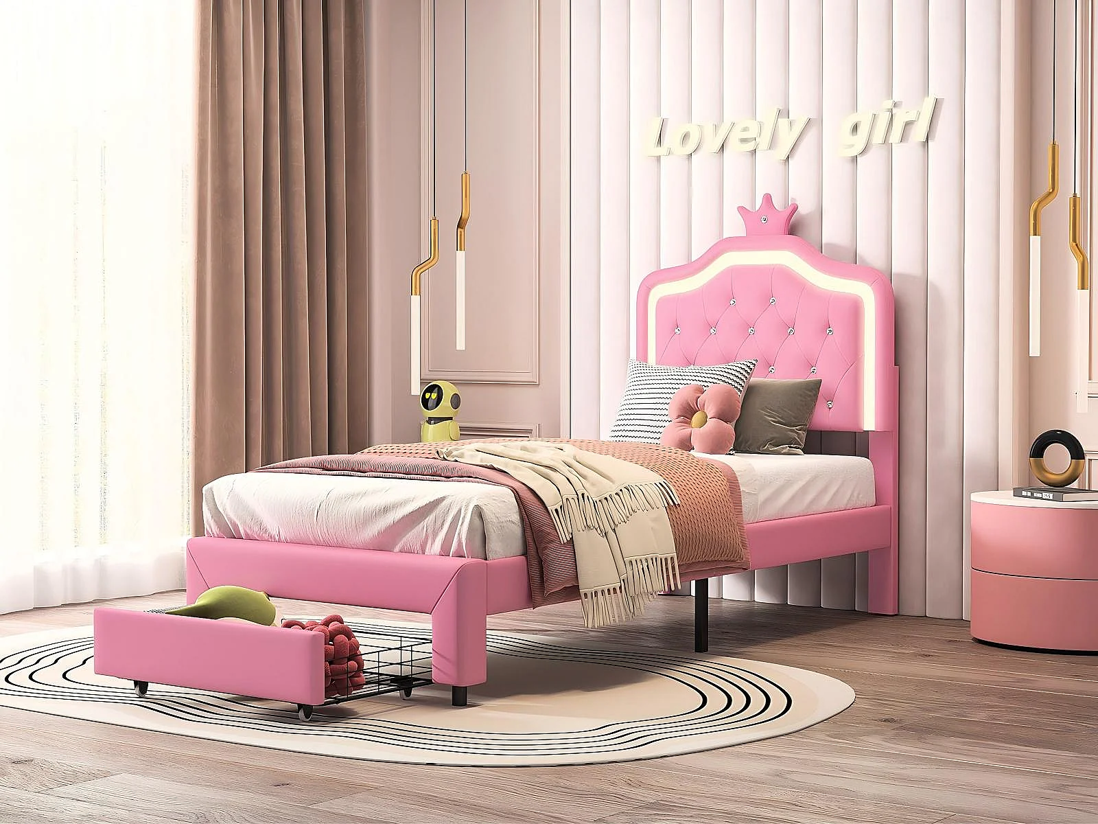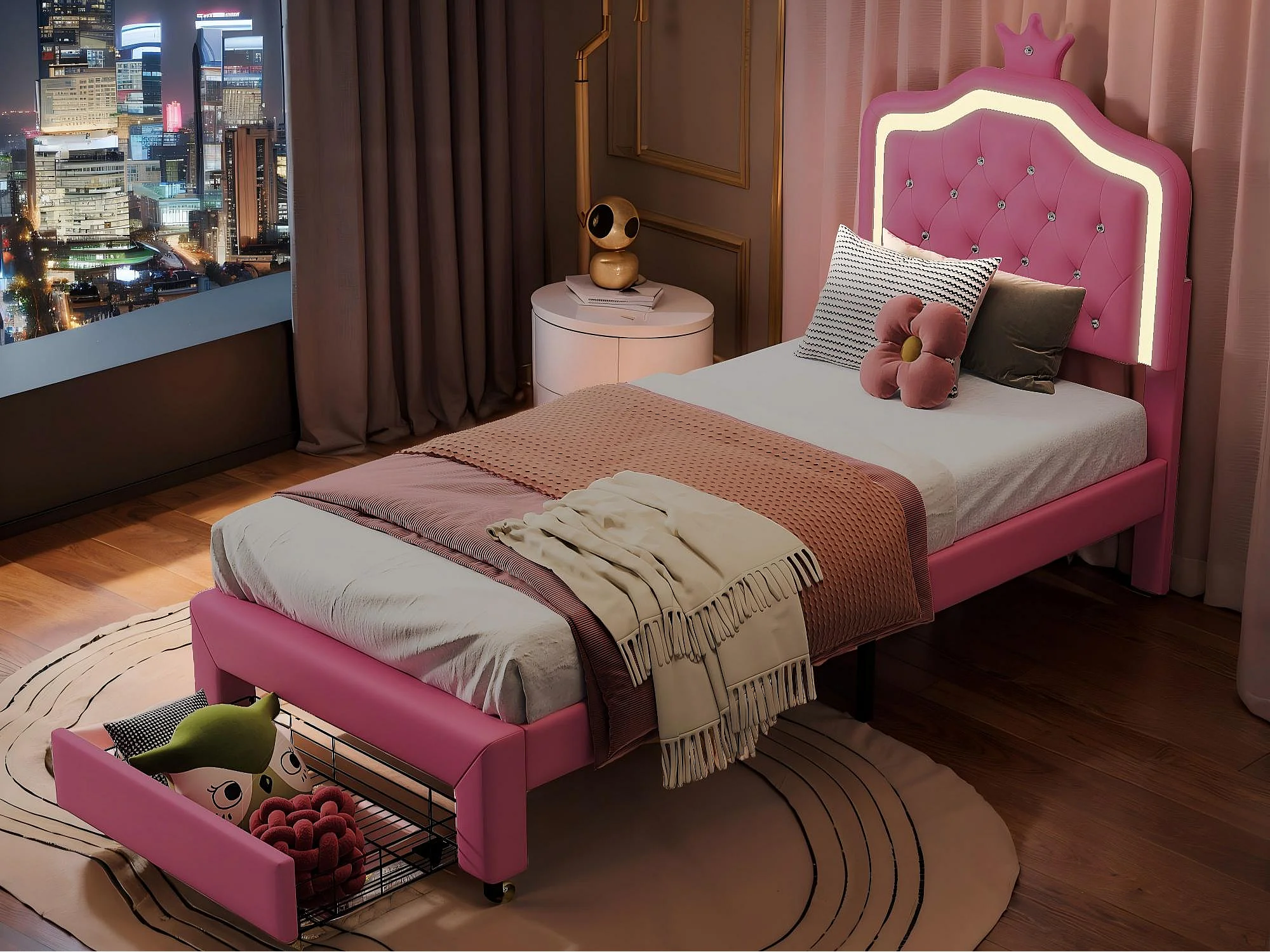 Lit Enfant 90x200 cm LED RGB, Lit Princesse Rose avec Rangement