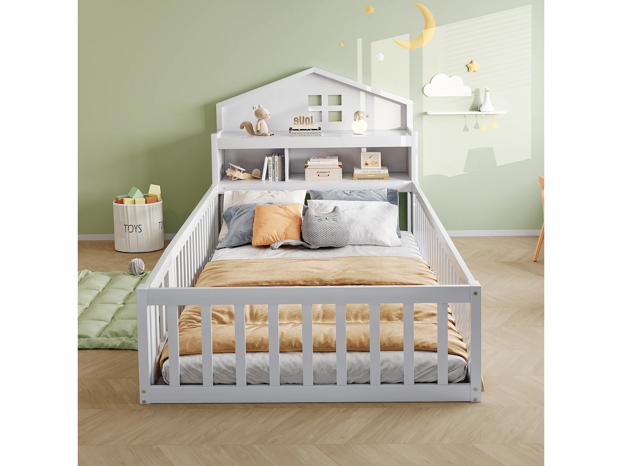 Lit enfant 90x200 cm Lit ado avec étagère de rangement et sommier à lattes en bois - blanc (sans matelas)