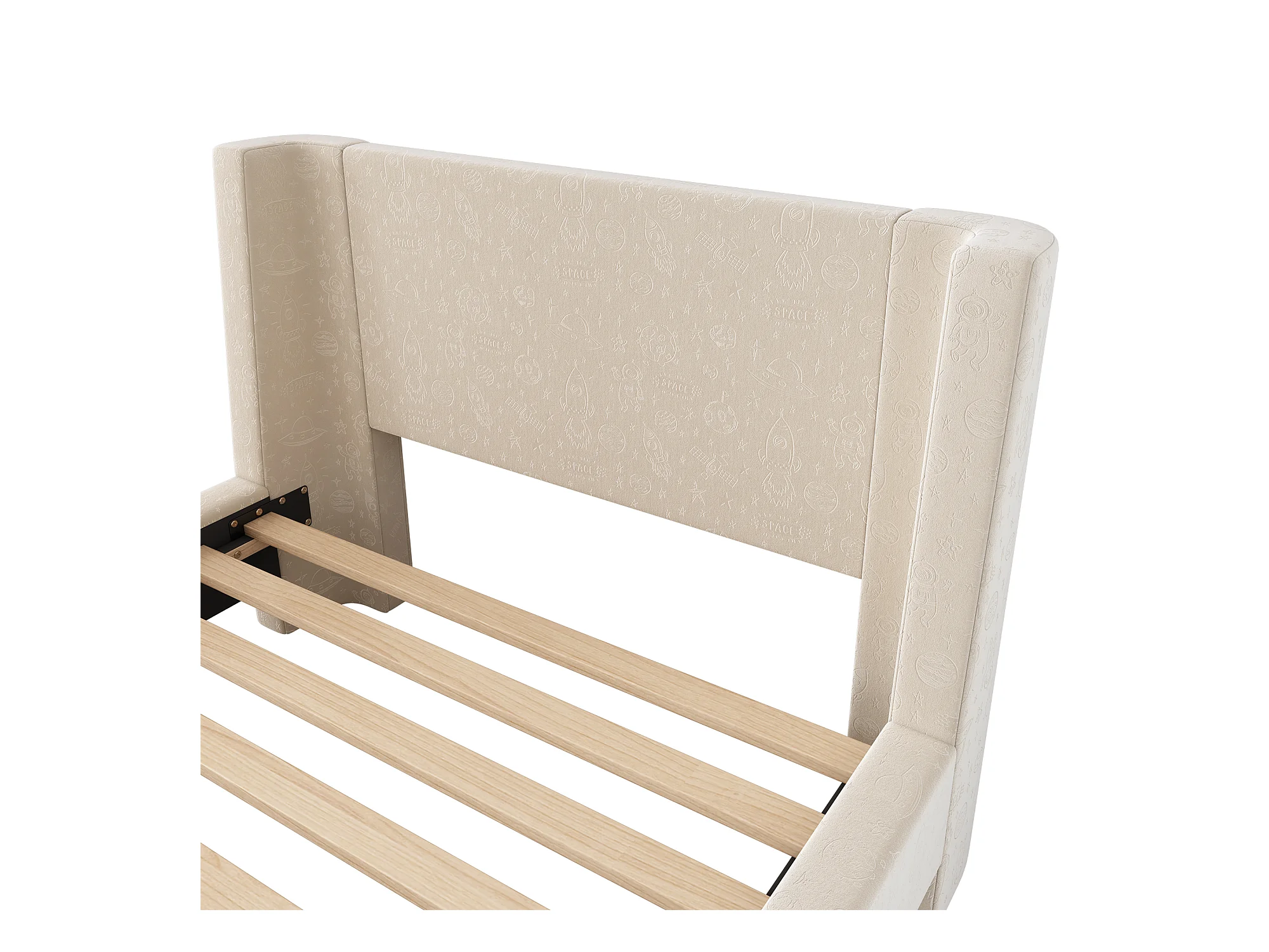 Lit enfant 90x200 cm - Lit ado avec sommier à lattes en bois - Imprimé dessin animé - velours beige