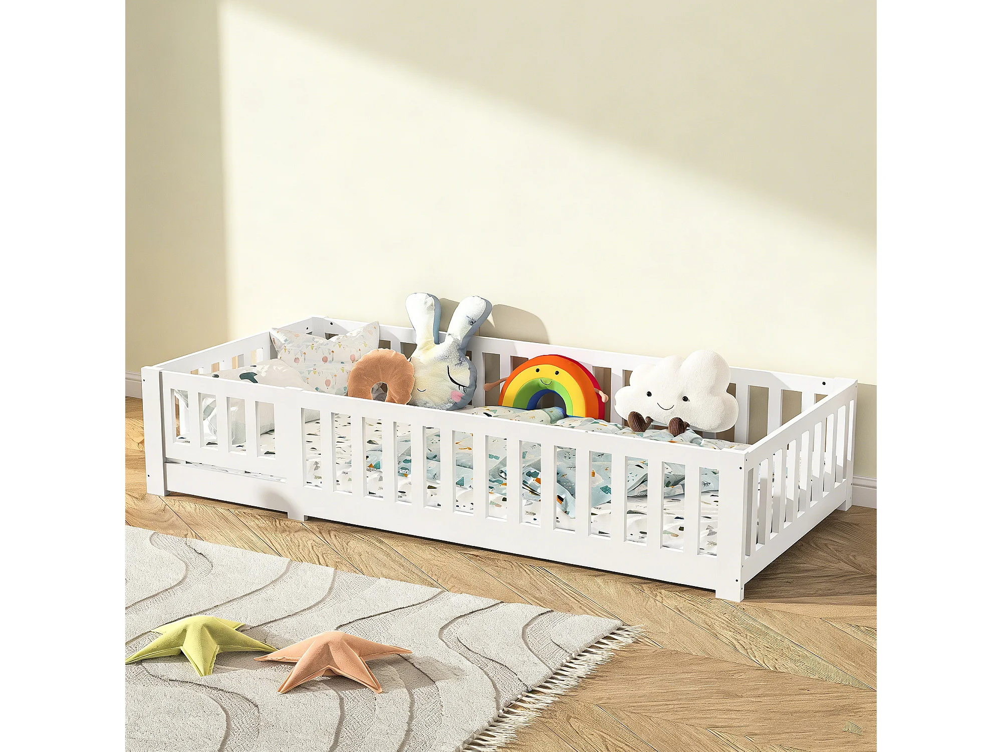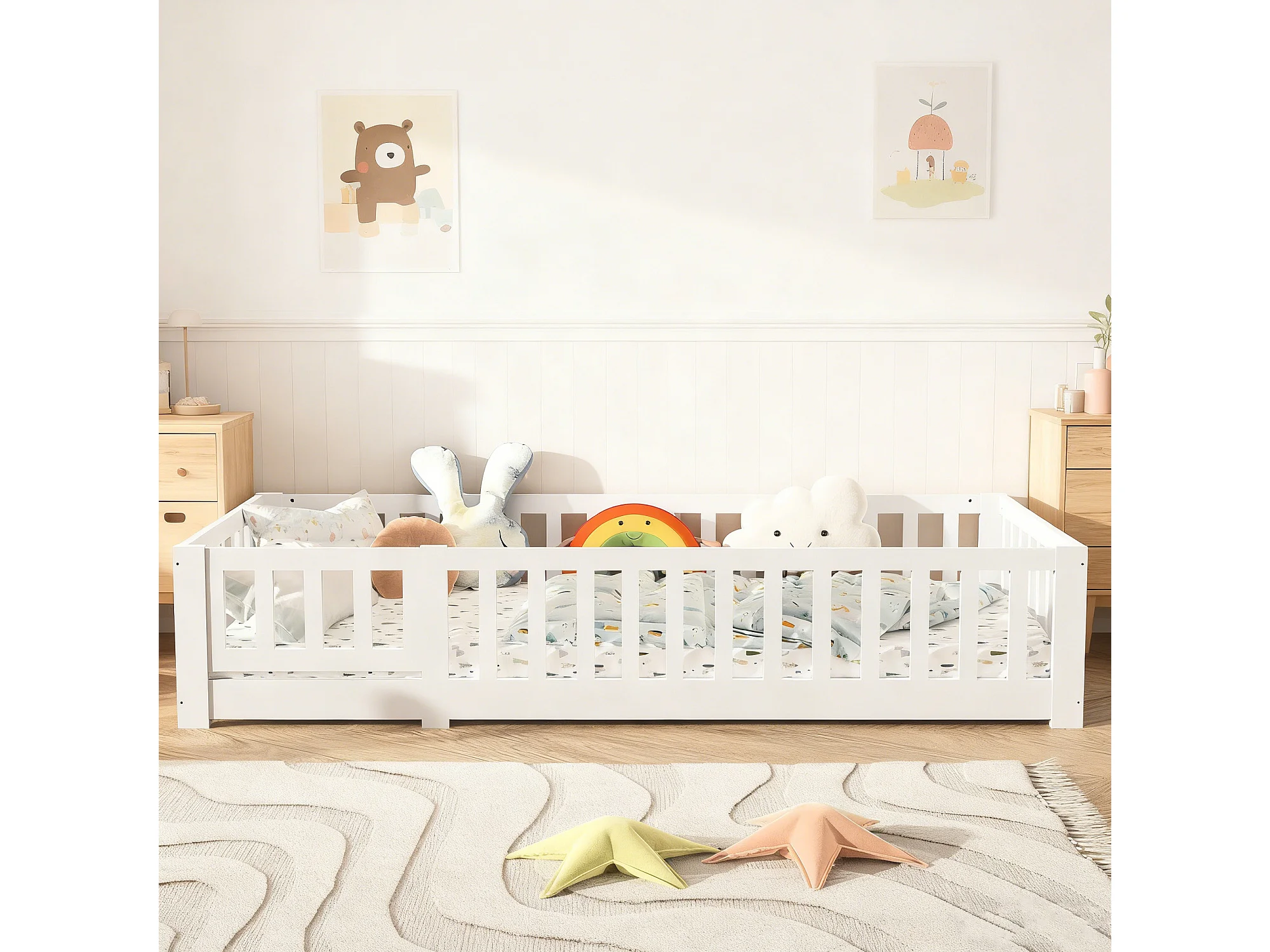 Lit enfant 90x200 cm, lit au sol en bois de pin, barrière de sécurité avec serrure, avec sommier à lattes, Blanc