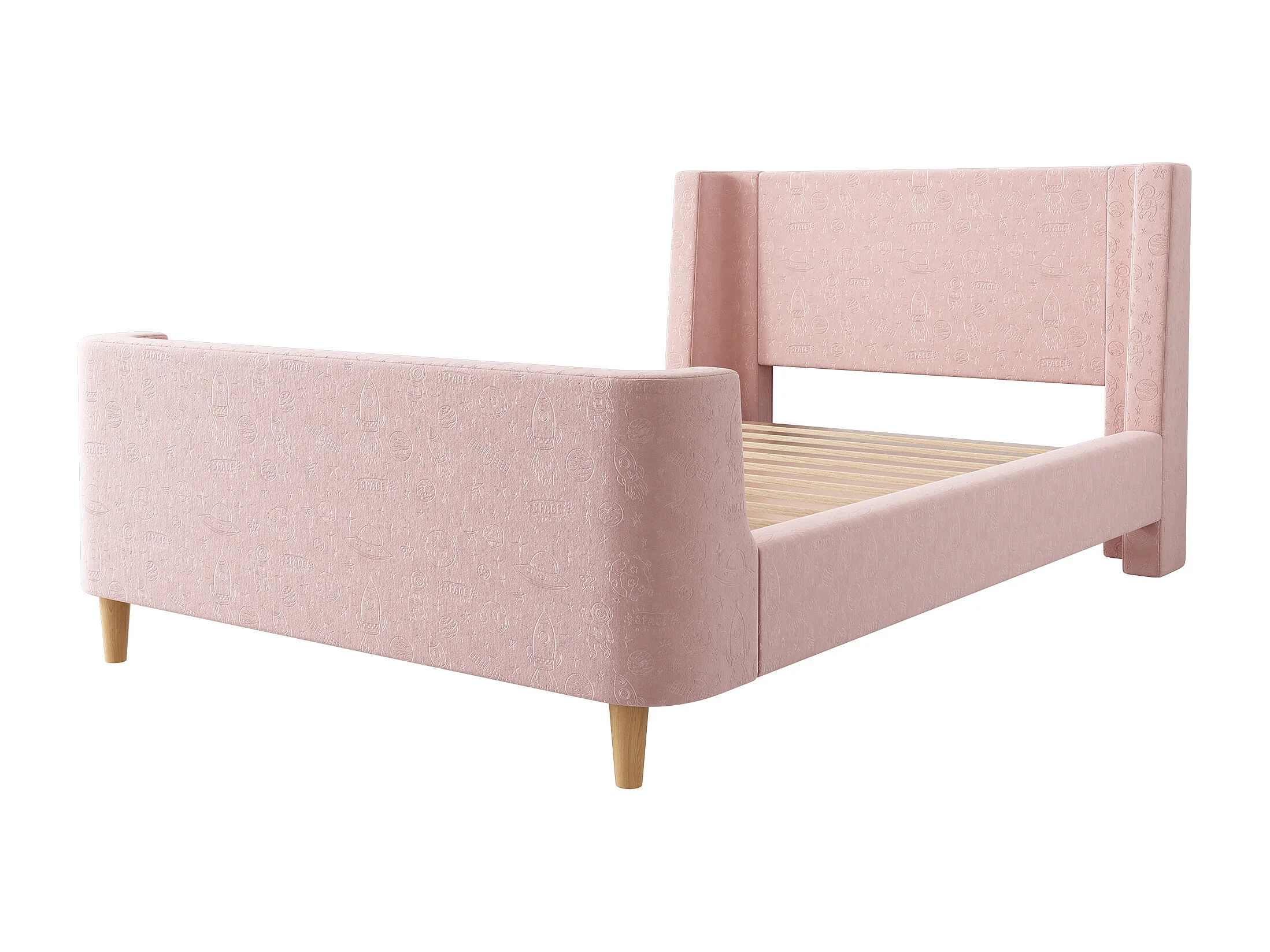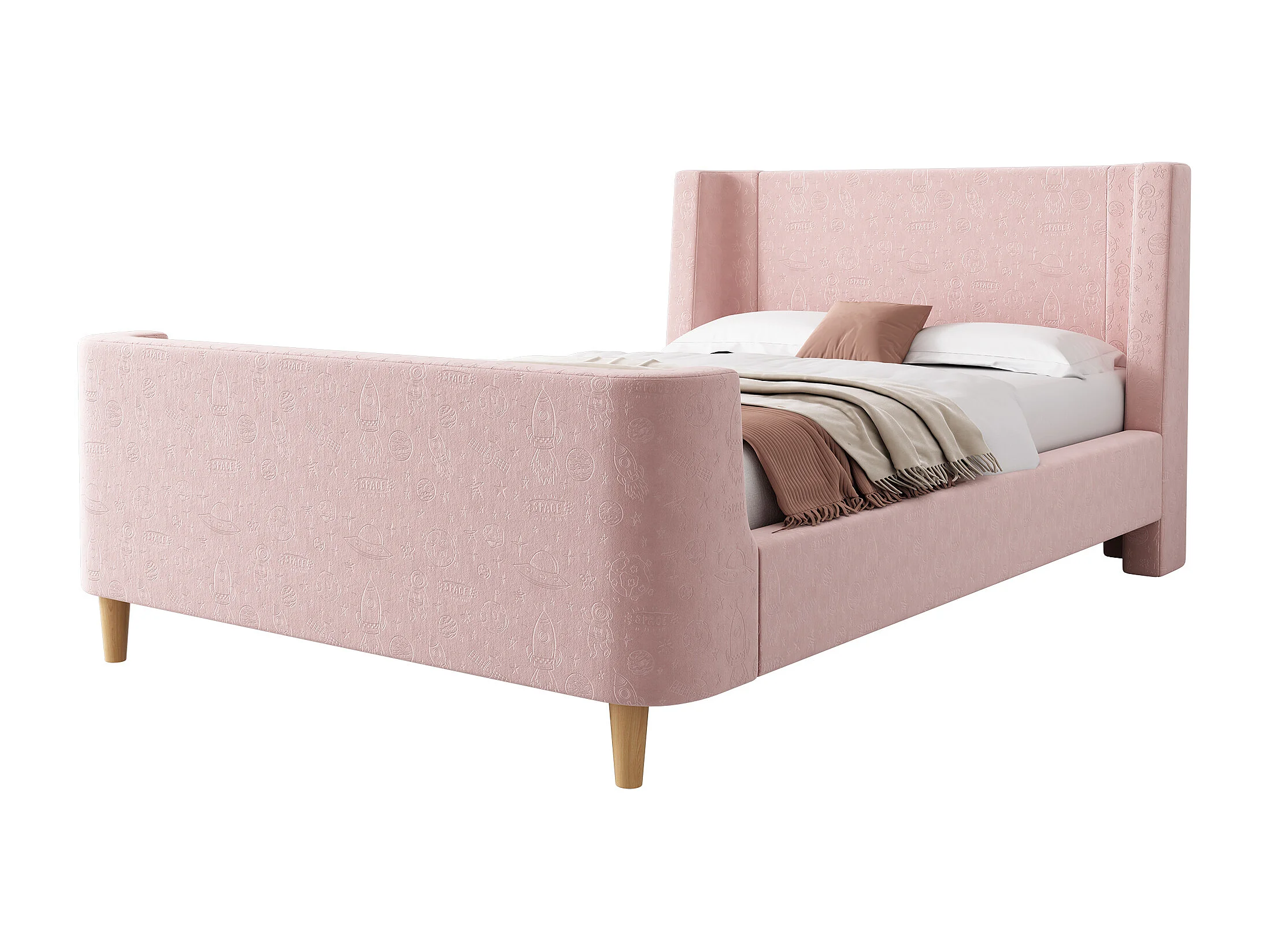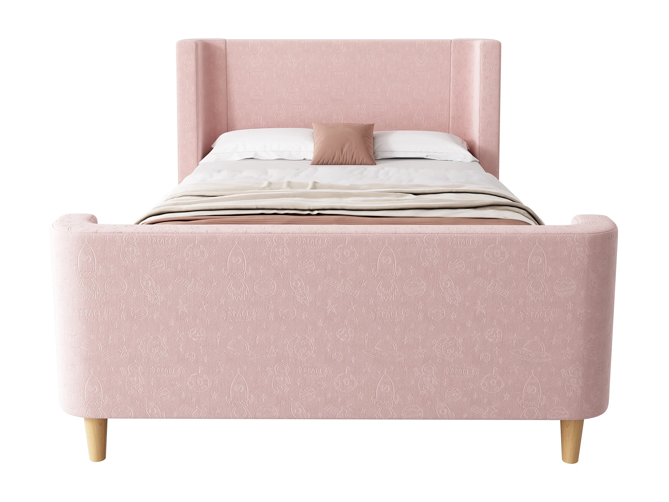 Lit enfant 90x200 cm - Lit simple lit avec sommier à lattes en bois - Imprimé dessin animé - velours rose