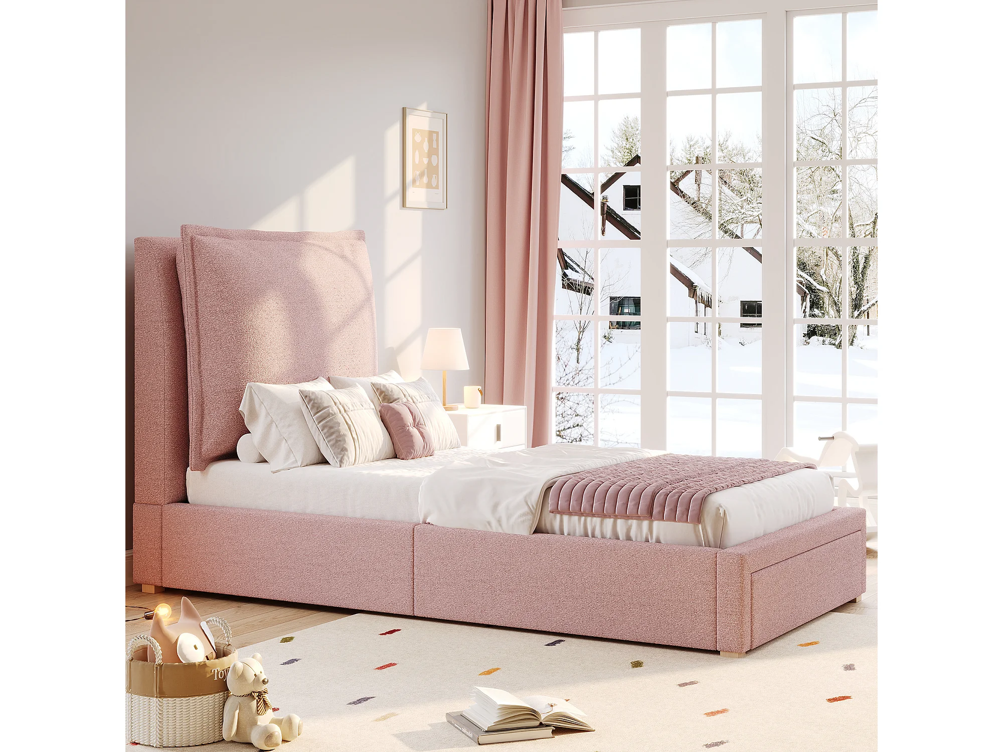 Lit enfant 90x200 cm, lit simple avec tête de lit rembourrée et sommier à lattes, 1 tiroir - chenille rose (sans matelas)