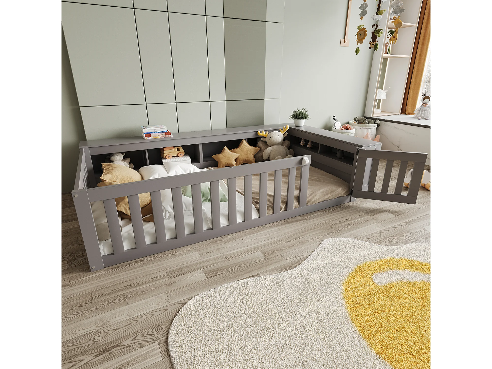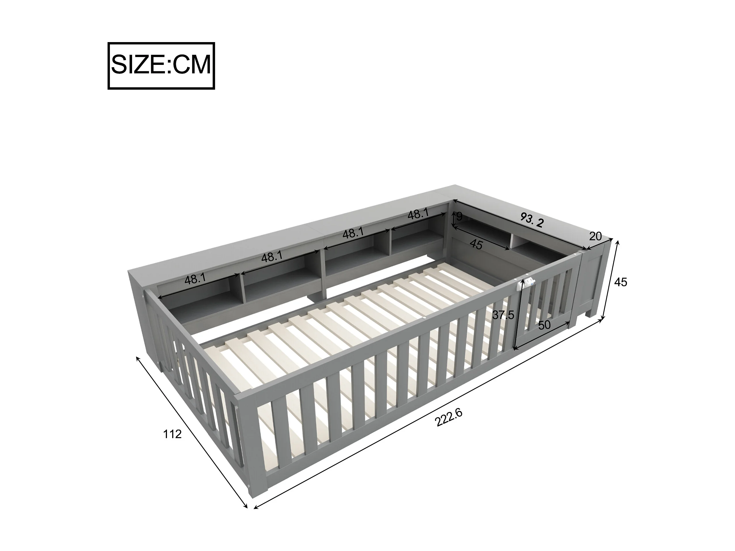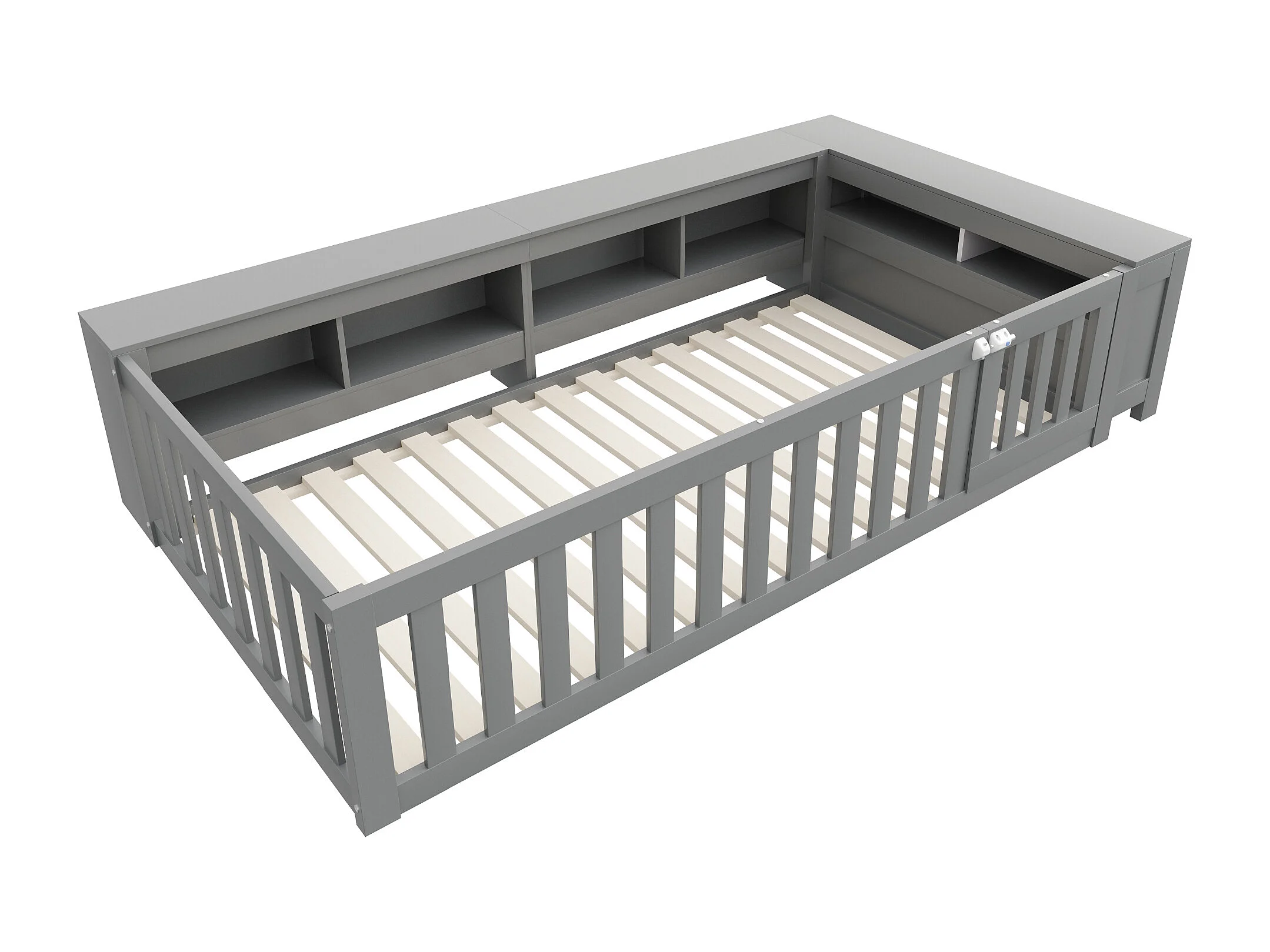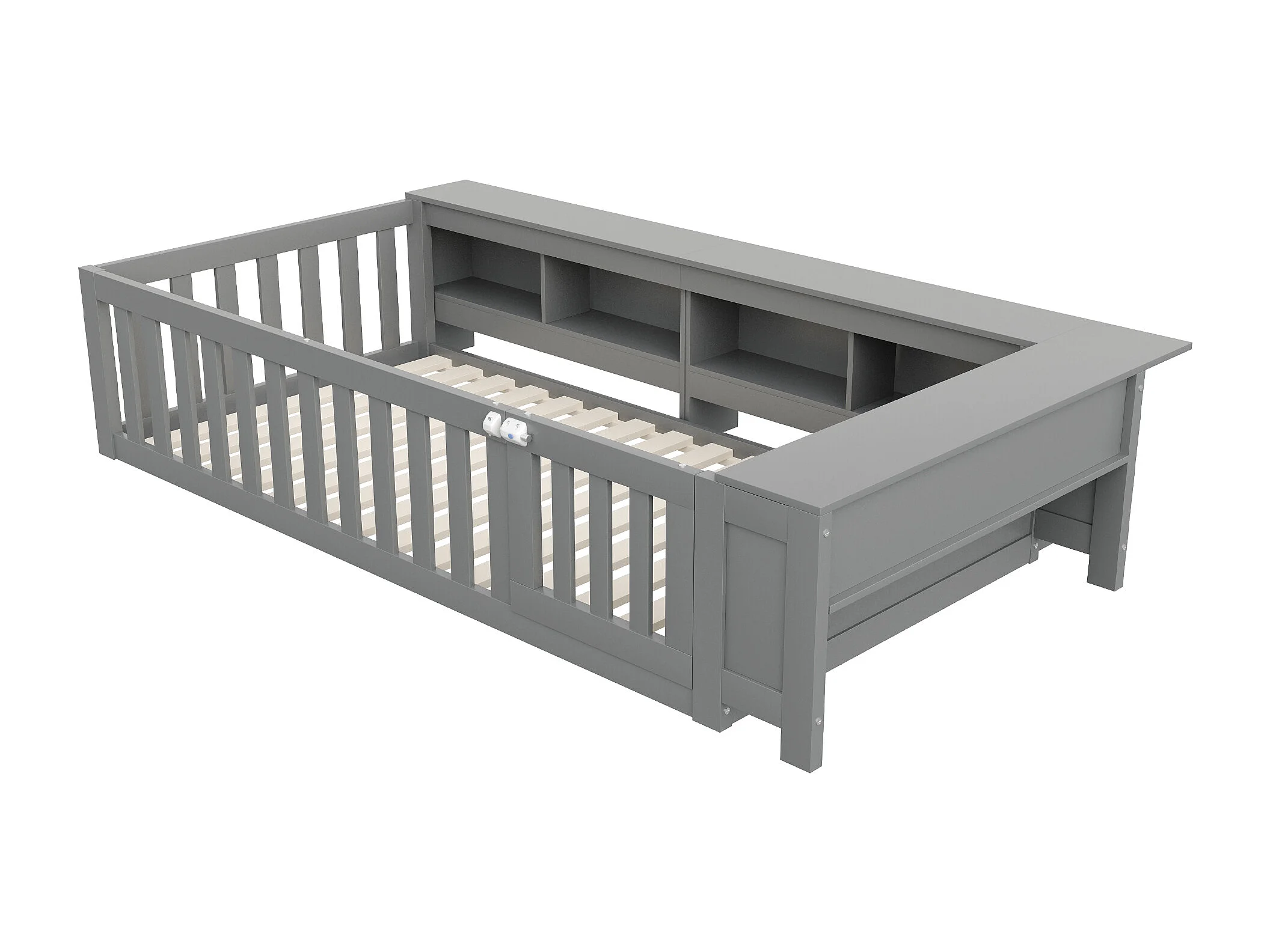 Lit enfant 90x200 cm multifonction, avec nombreux rangements, barrière et porte, sécurité totale, bois massif, gris