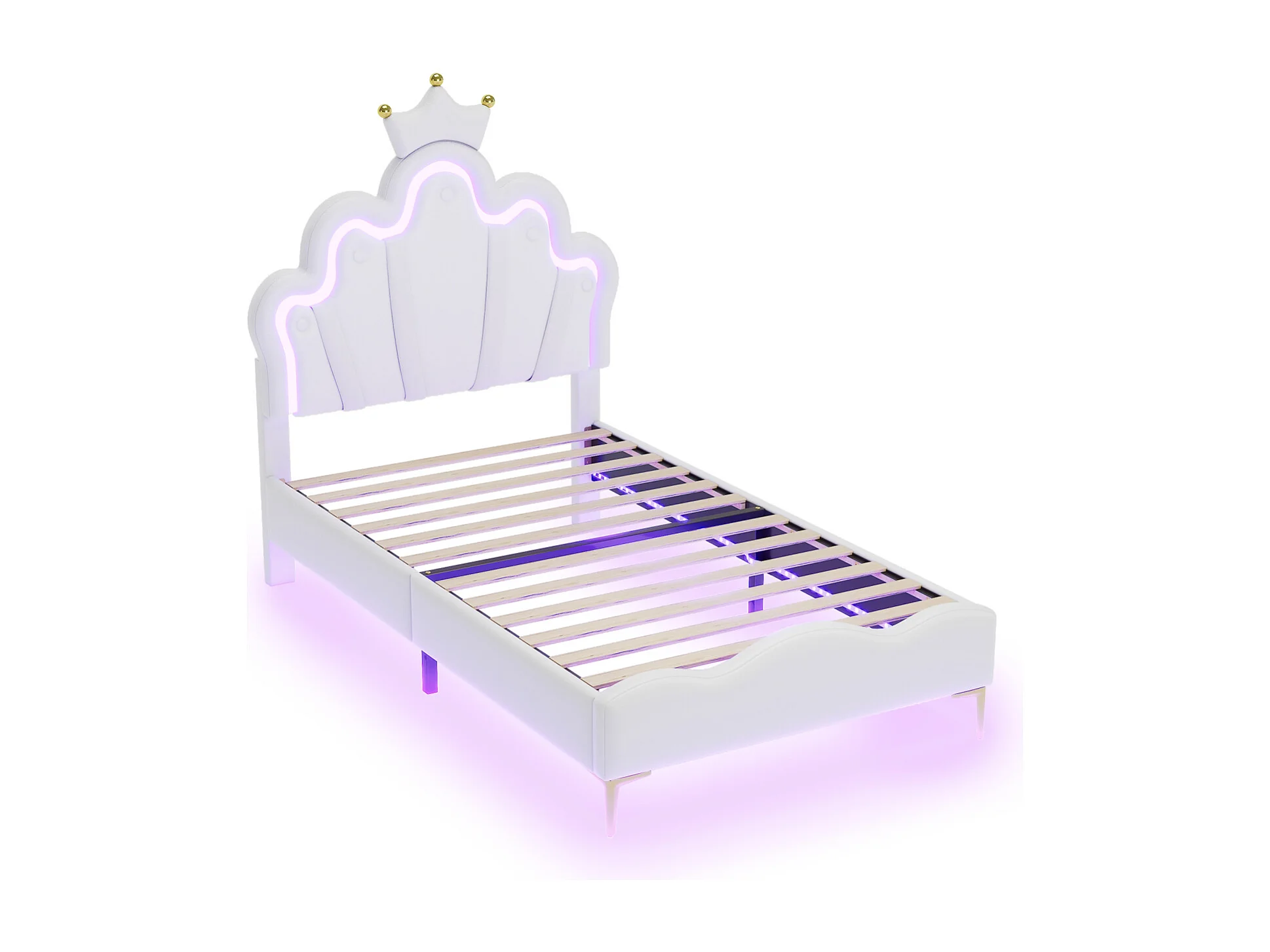 lit enfant 90x200,lit princesse en forme de couronne, lit rembourré simple avec sommier à lattes,LED réglable, PU,blanc