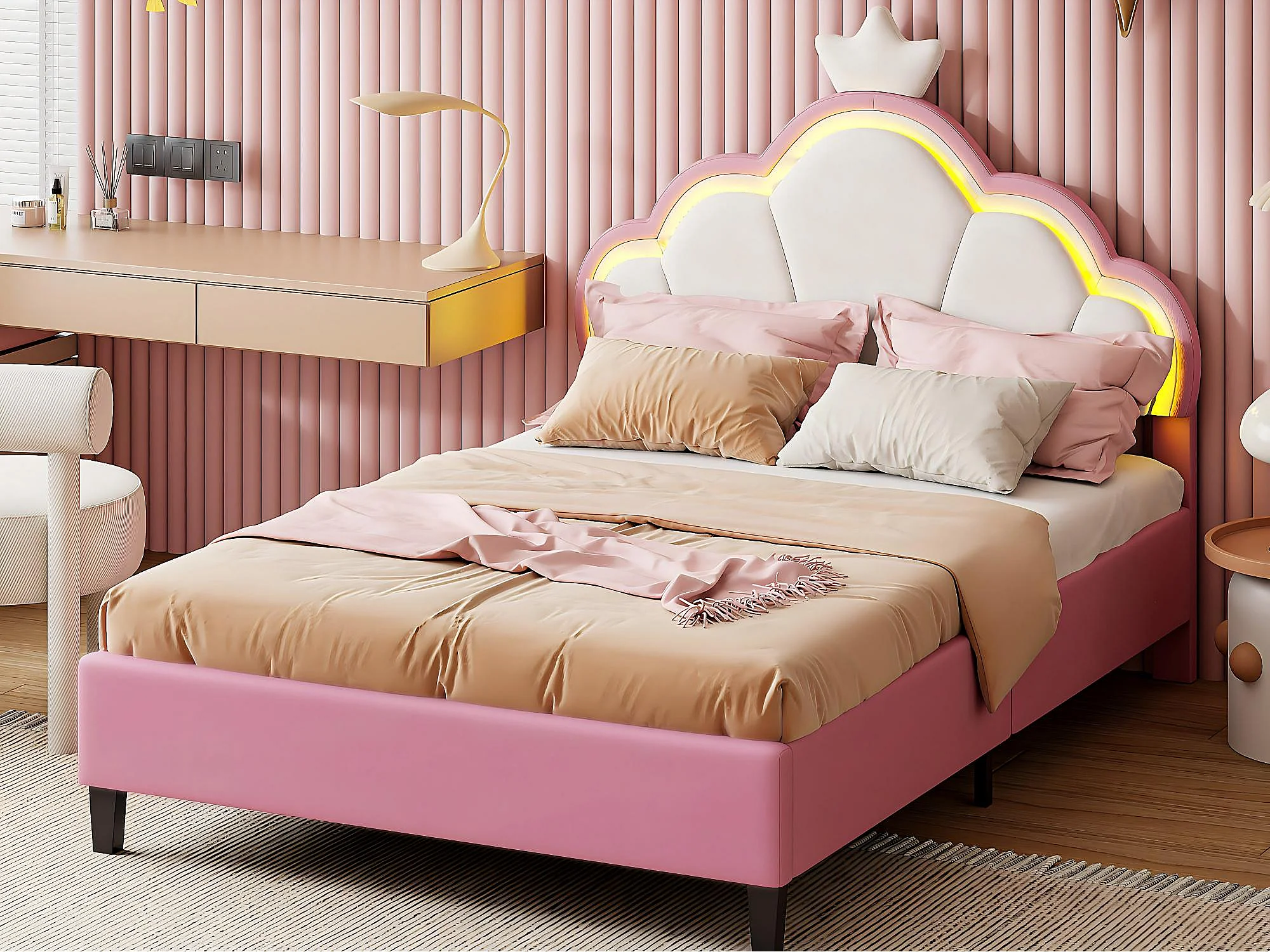 Lit enfant 90x200 rose avec LED, lit rembourré velours, tête de lit étoile, sommier à lattes