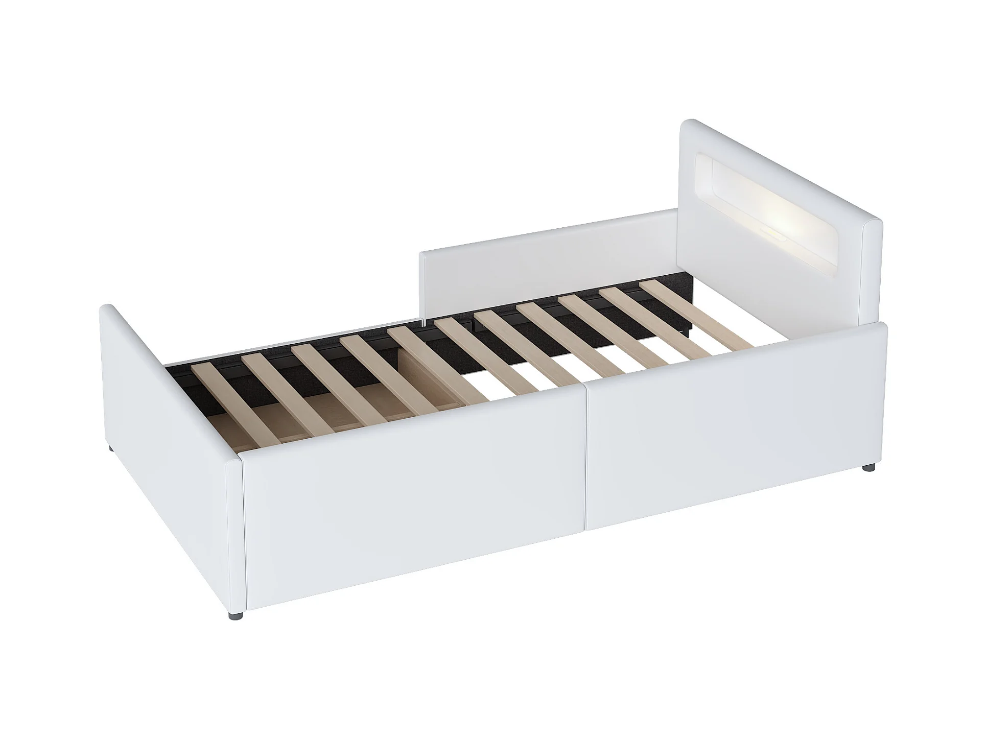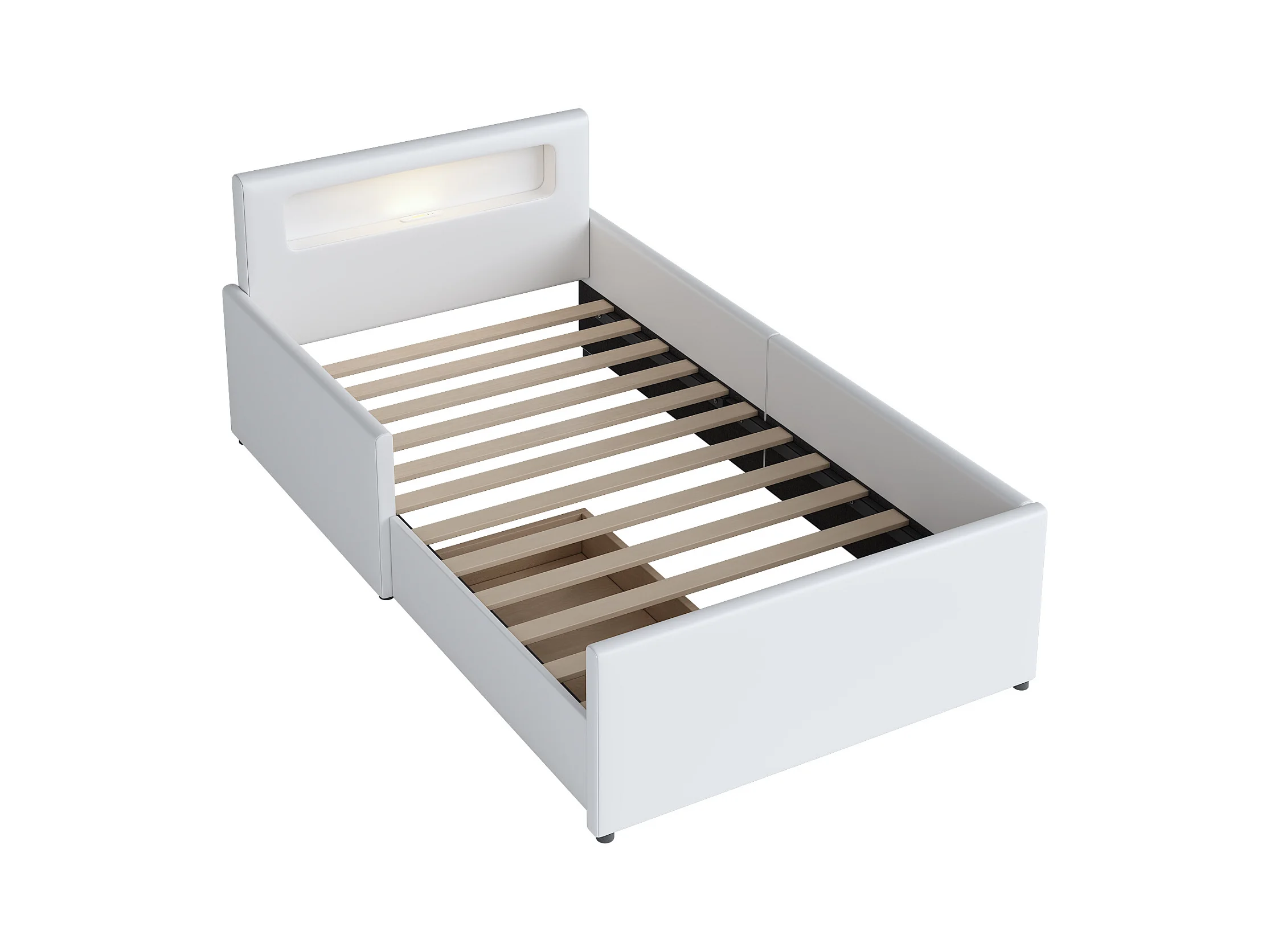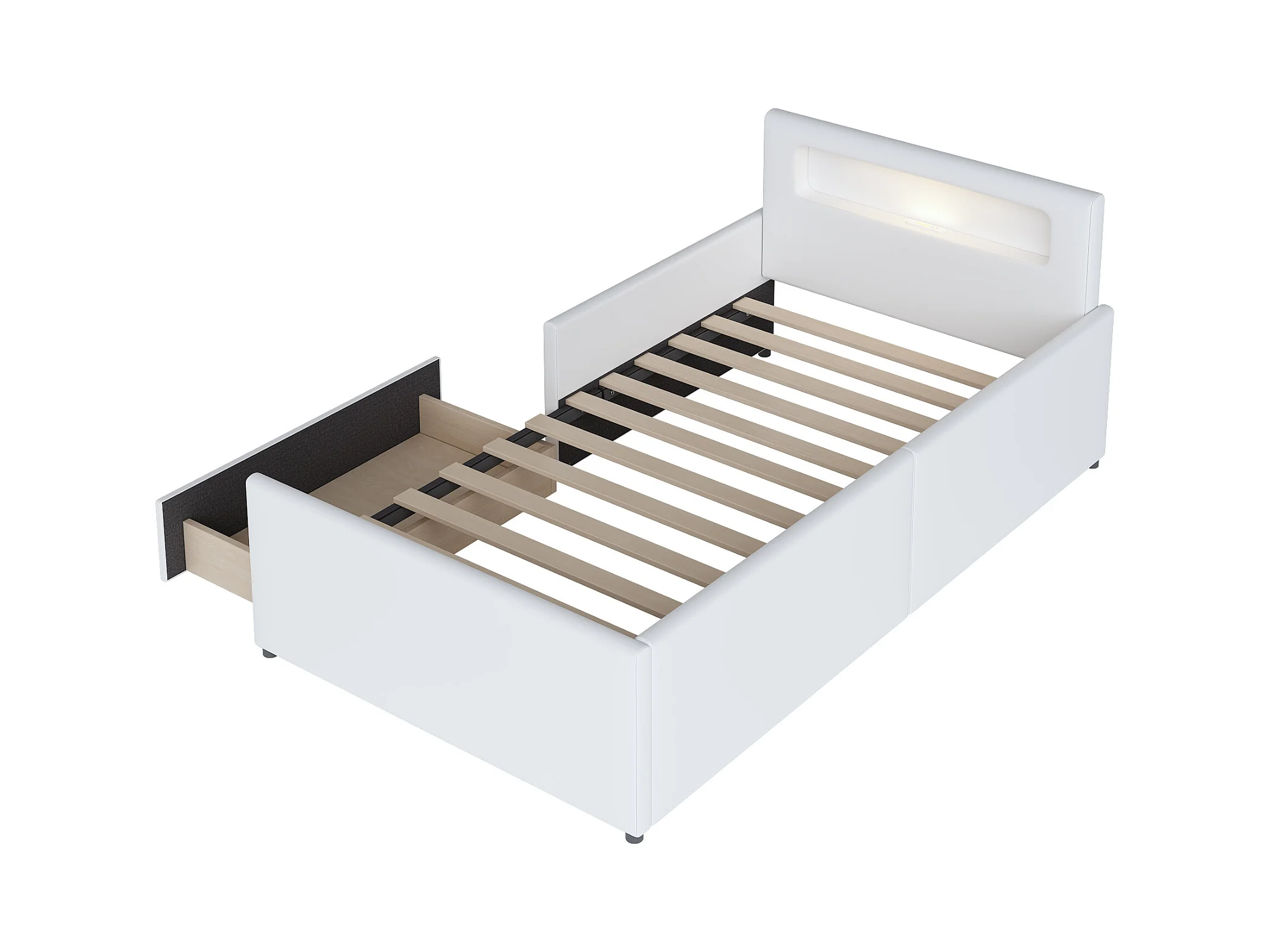 Lit enfant 90x200cm avec liseuse et port USB, tiroir de rangement, bords de sécurité, Similicuir blanc, sans matelas
