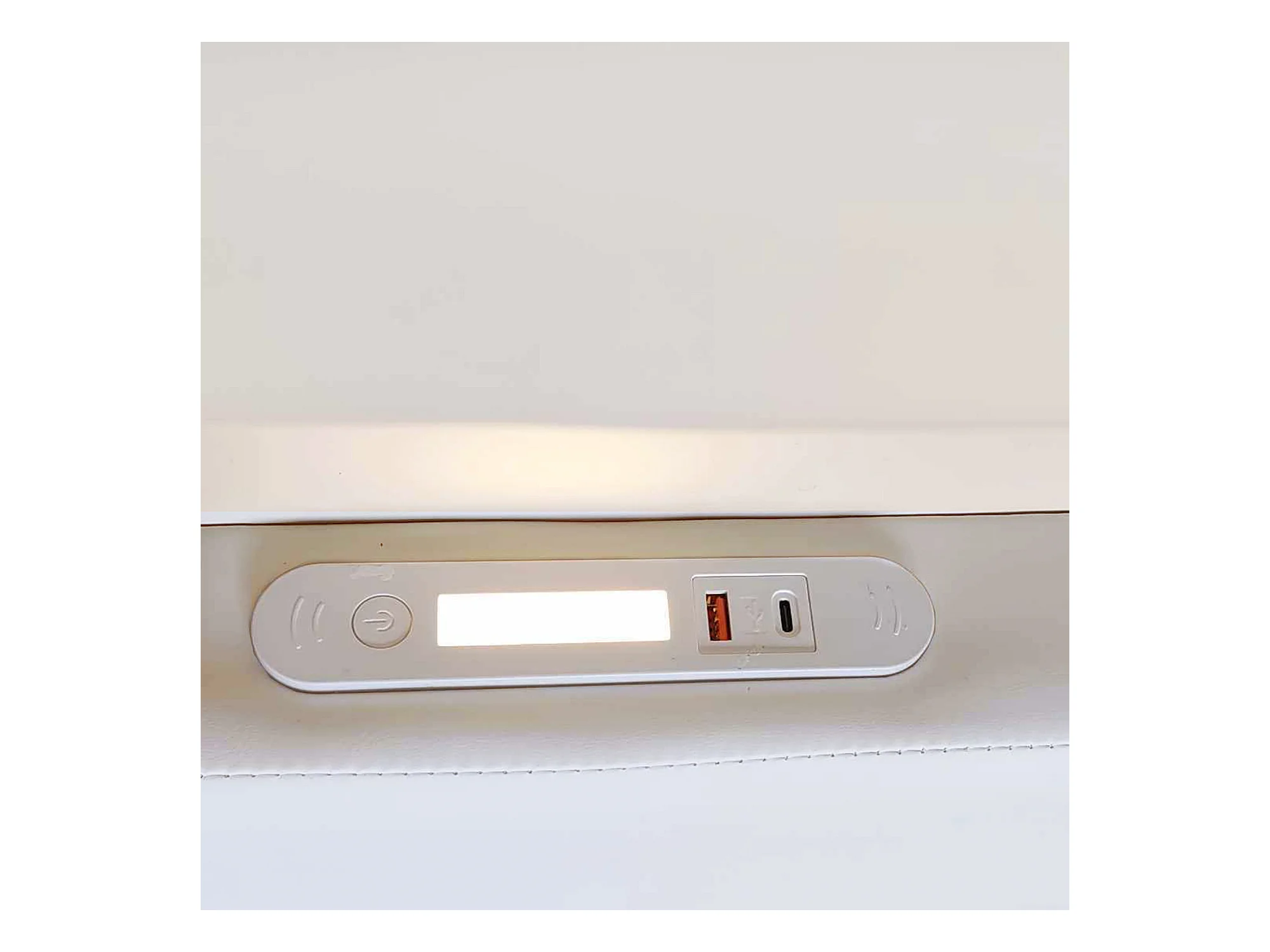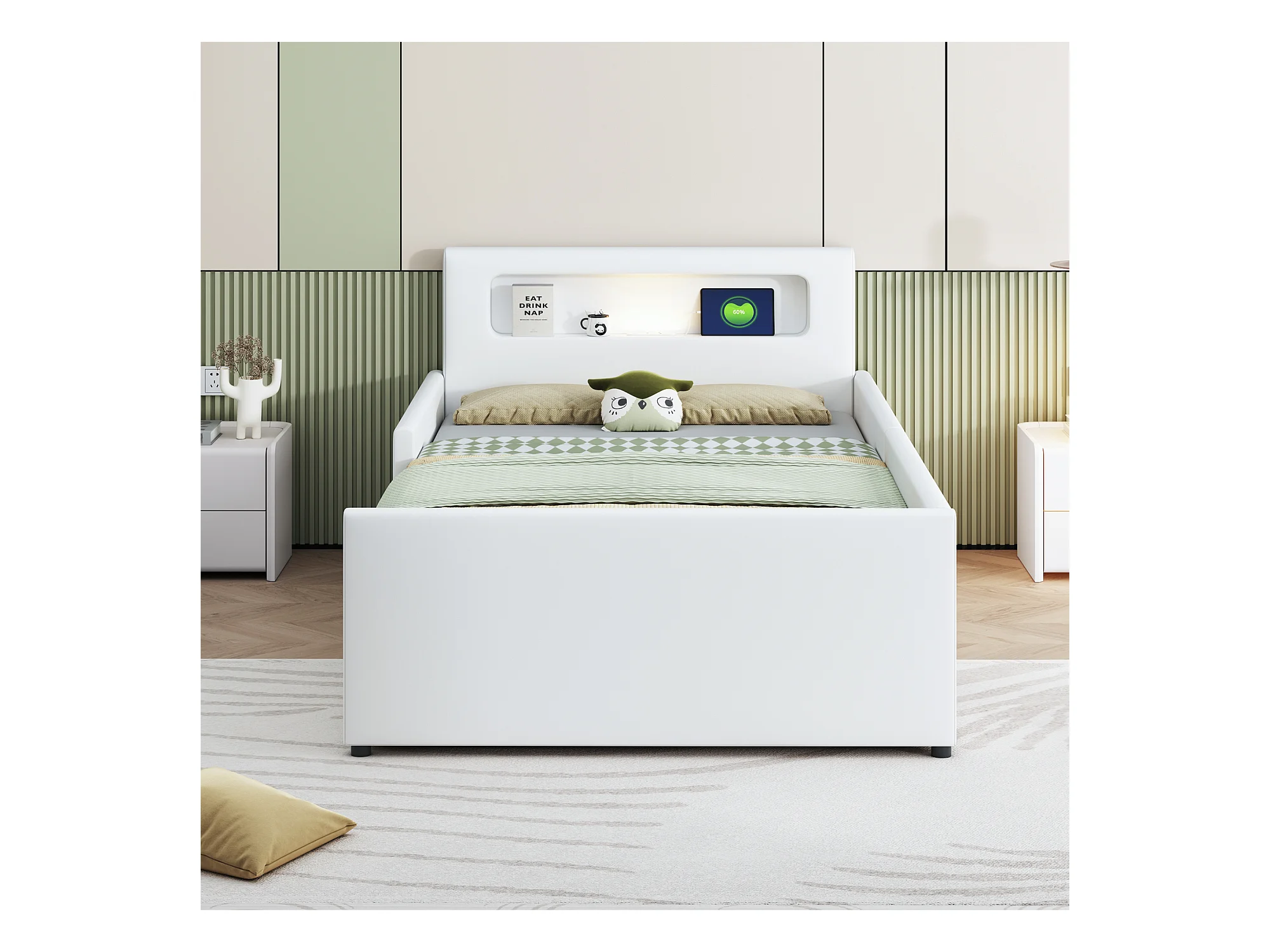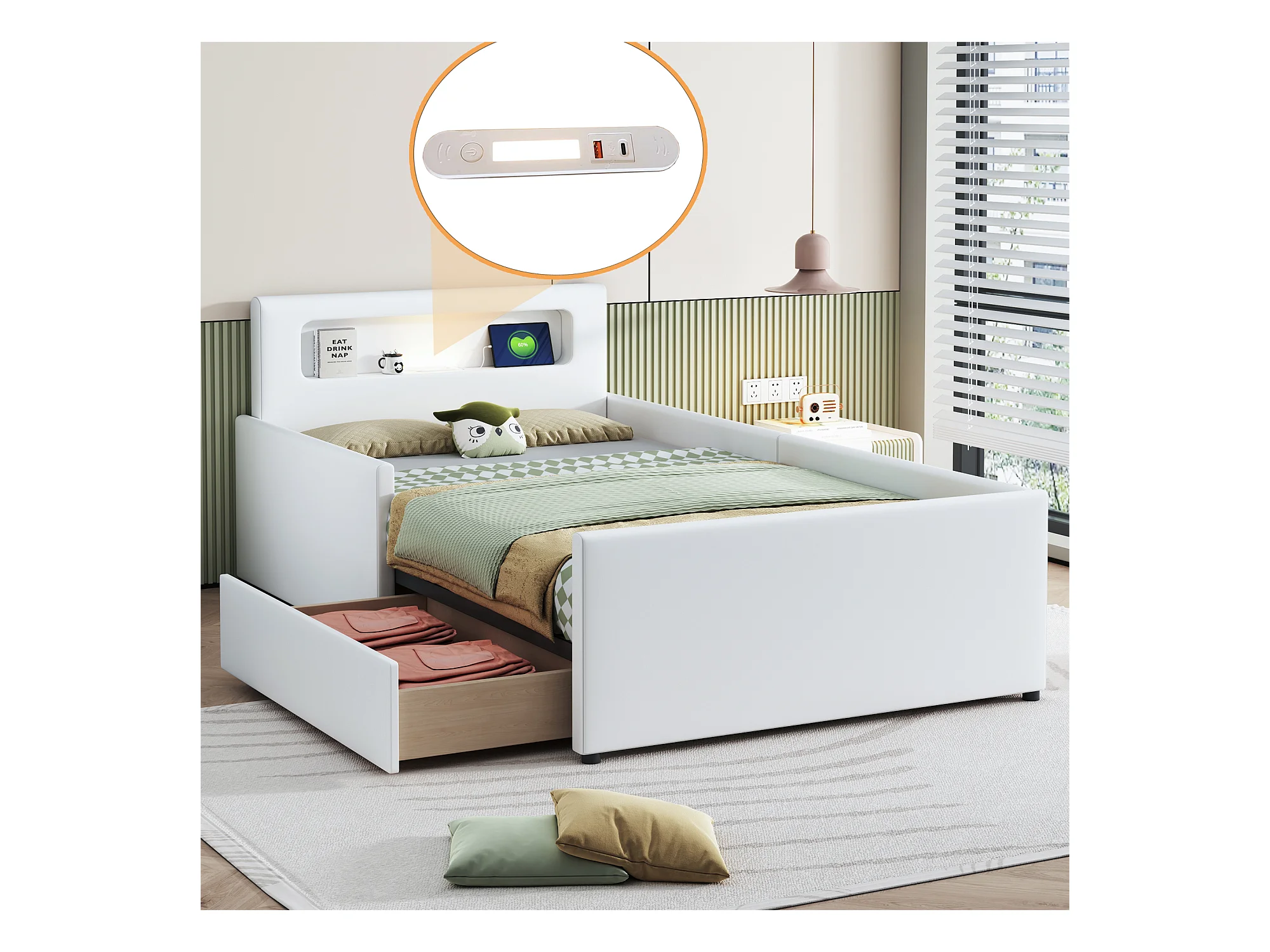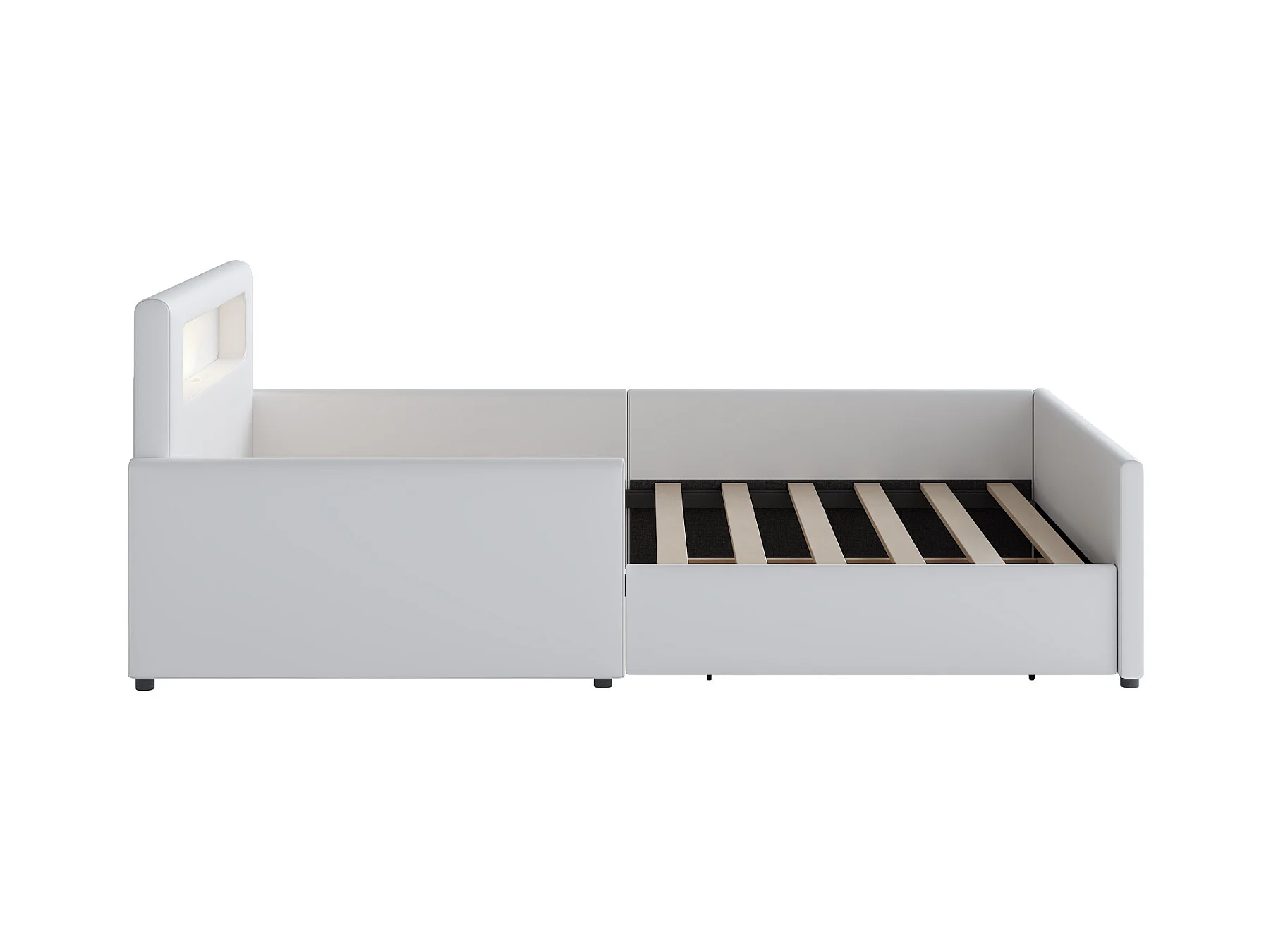 Lit enfant 90x200cm avec liseuse et port USB, tiroir de rangement, bords de sécurité, Similicuir blanc, sans matelas