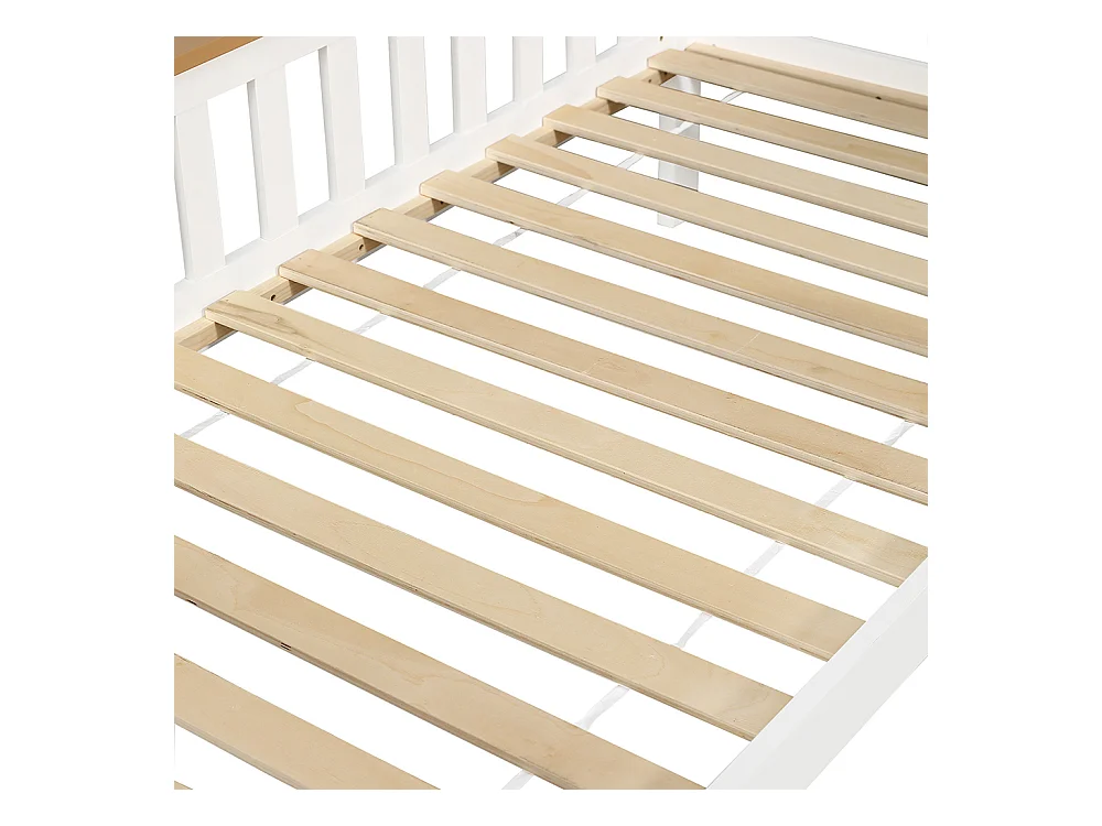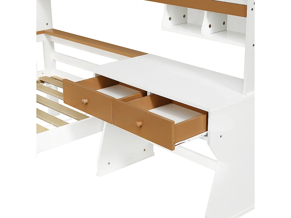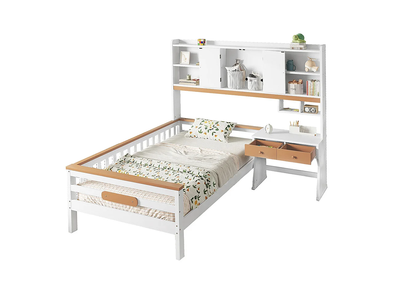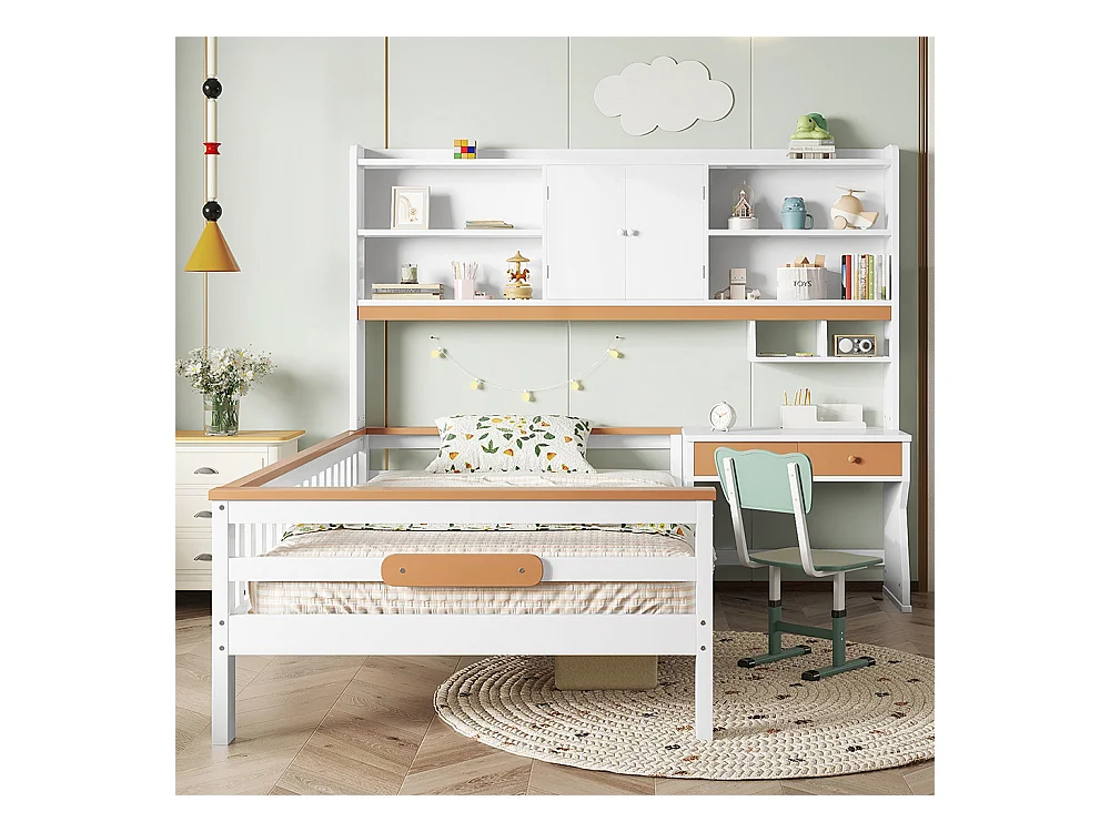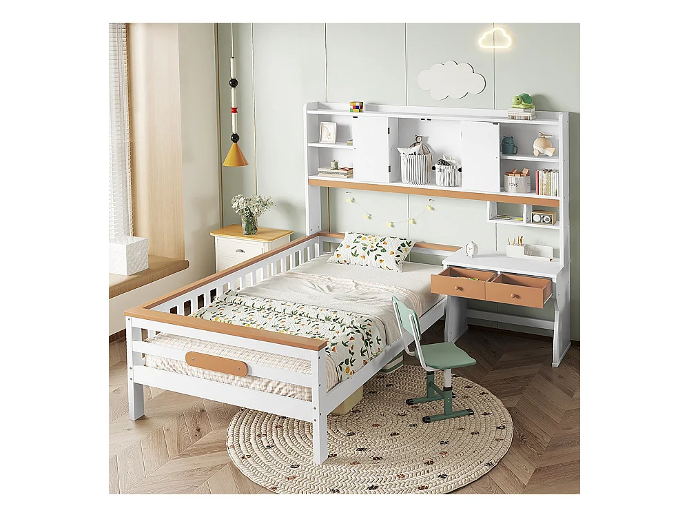 Lit enfant 90x200cm, avec placard de rangement, avec table et tiroirs, avec planche de protection et sommier à lattes