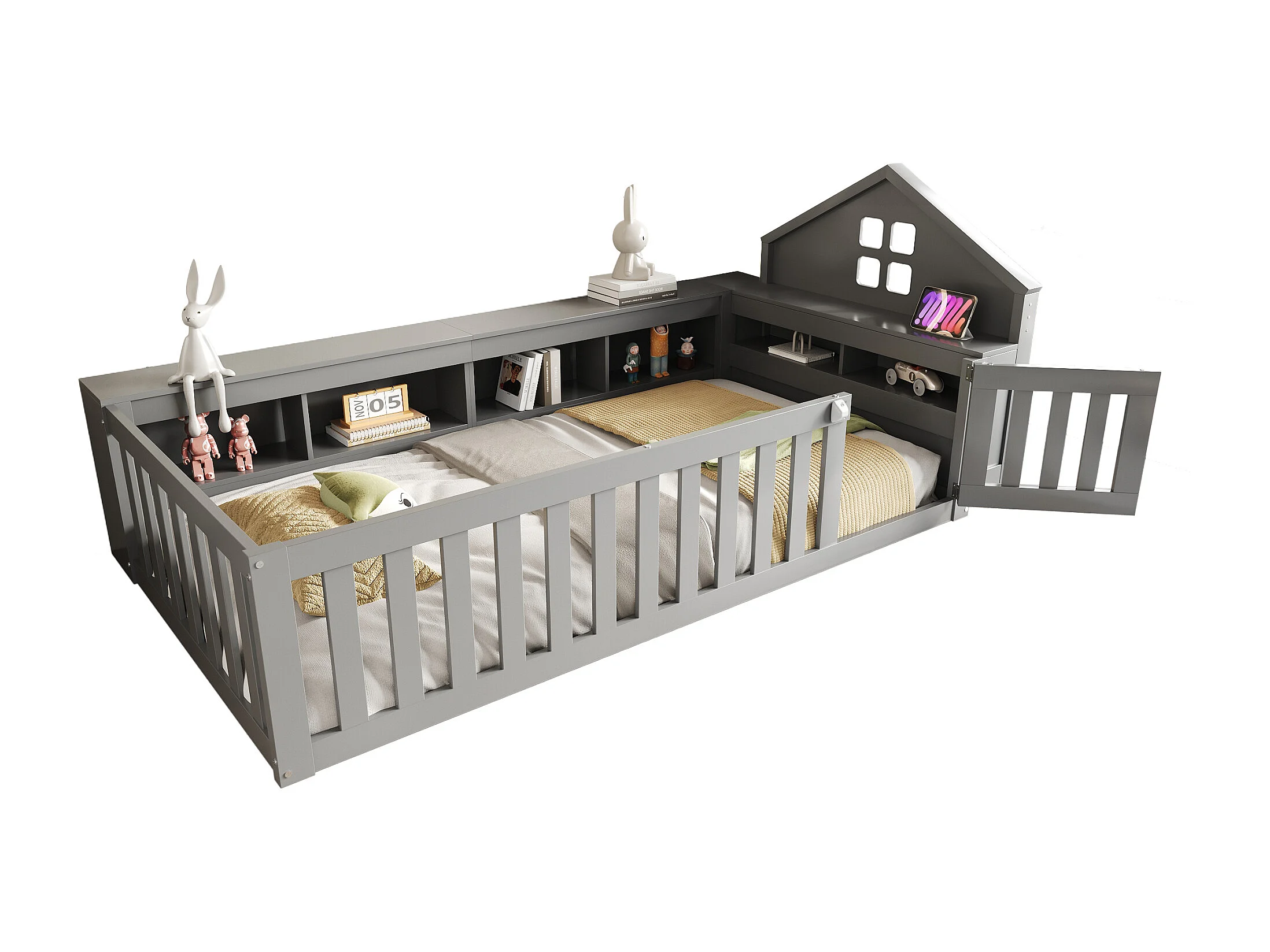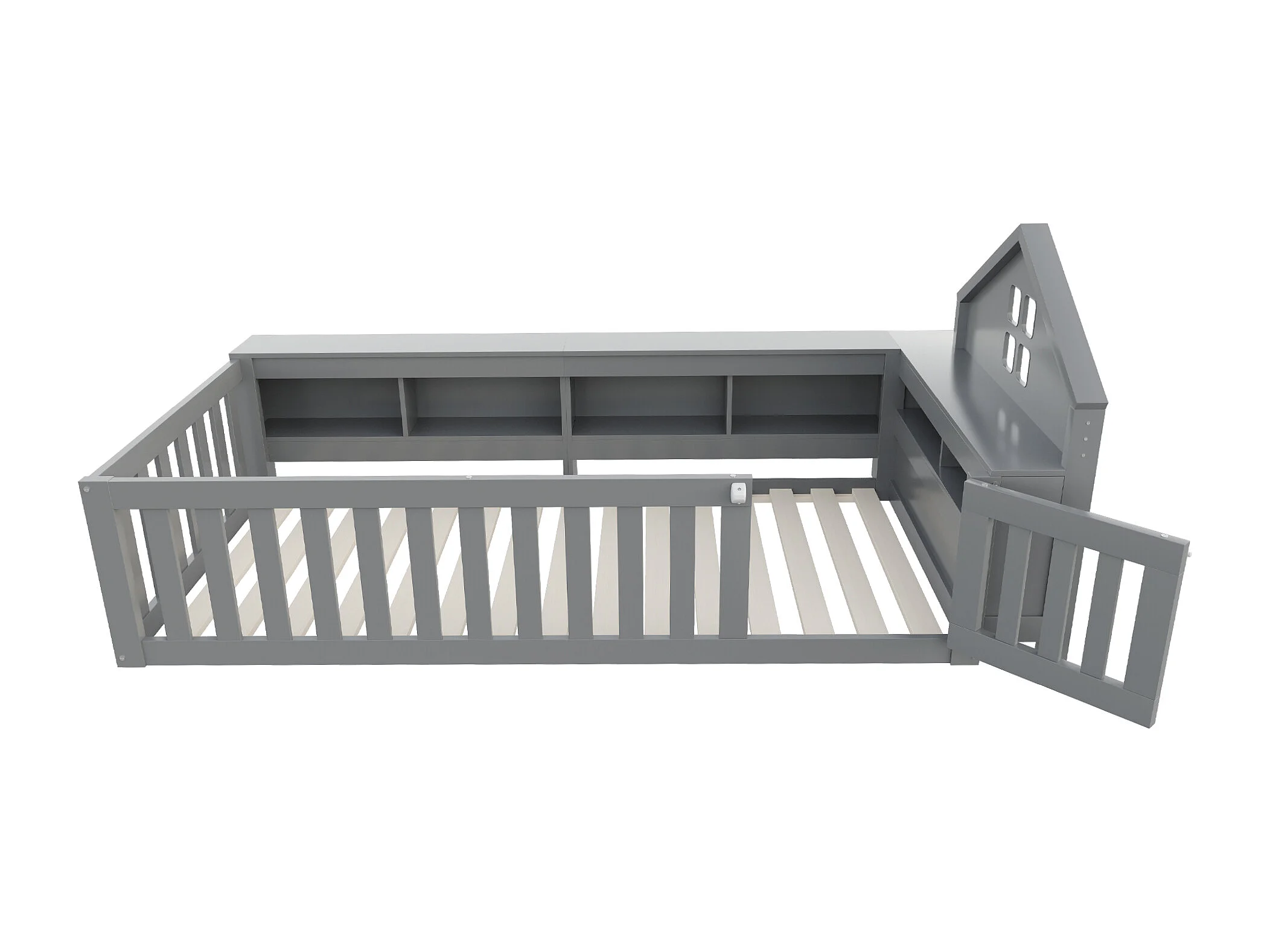 Lit enfant 90x200cm avec rangement et barre de toit - Lit simple en bois - Gris