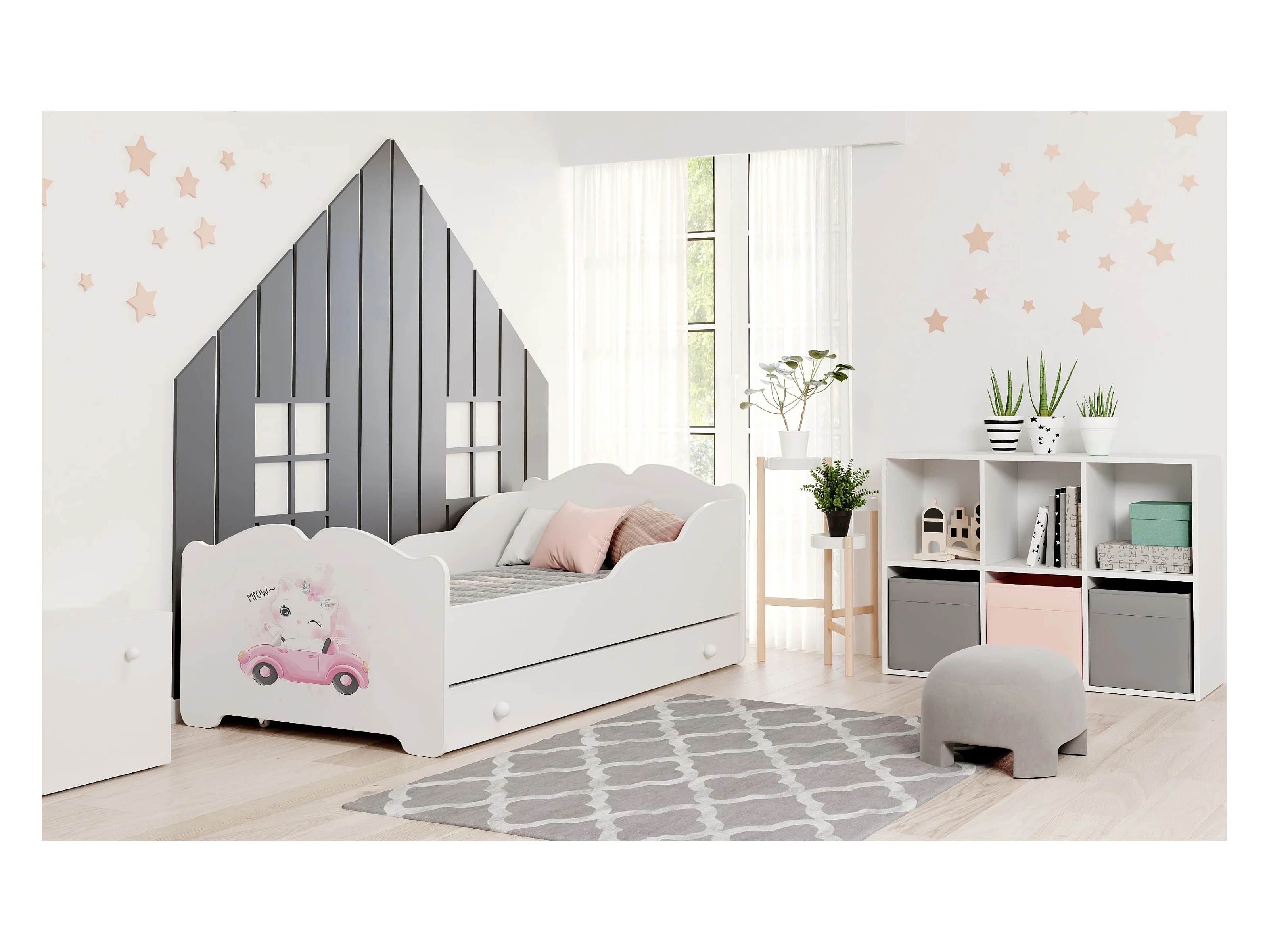 Lit enfant fille ALMENA avec tiroir matelas et cadre inclus - Chat et voiture rose - 160 cm x 80 cm