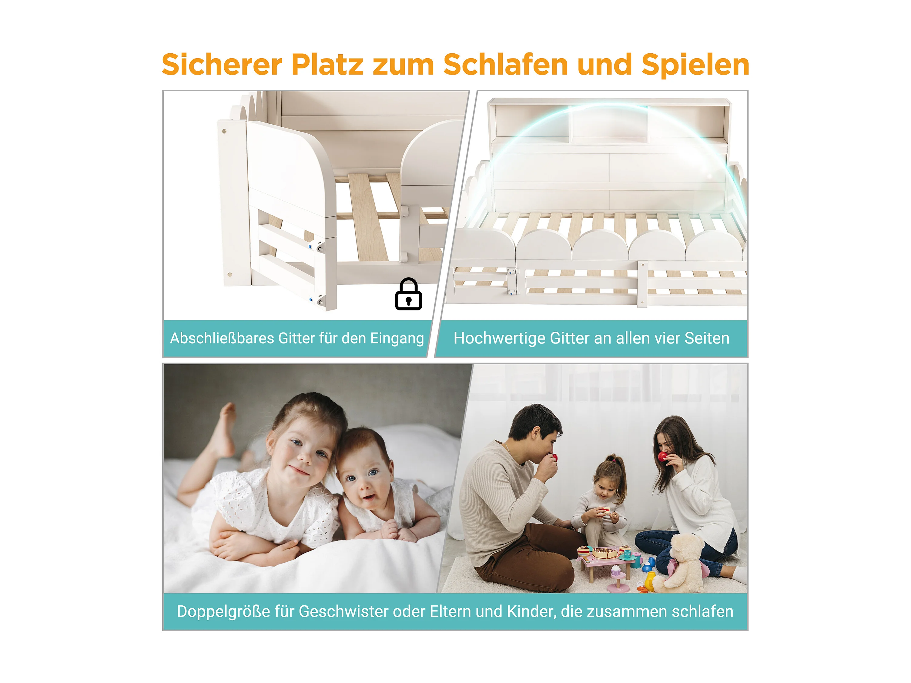 Lit enfant au sol en bois - 140 x 200 cm - avec protection + porte + sommier à lattes + étagère de rangement - bois - blanc