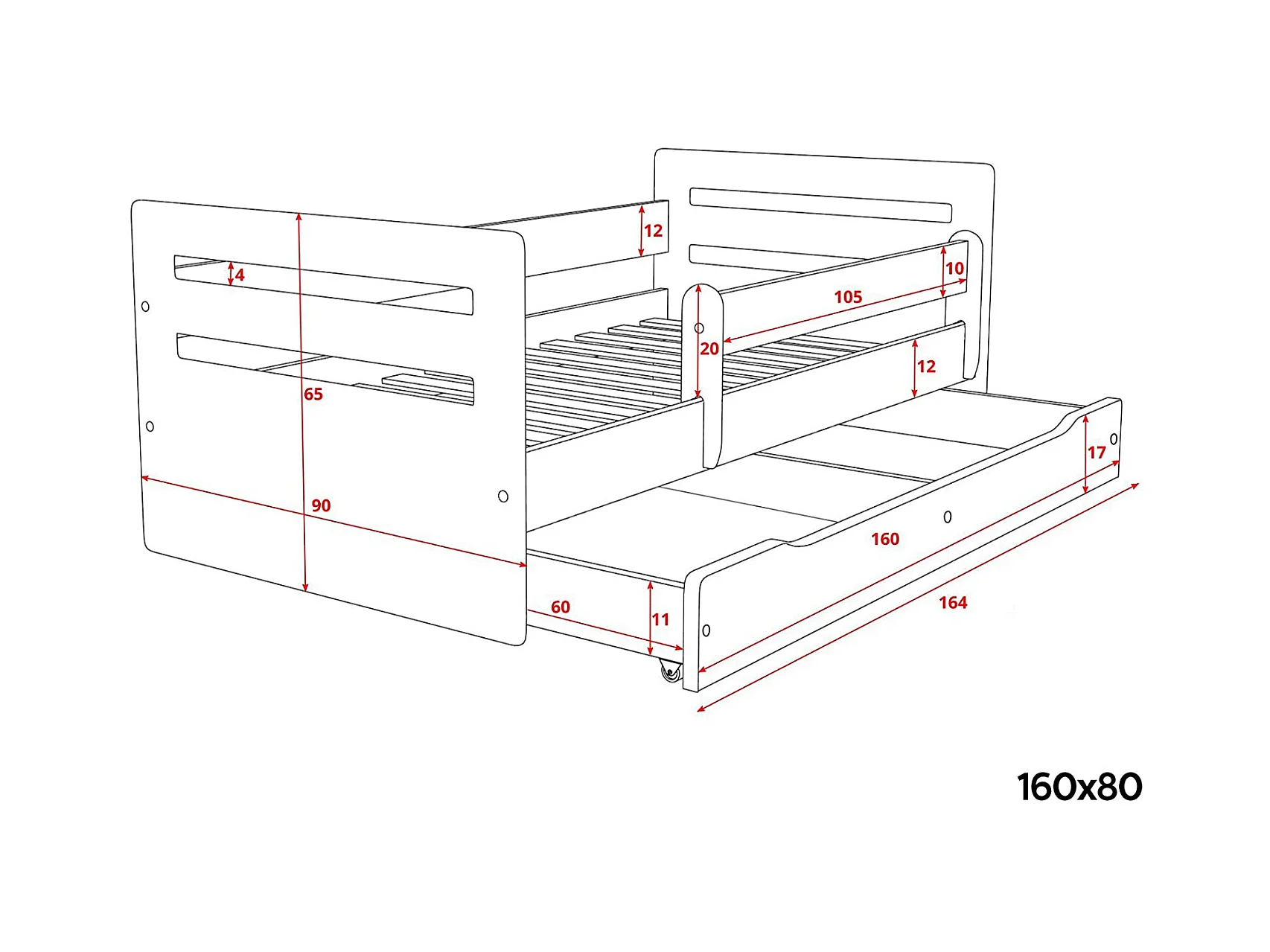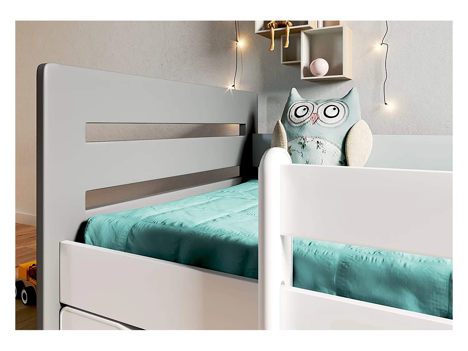 Lit enfant avec barrière de sécurité amovible blanc et gris Moly-80x160-Tiroirs Avec tiroir