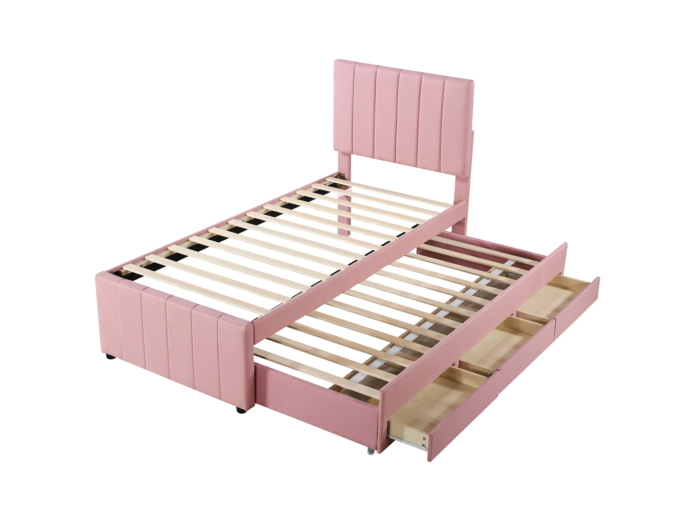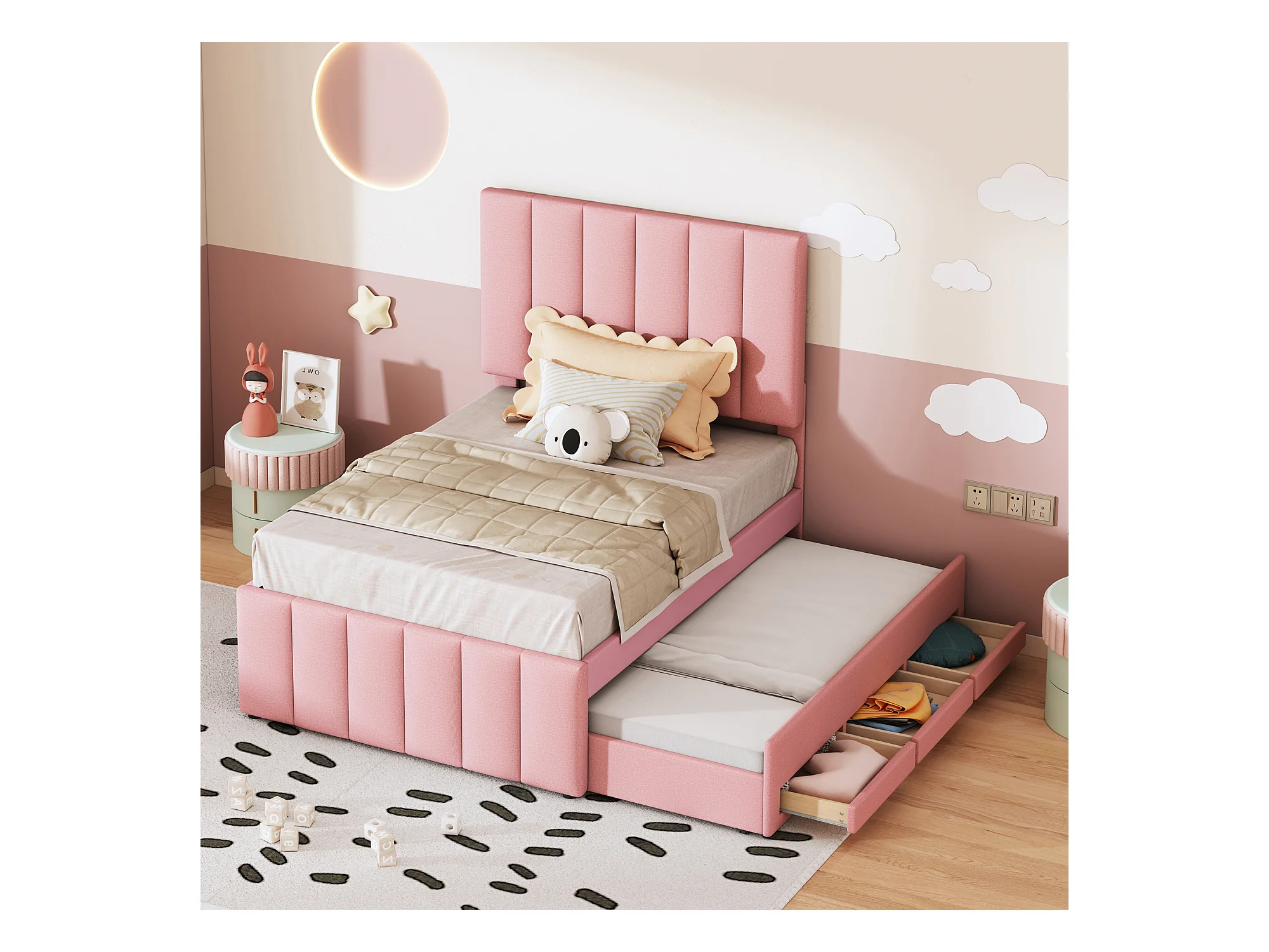 Lit enfant avec lit gigogne et tiroirs de rangement, rembourrage lin rose, lit simple multifonction (204x90x118 cm)