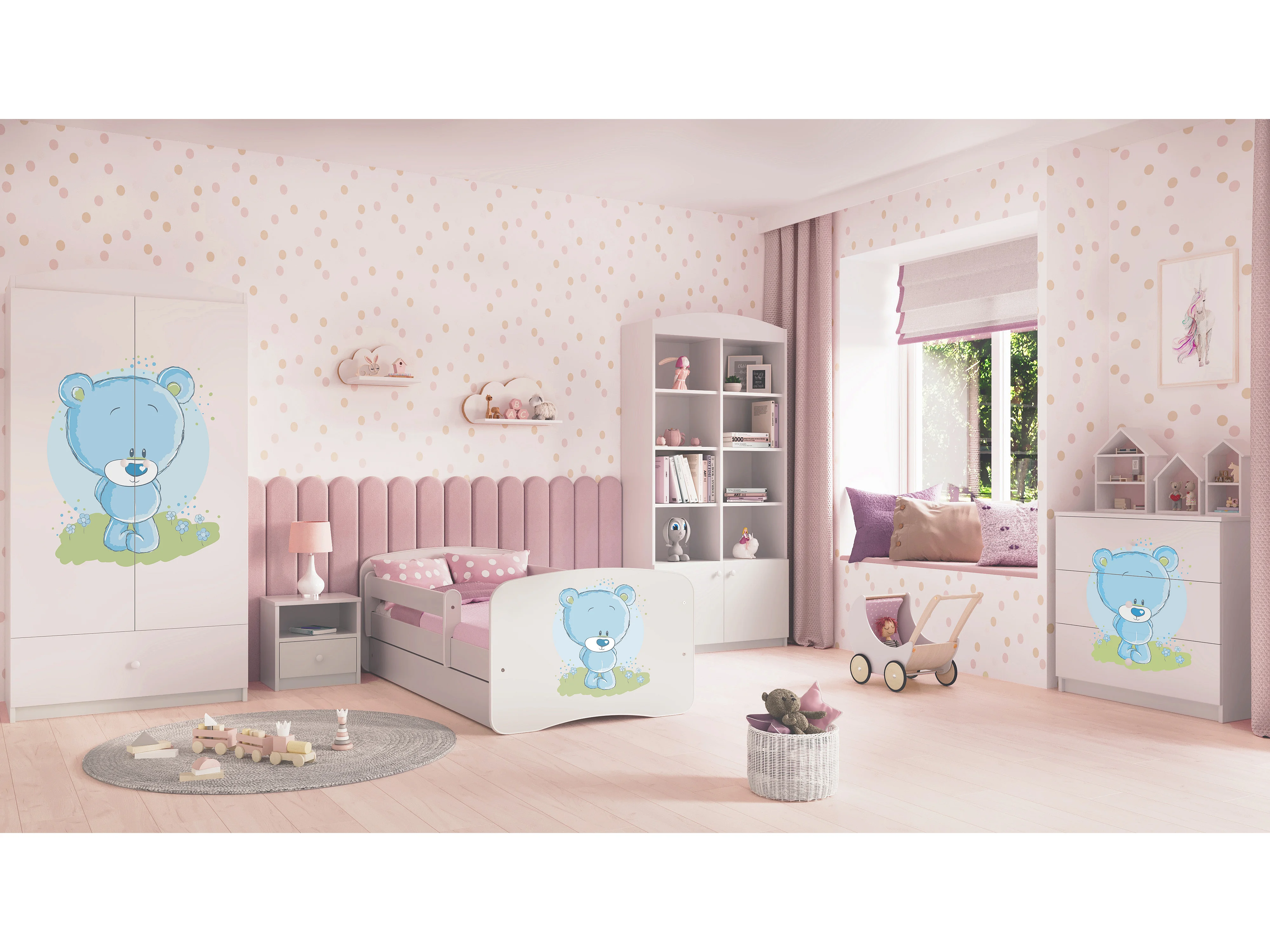 Lit enfant avec tiroir et barrière- Ourson Bleu Fleuri - 80 x 160 cm
