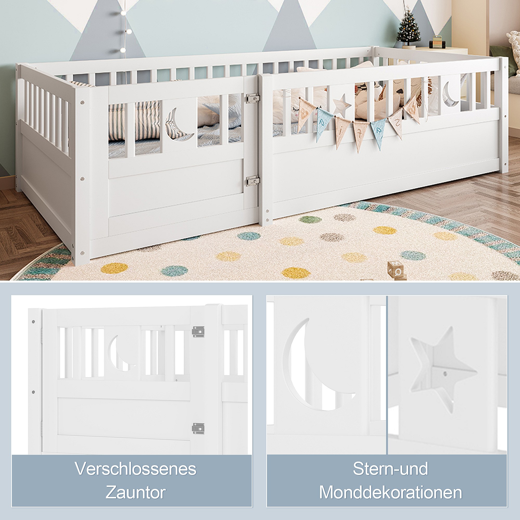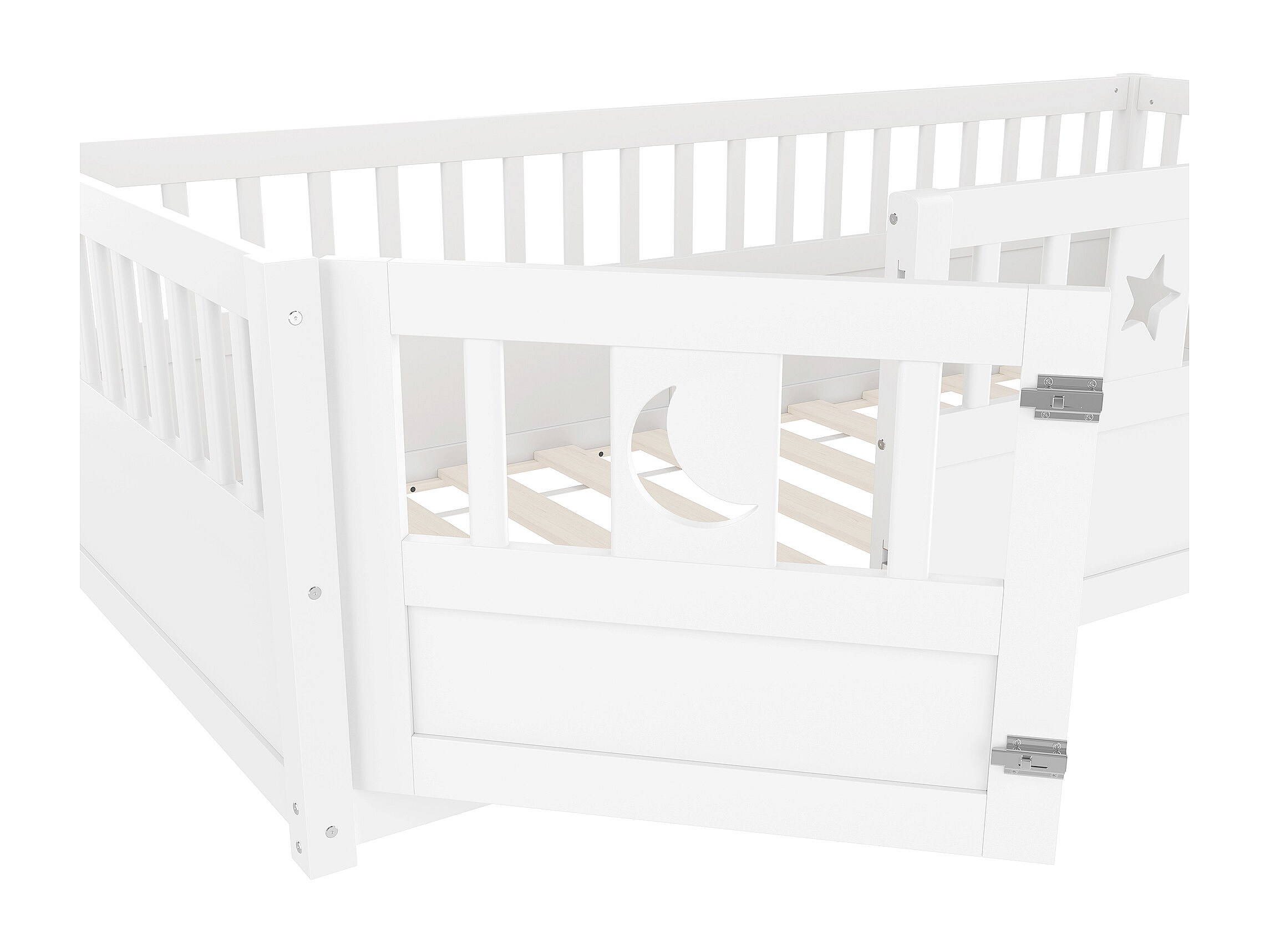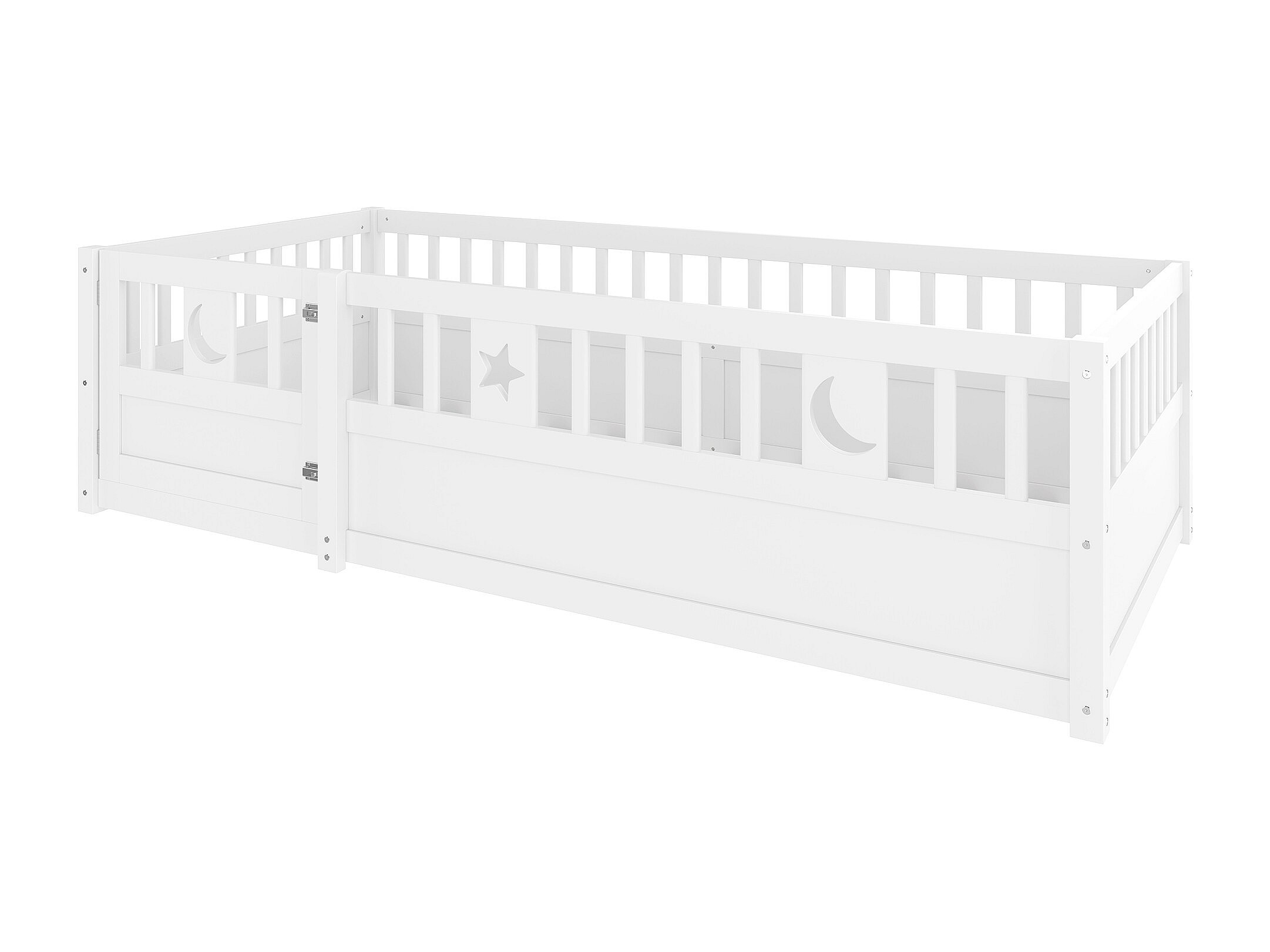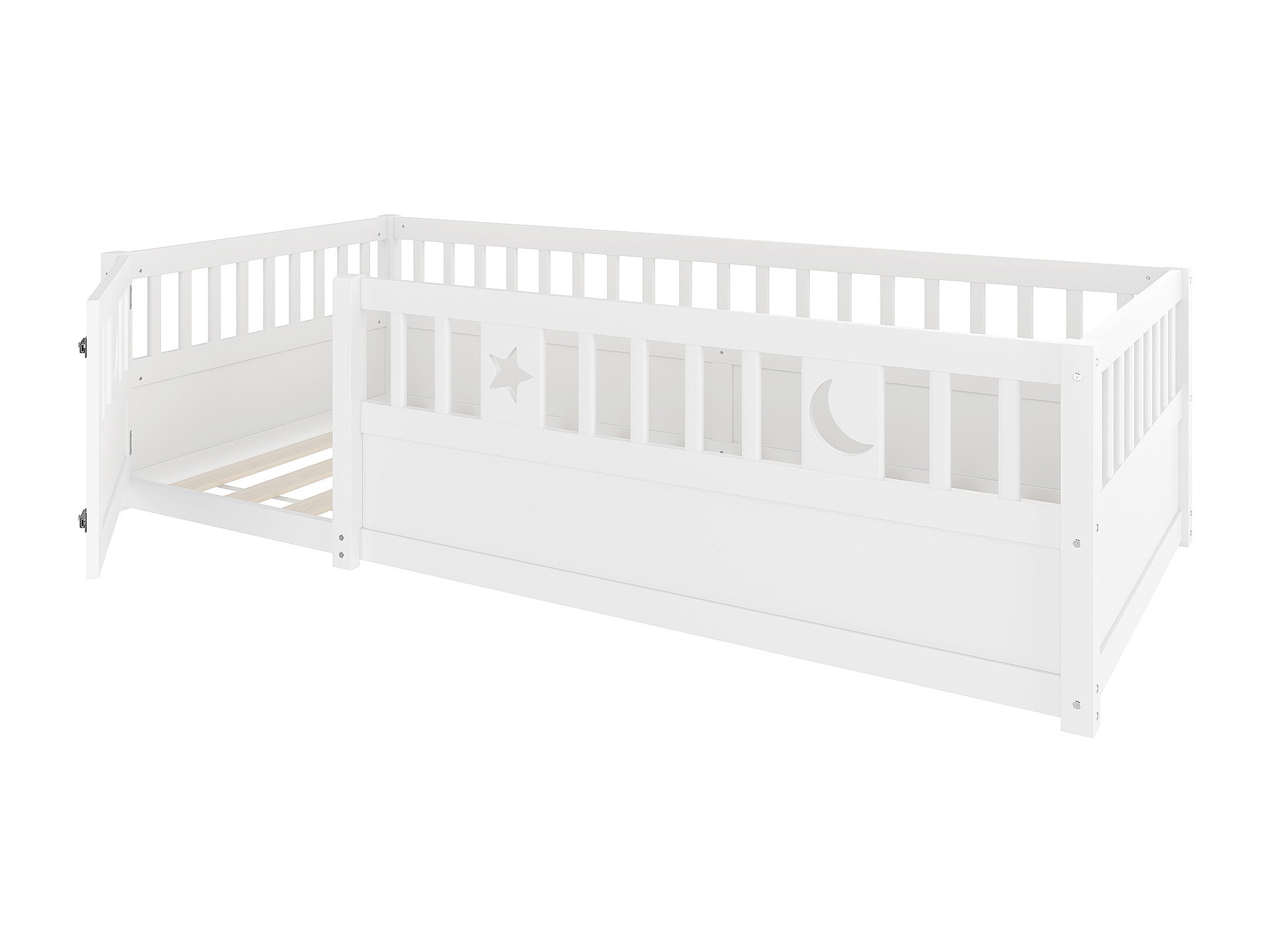 Lit enfant blanc 90 x 190 cm avec barrières de sécurité, décor étoiles et lune, sommier à lattes (sans matelas)