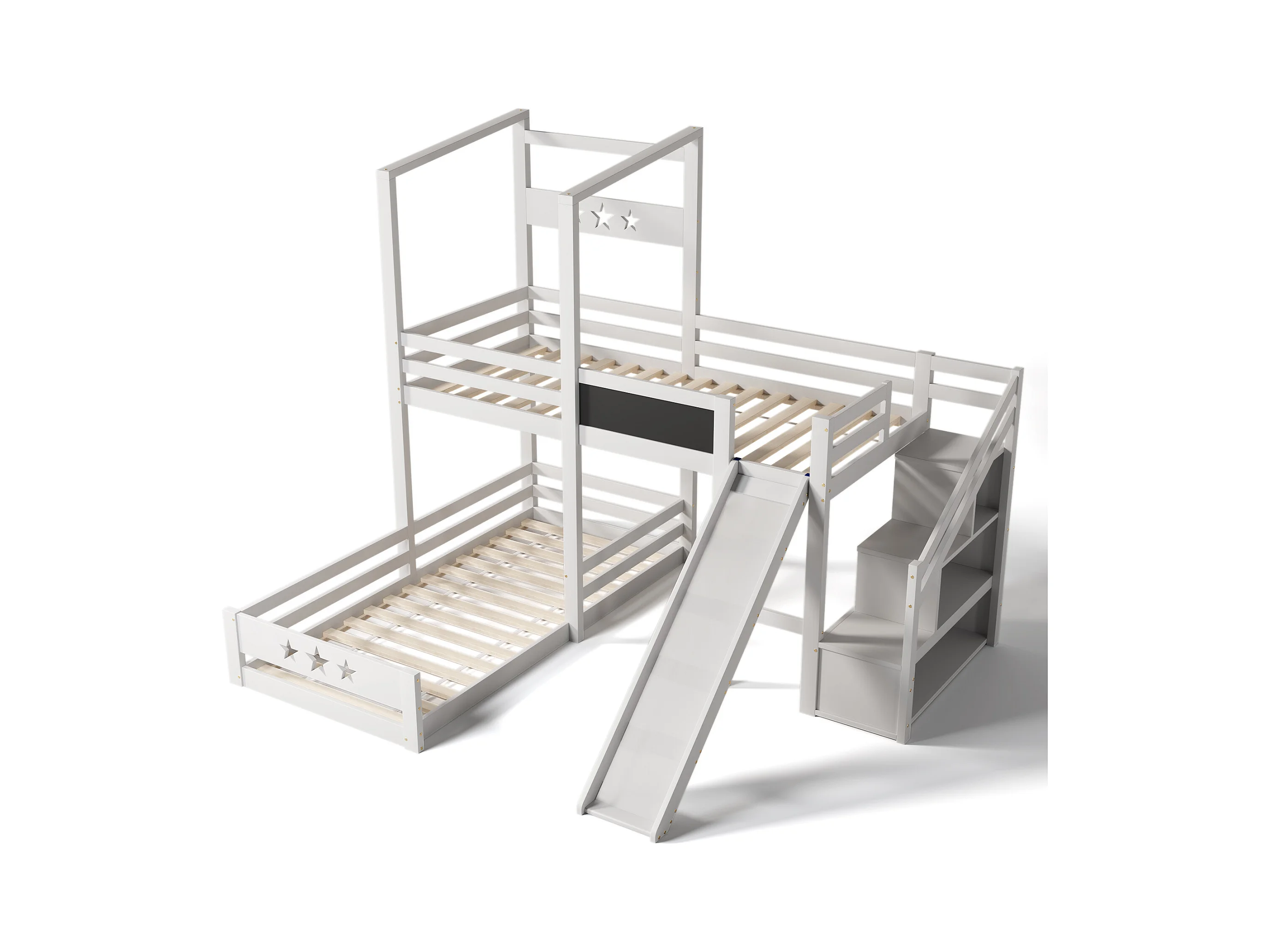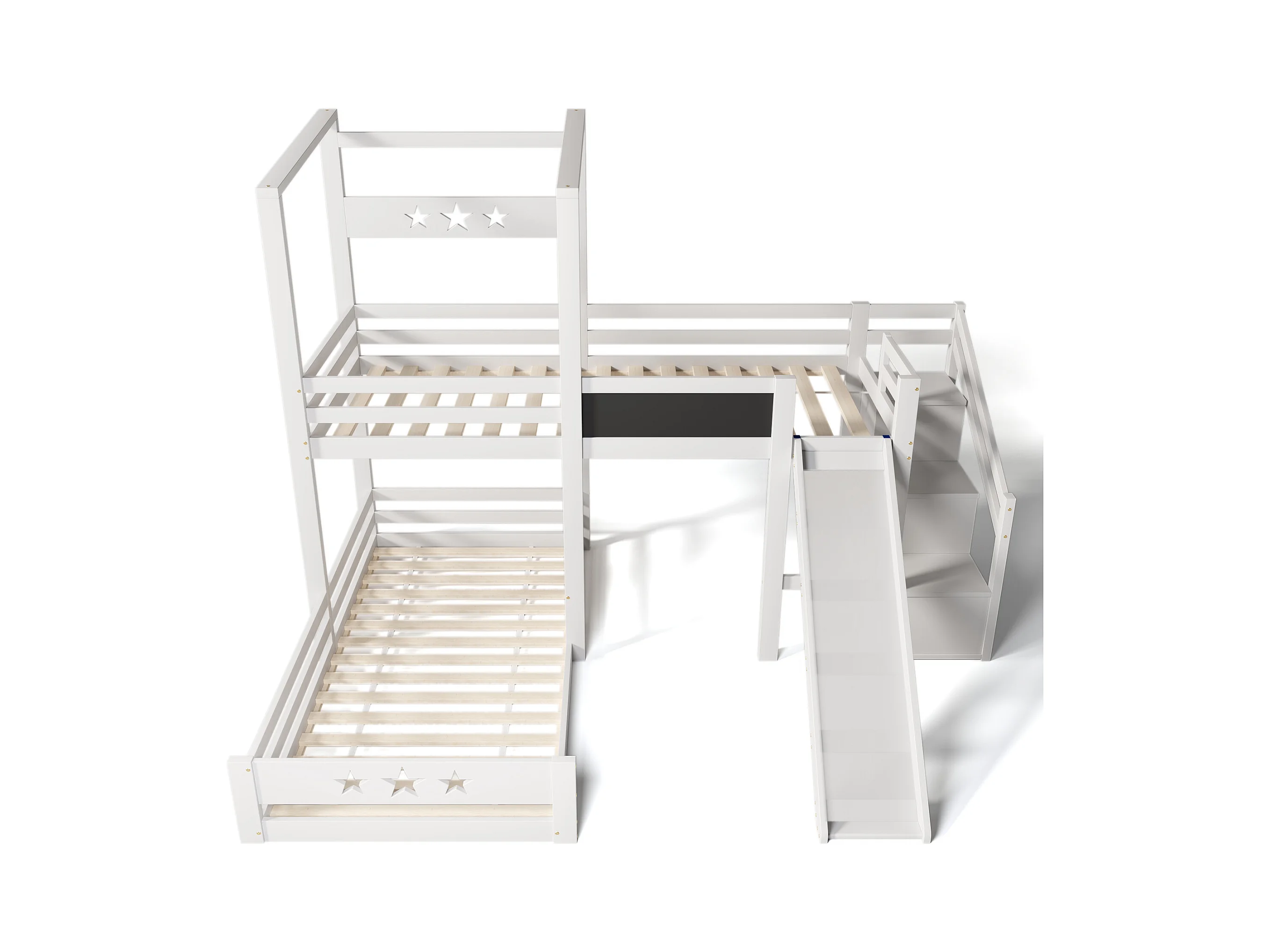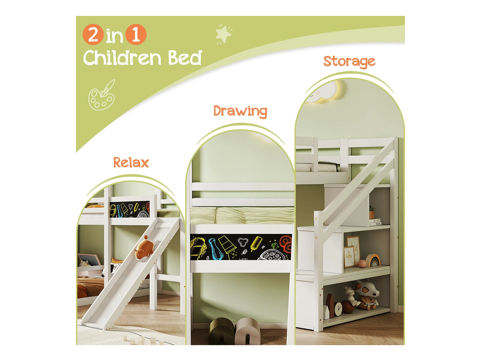 Lit enfant blanc lit superposé avec tableau noir et toboggan, escalier avec rangement, lit simple 90x200 cm avec protection antichute