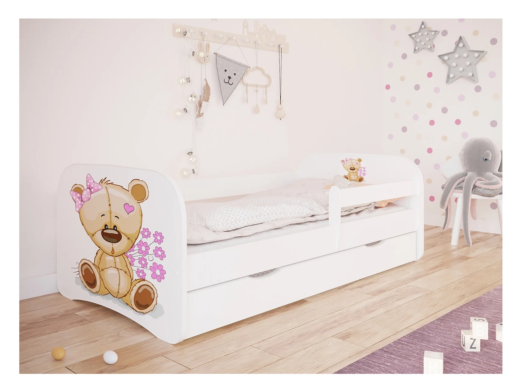 Lit enfant blanc ourson et fleurs avec sommiers et barrière de sécurité amovible Drimy-80x180-Tiroirs Avec tiroir