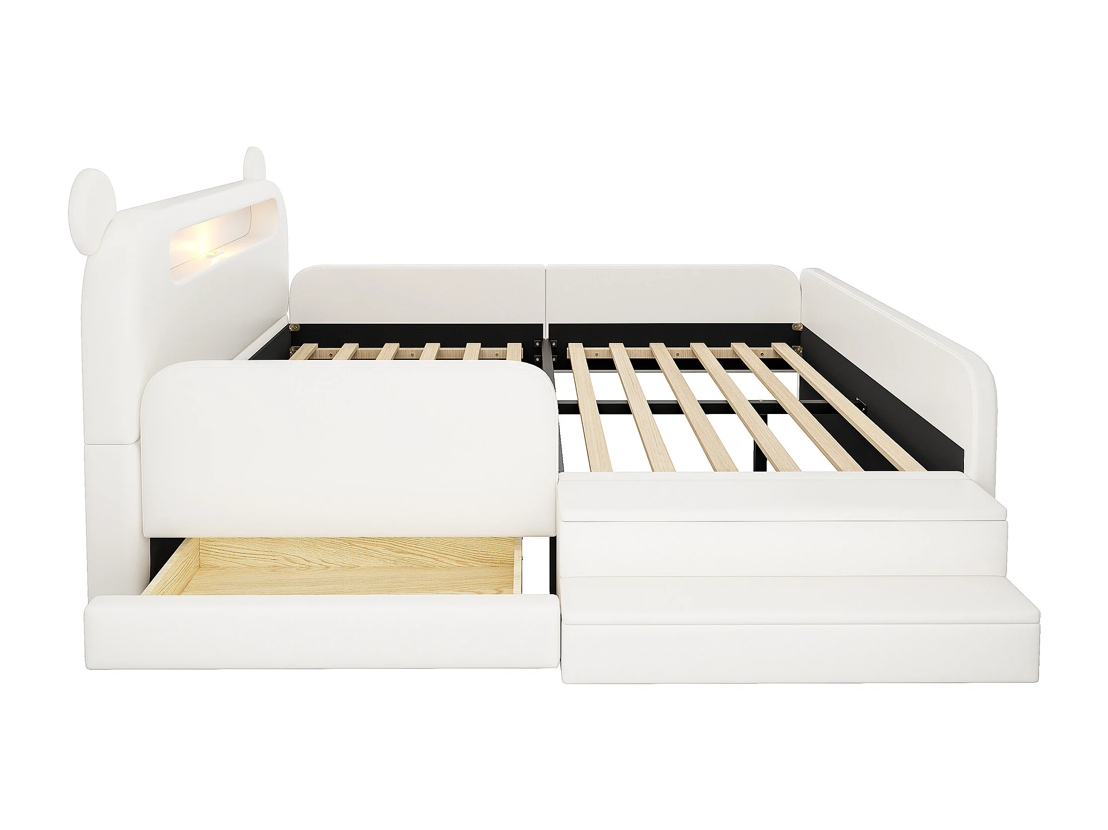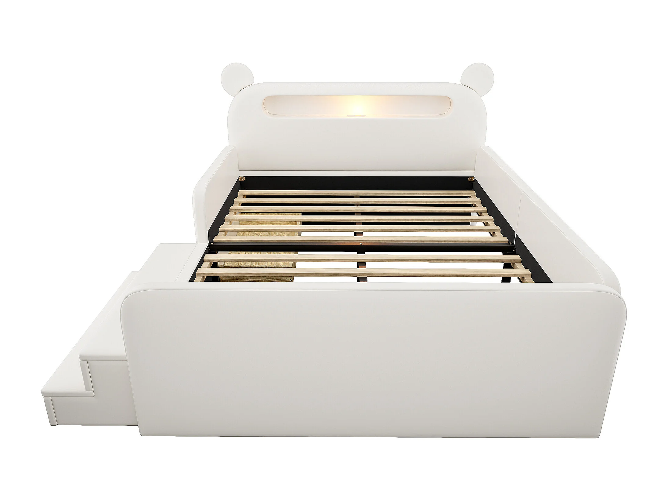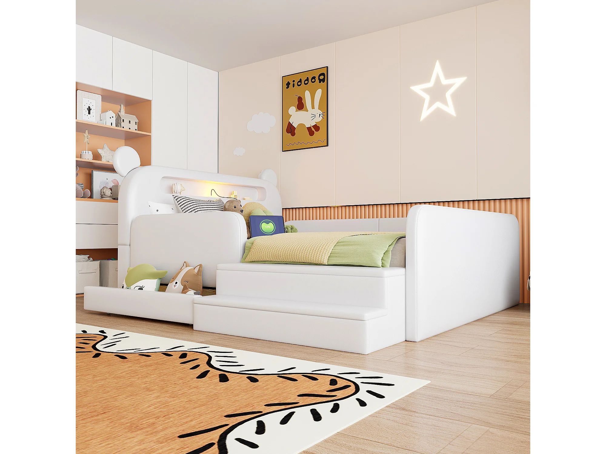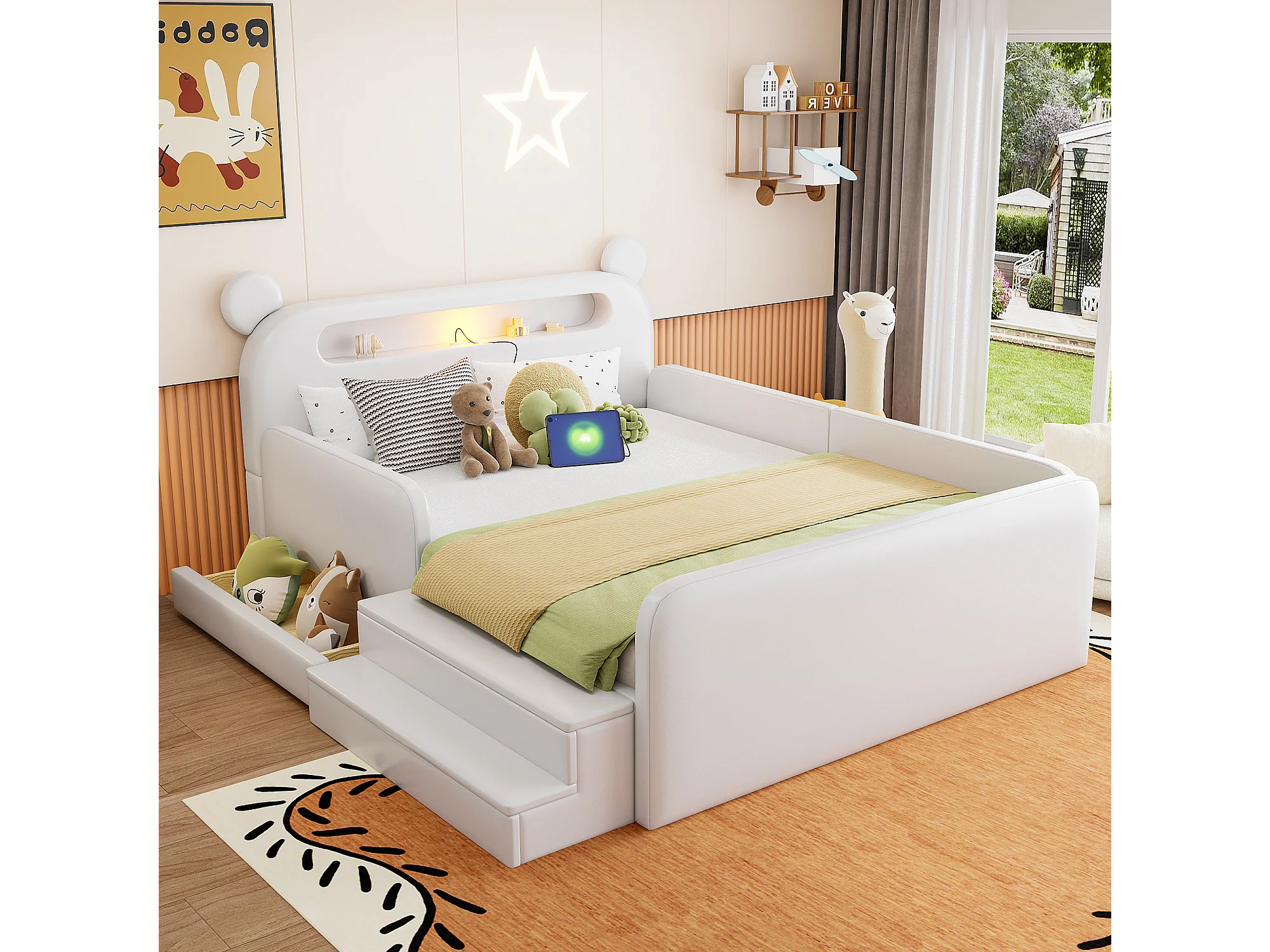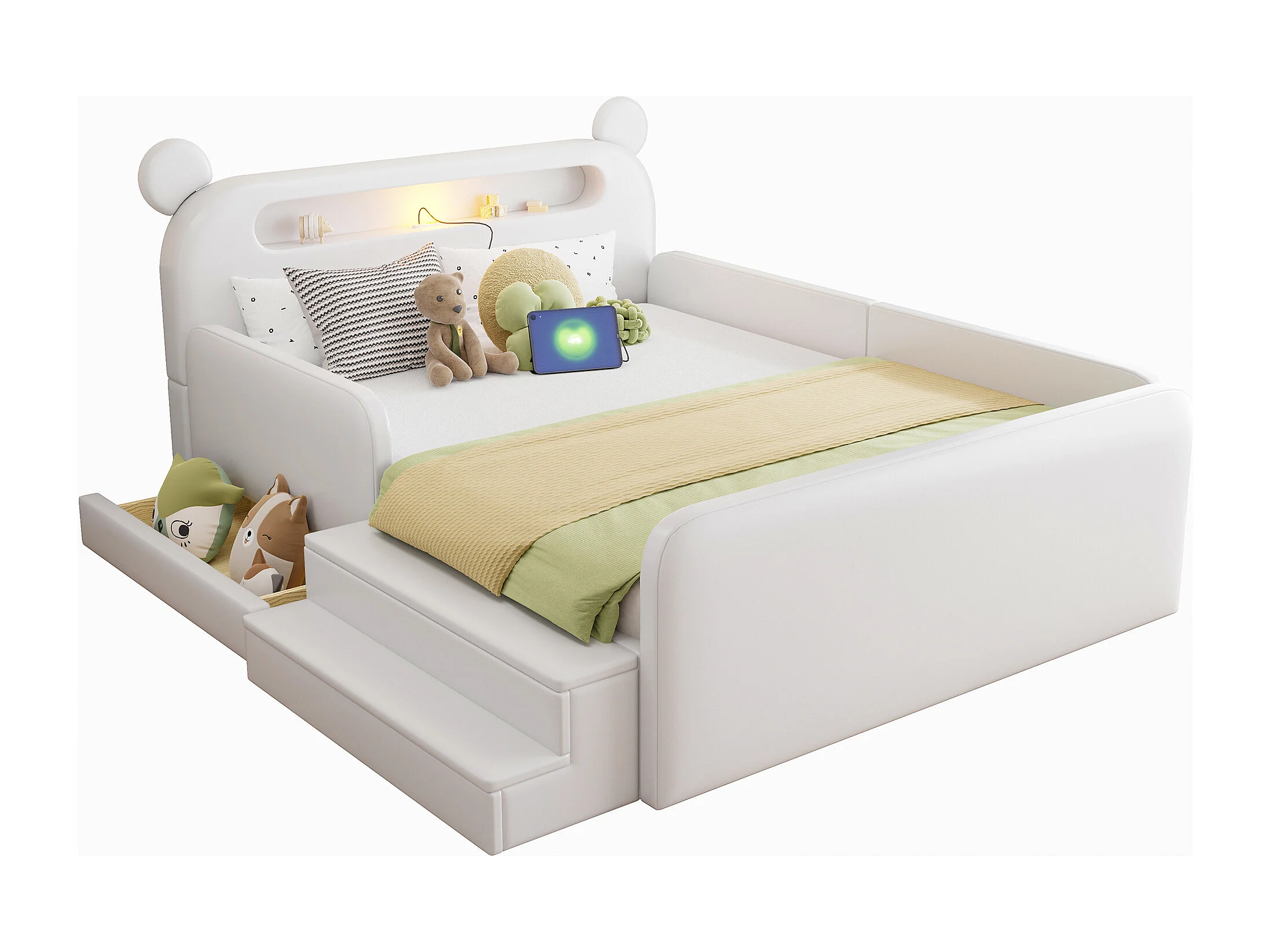 Lit enfant capitonné - 140 x 200 cm - avec tête de lit + veilleuse + USB + tiroir + siège marchepied - faux cuir - blanc