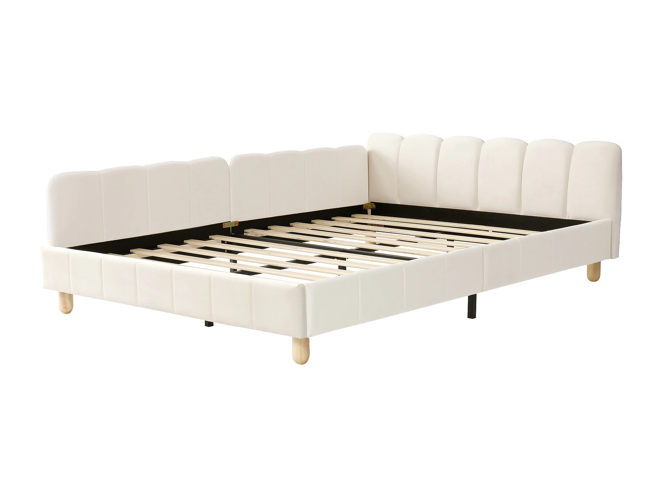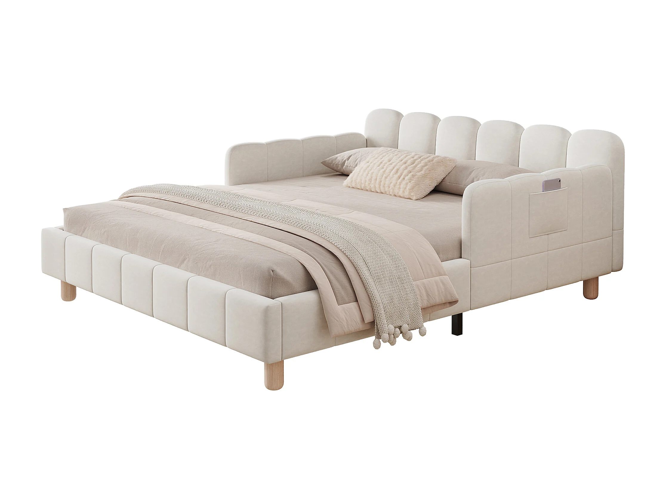Lit enfant capitonné 140x190cm - avec tête de lit capitonnée et barrières de sécurité - pieds en bois massif - en velours - beige