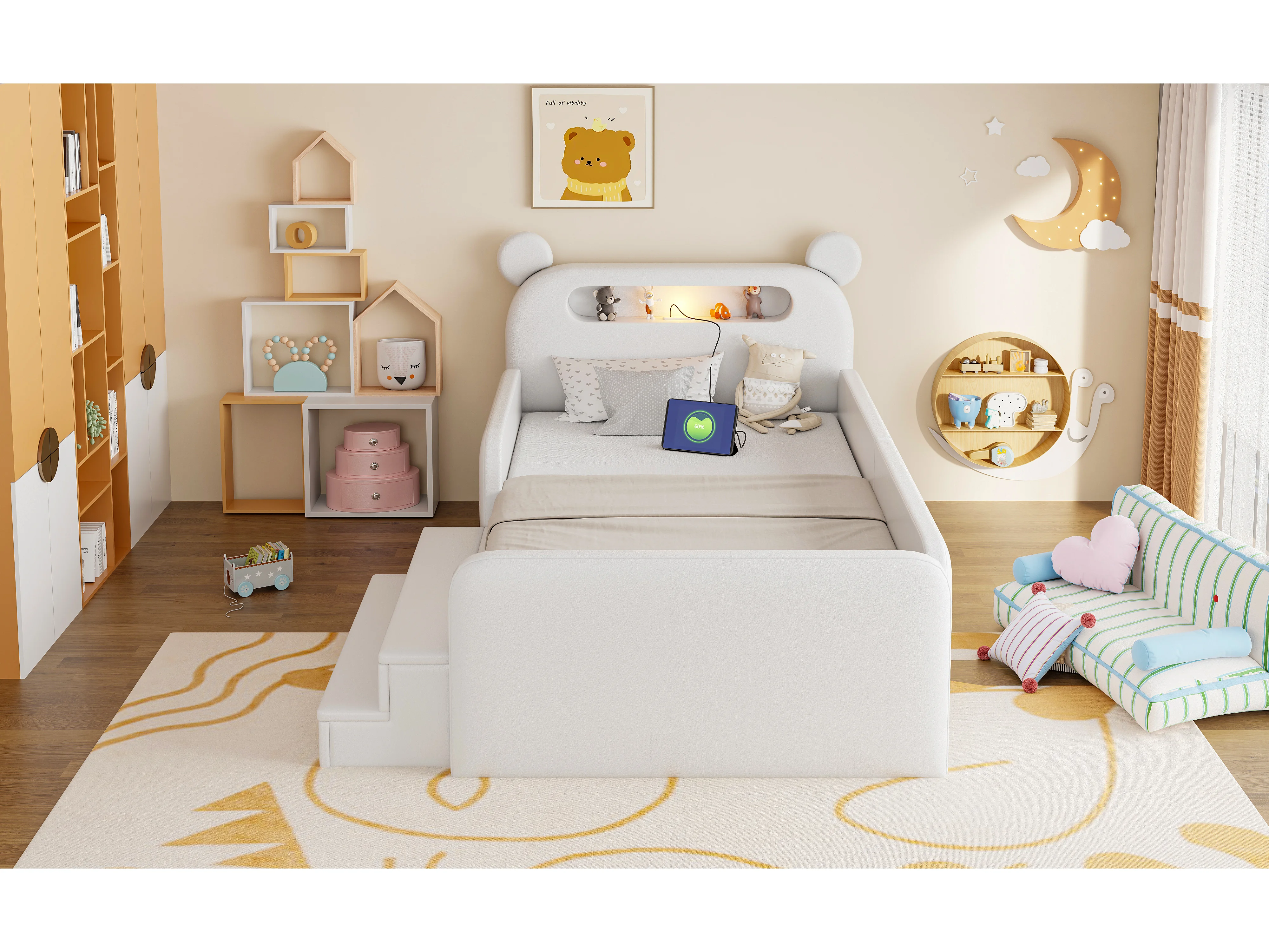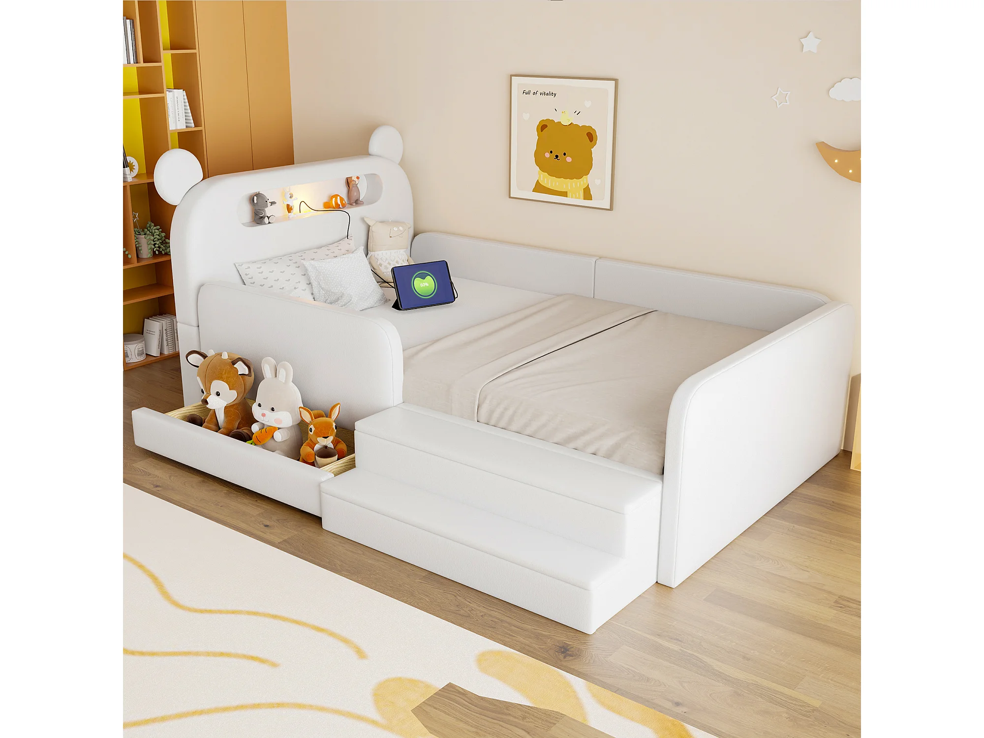 Lit enfant capitonné - 90 x 200 cm - avec tête de lit + veilleuse + USB + tiroir + siège marchepied - faux cuir - blanc