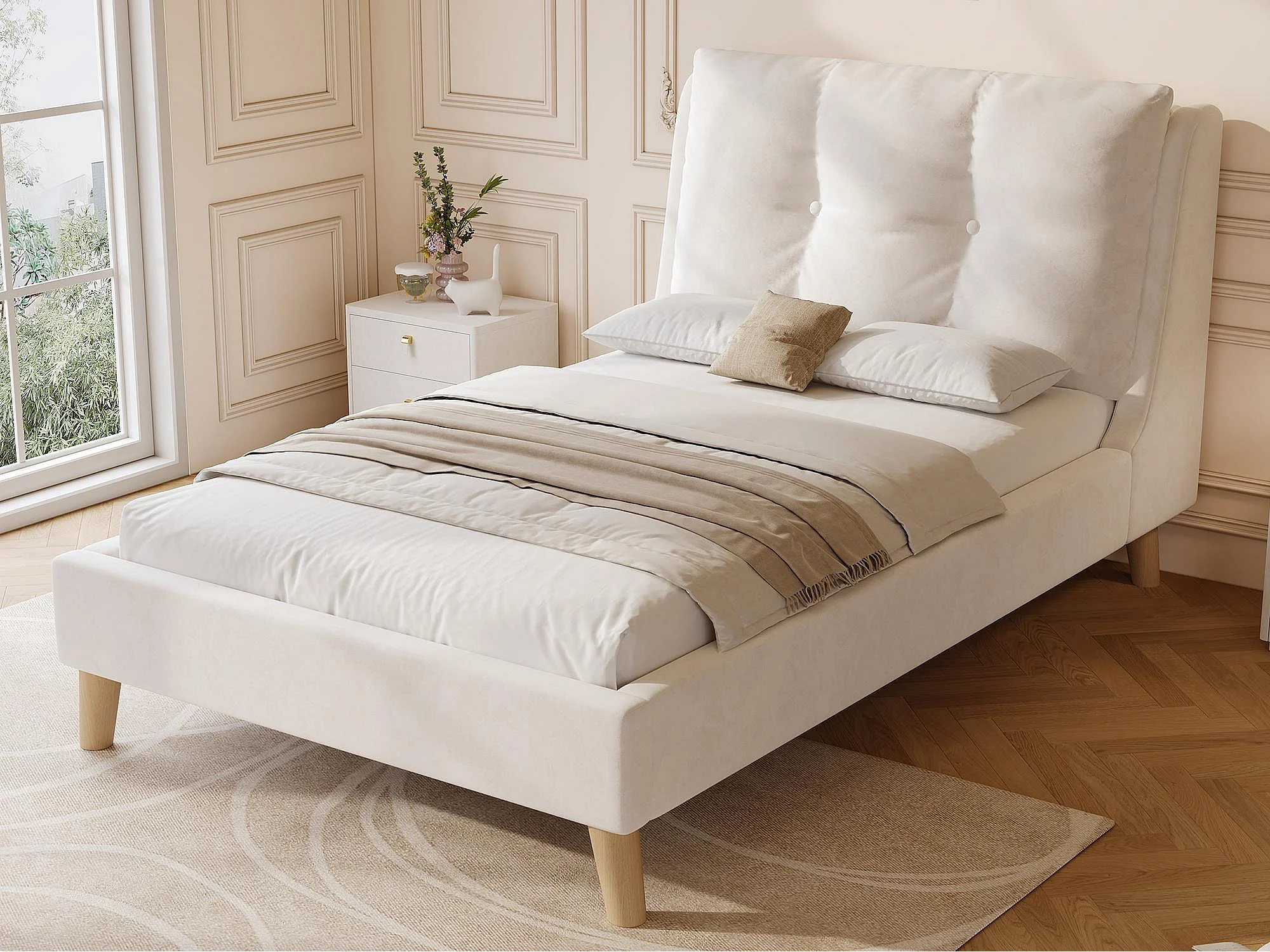 Lit enfant capitonné 90x200cm - Oreillers réglables - Pieds en bois massif - Velours - Beige (Matelas non inclus)