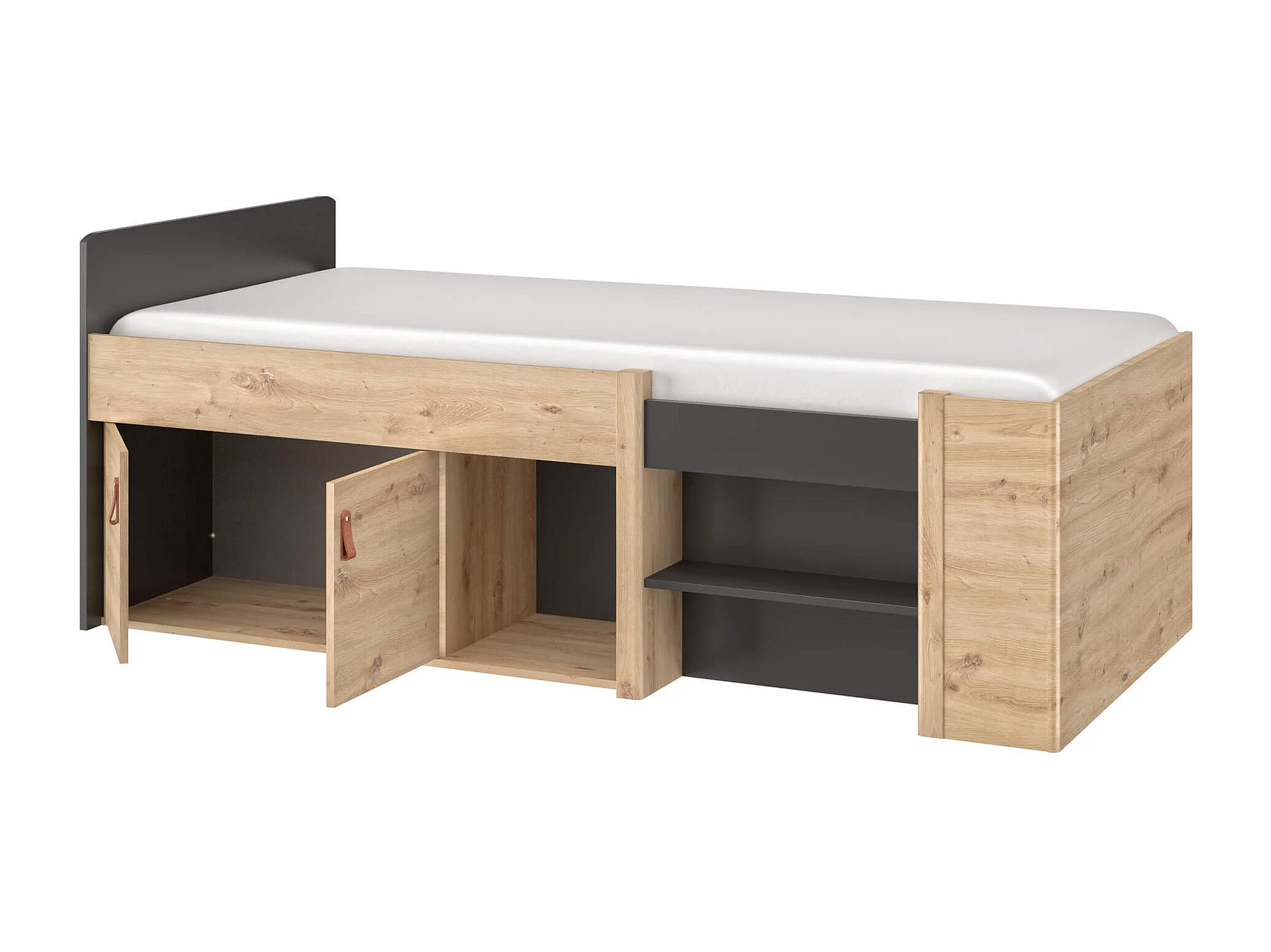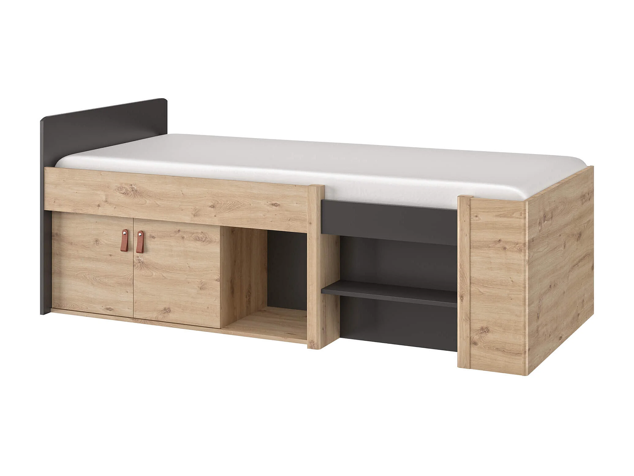 Lit tiroir enfant avec niches de rangement noir et imitation chêne 90x200 - LC5051