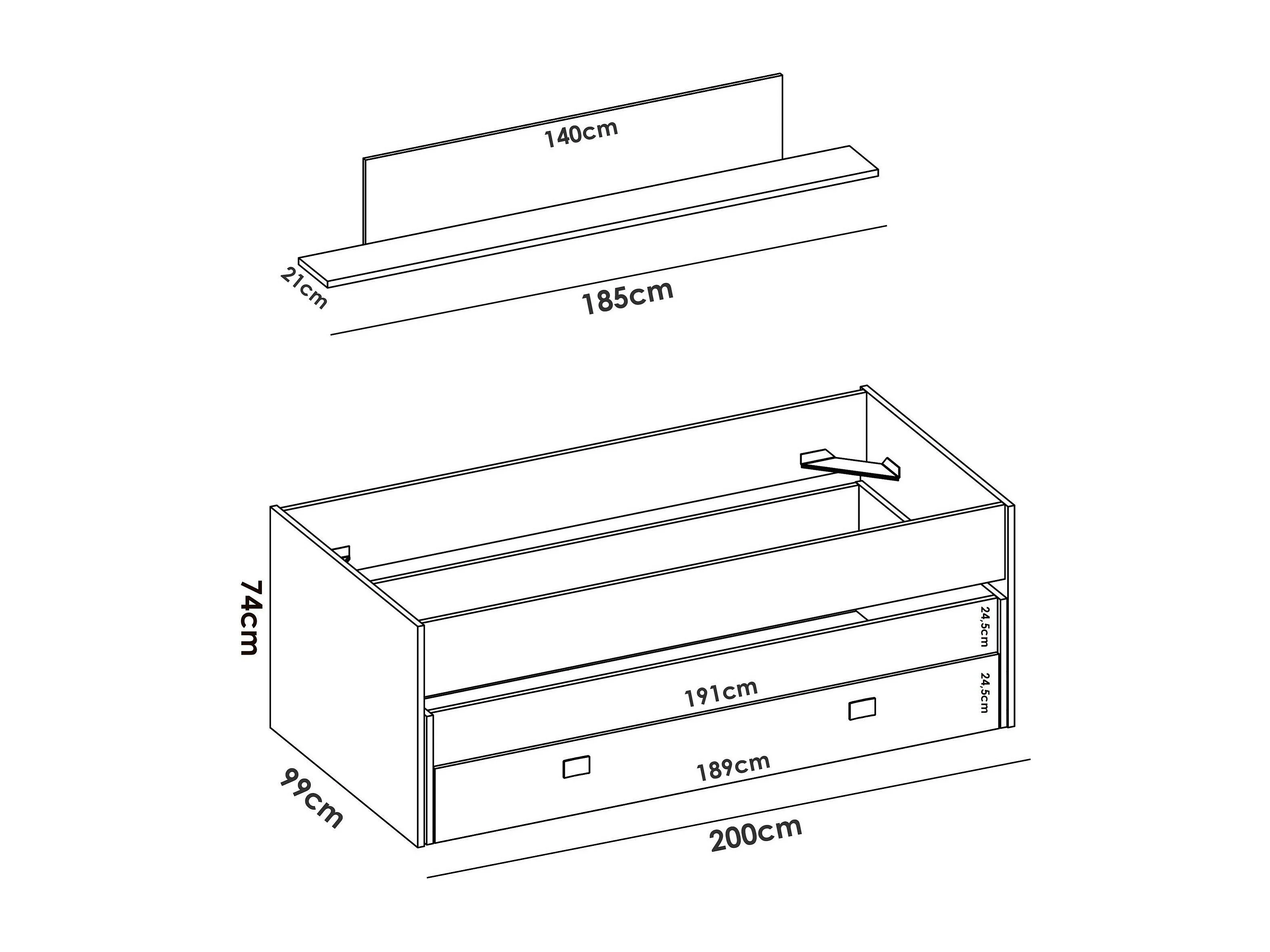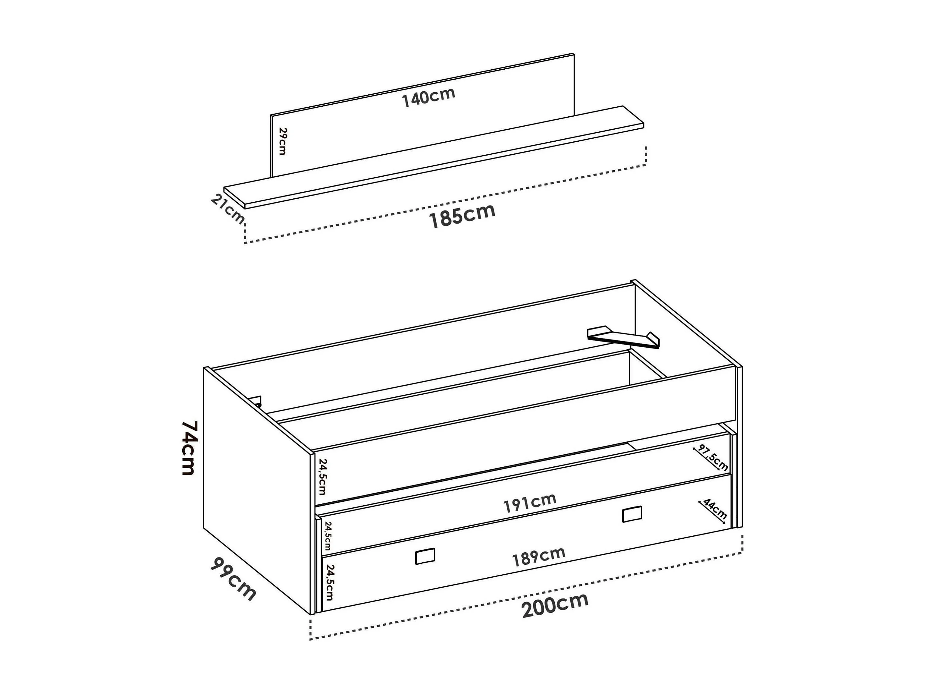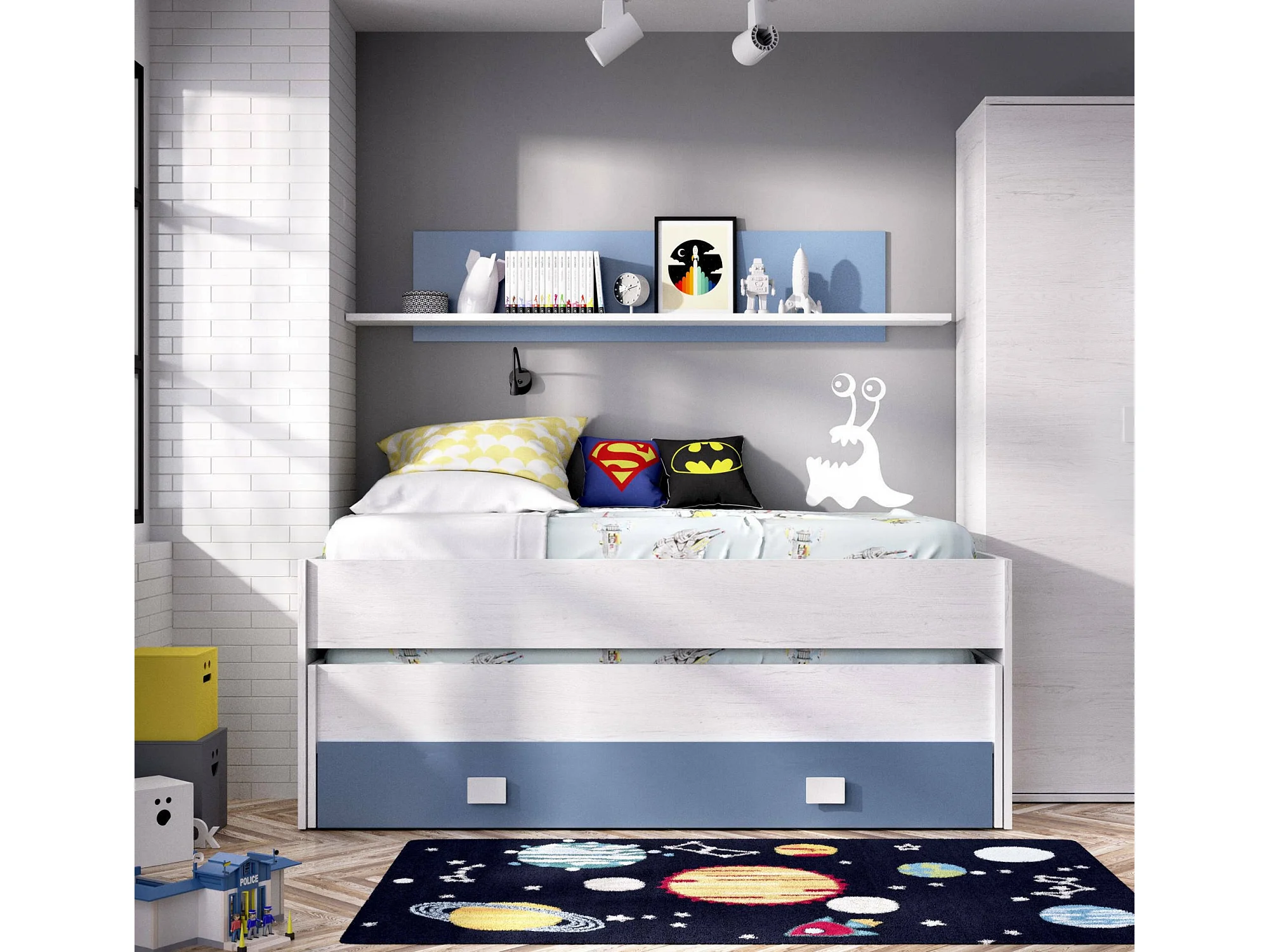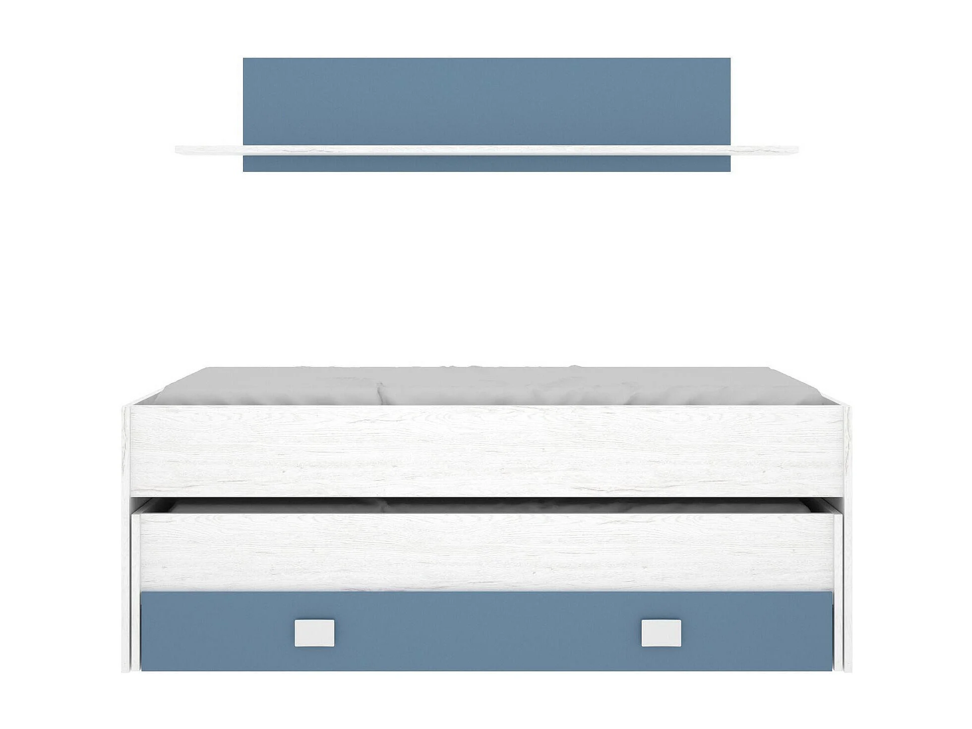 Lit enfant Dlicat, Structure avec deuxième lit extractible, Lit simple pour chambre avec 1 tiroir et étagère, 200x99h74 cm, Blanc et Bleu