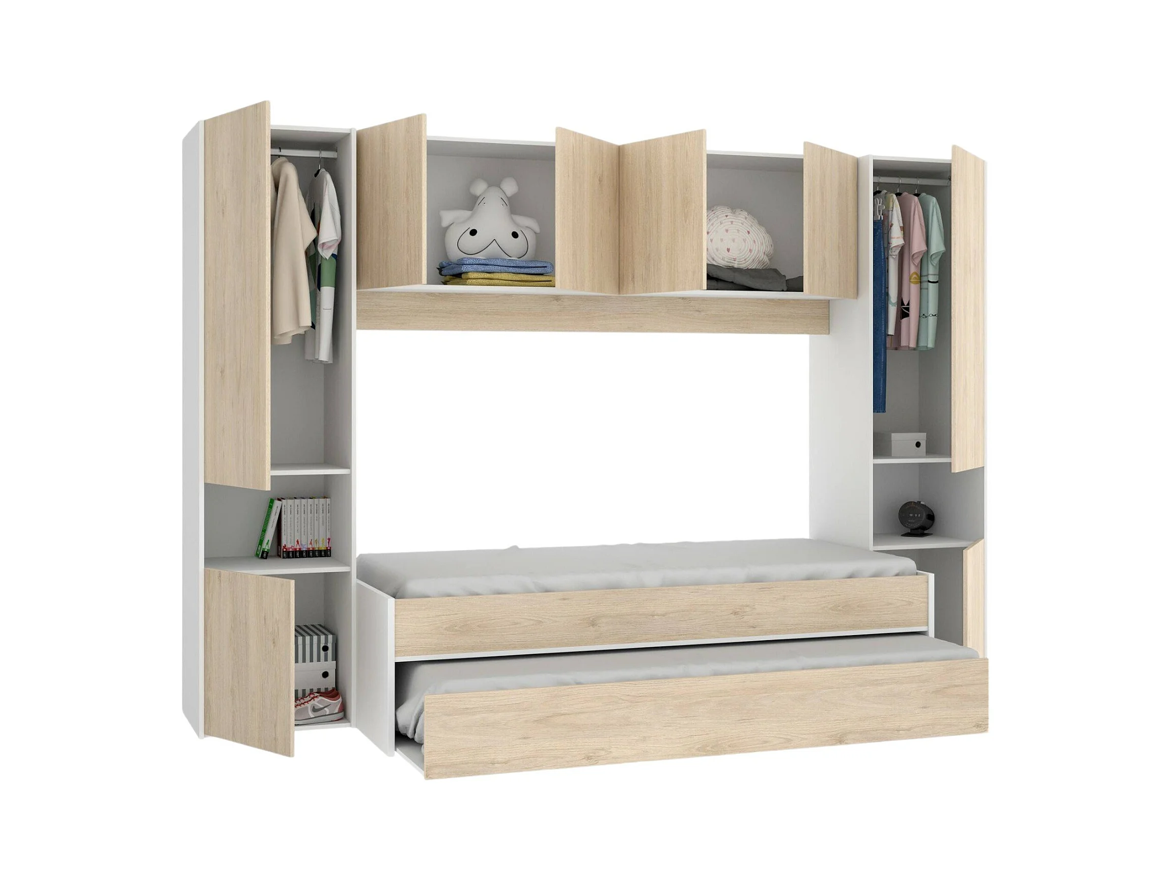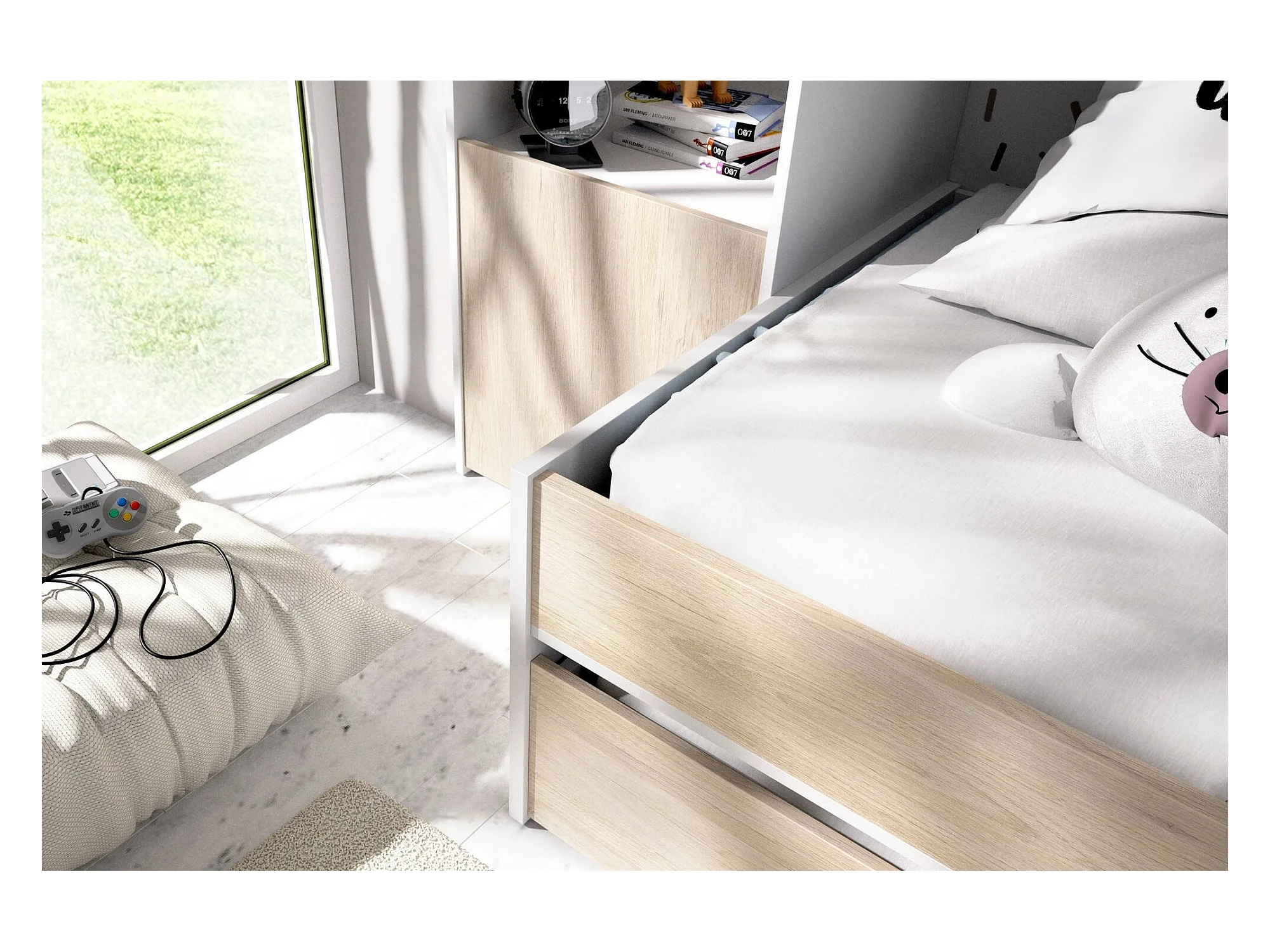 Lit enfant Dmra, Chambre complète avec armoire bridge et commode, Composition avec lit et lit simple extractible, 303x97h203 cm, Chêne et Blanc