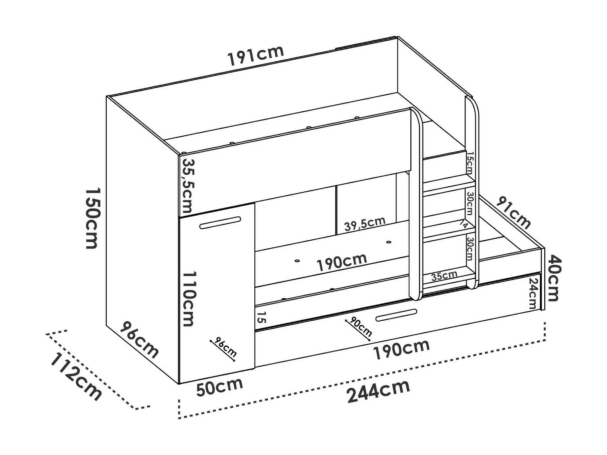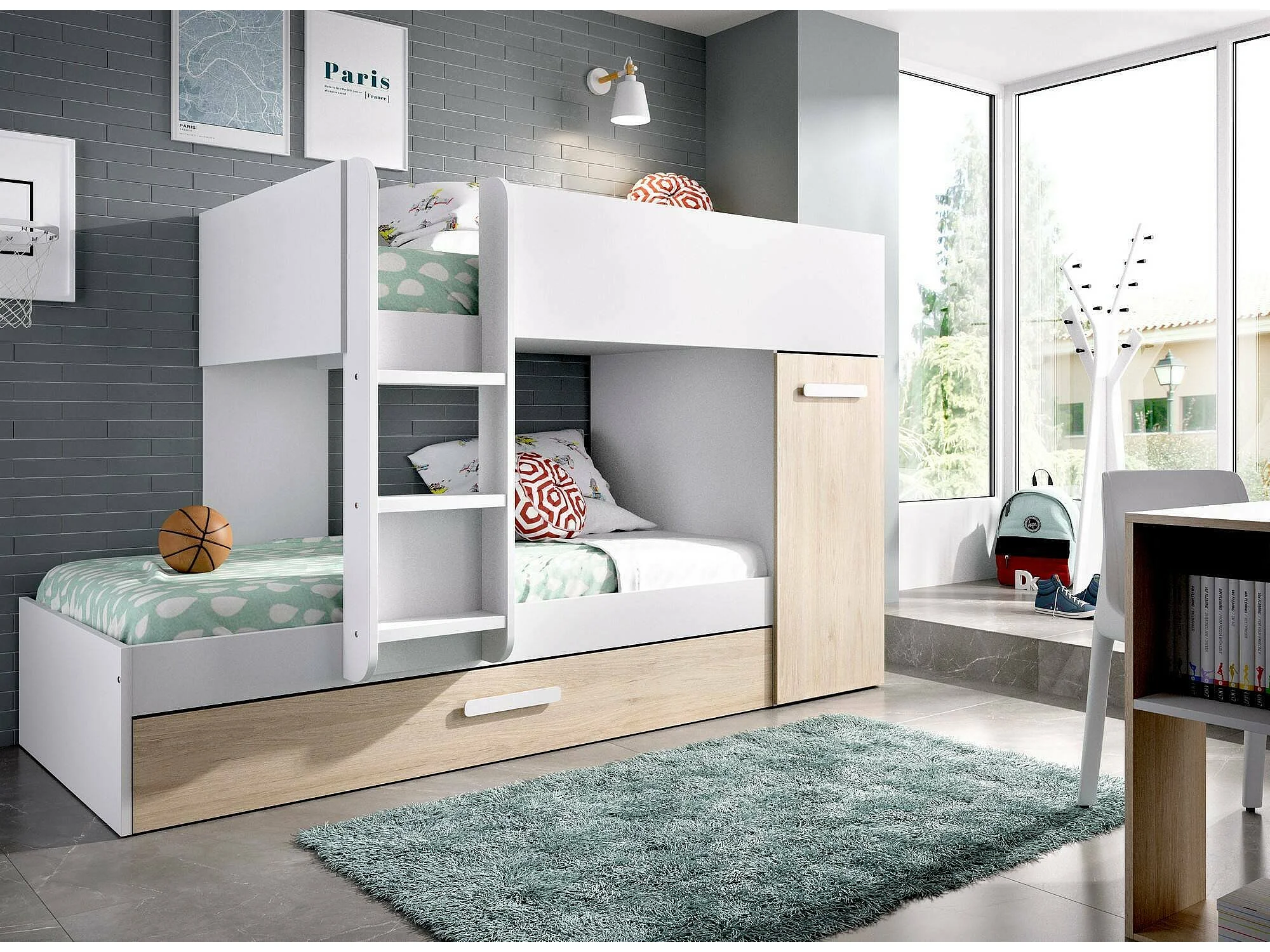 Lit enfant Eiger, Chambre complète avec armoire et tiroir, Composition de lits superposés avec deux lits simples, 244x112h150 cm, Chêne et Blanc
