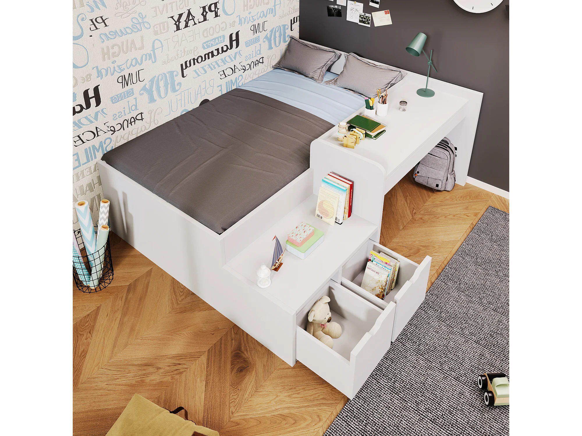Lit enfant en bois massif avec bureau et tiroirs, 90x200 cm, blanc, avec sommier, sans matelas