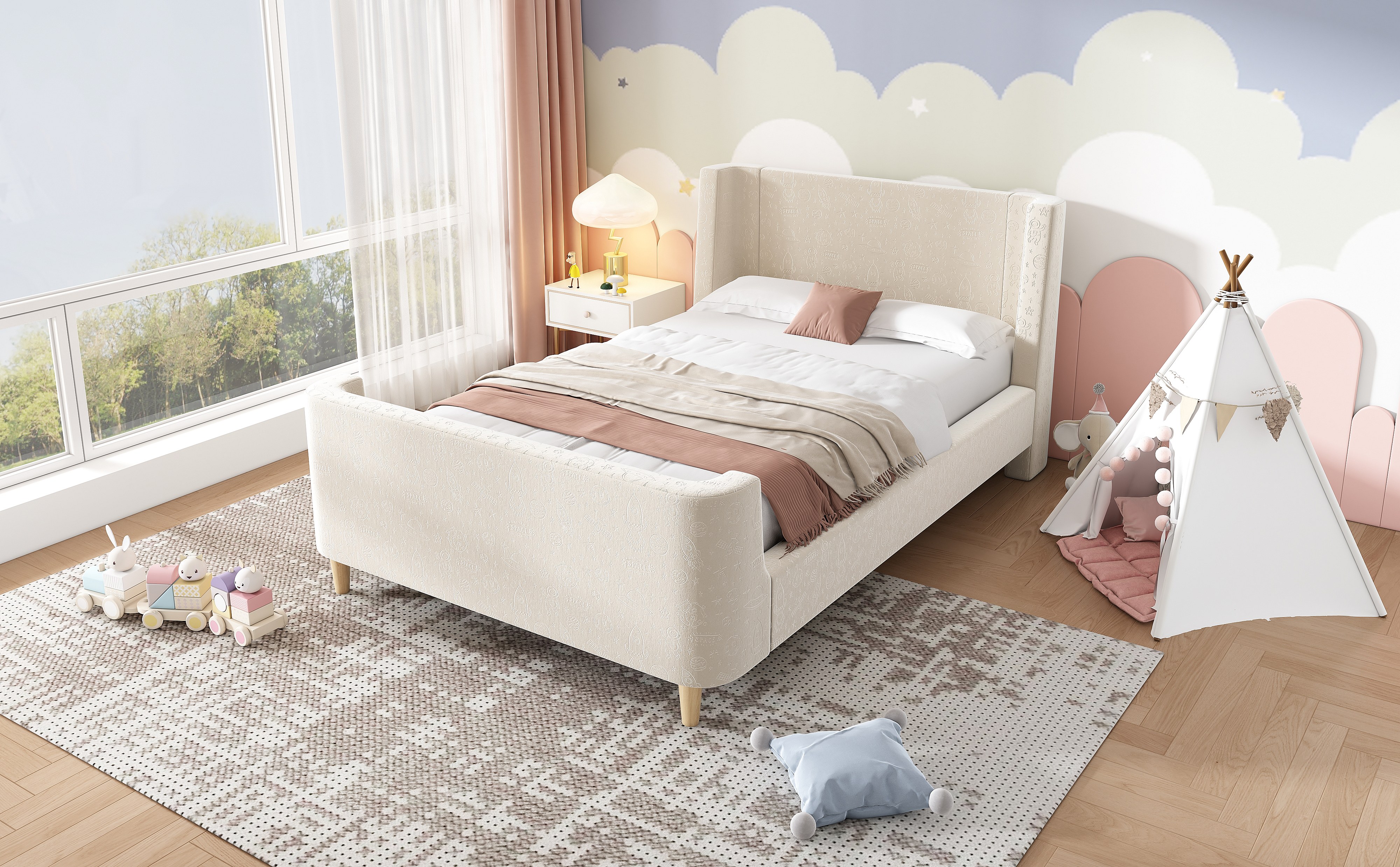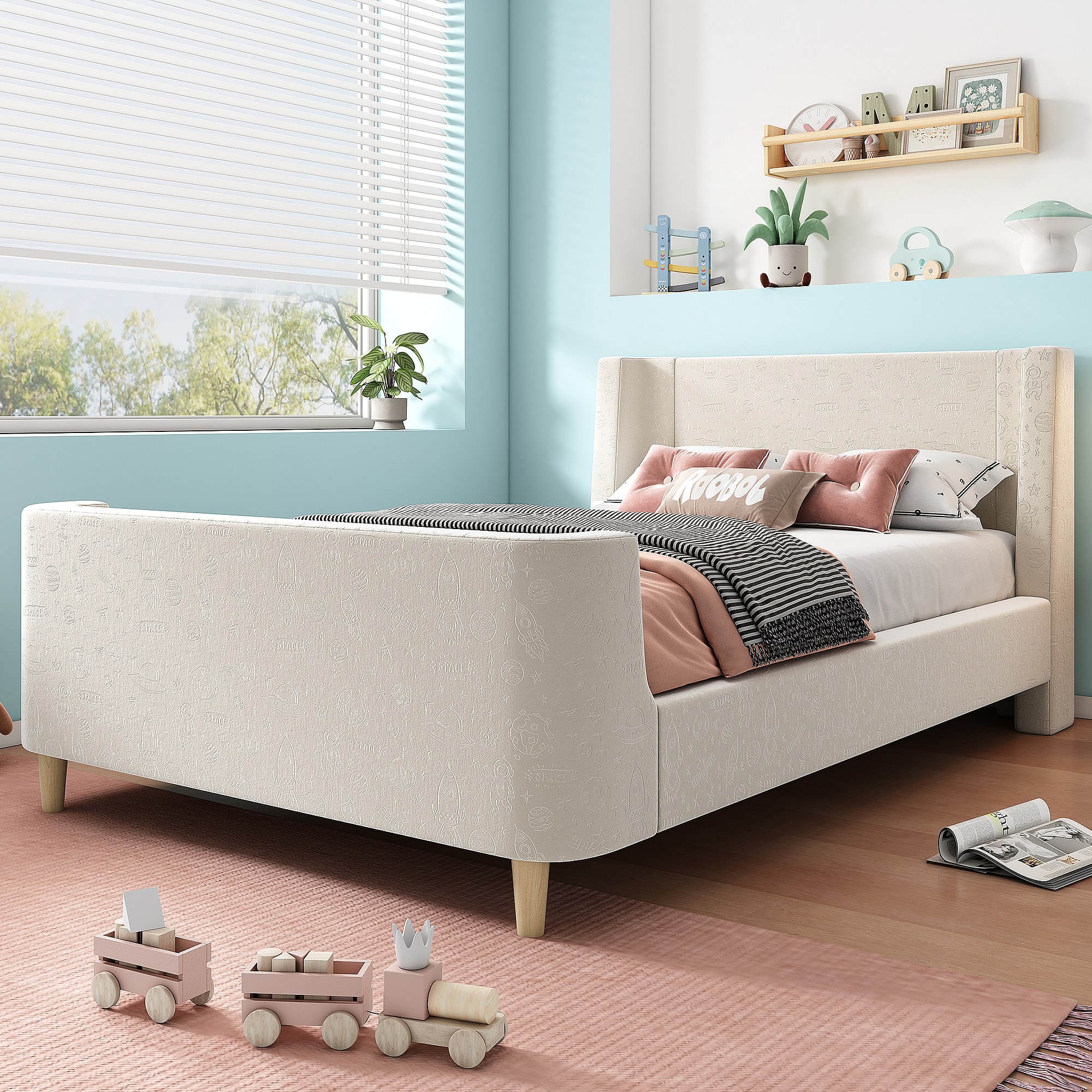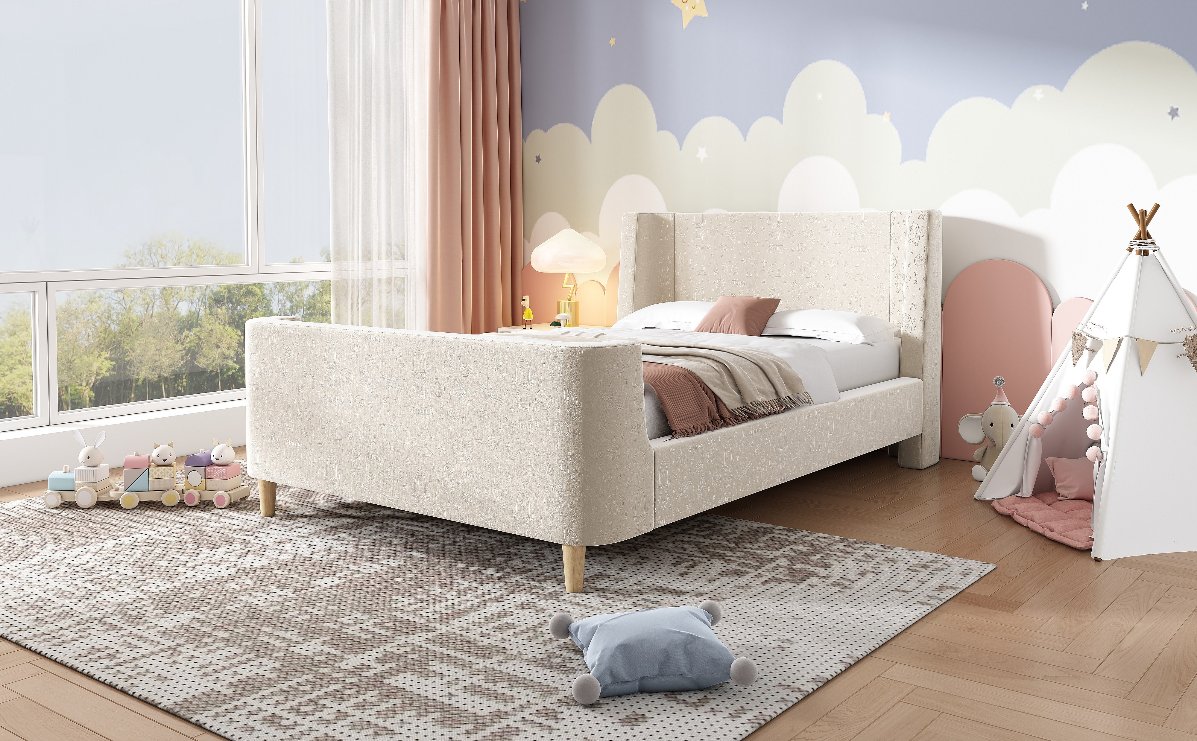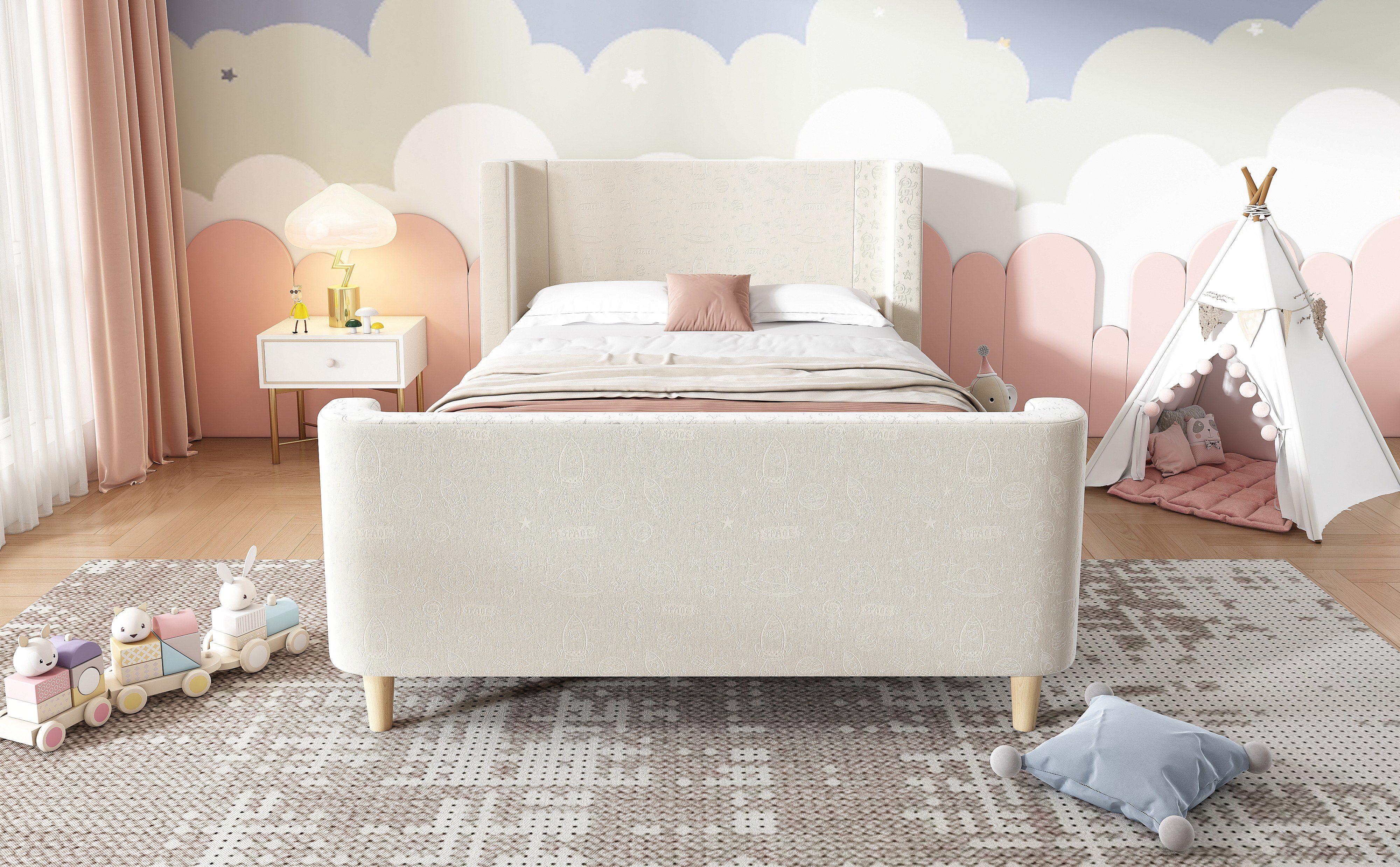 Lit enfant en velours beige, lit à bascule 90 x 200 cm avec motifs spatiaux, pour garçons et filles