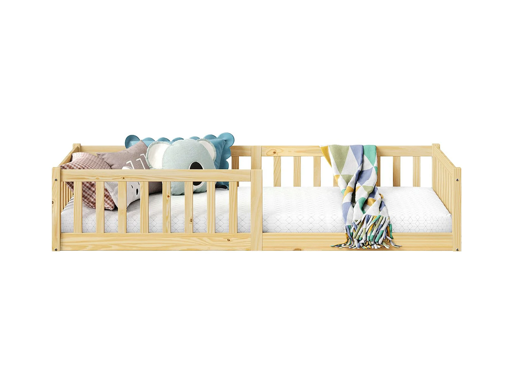 Lit enfant GUSTAVO avec sommier 90x190 cm Montessori, avec barrières de protection, en bois massif coloris naturel