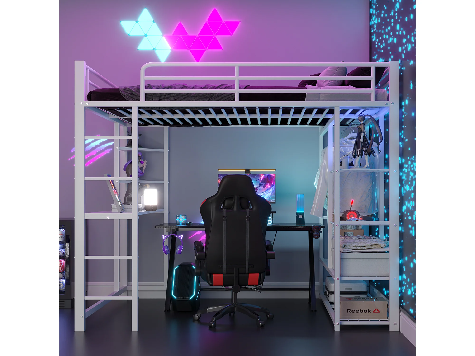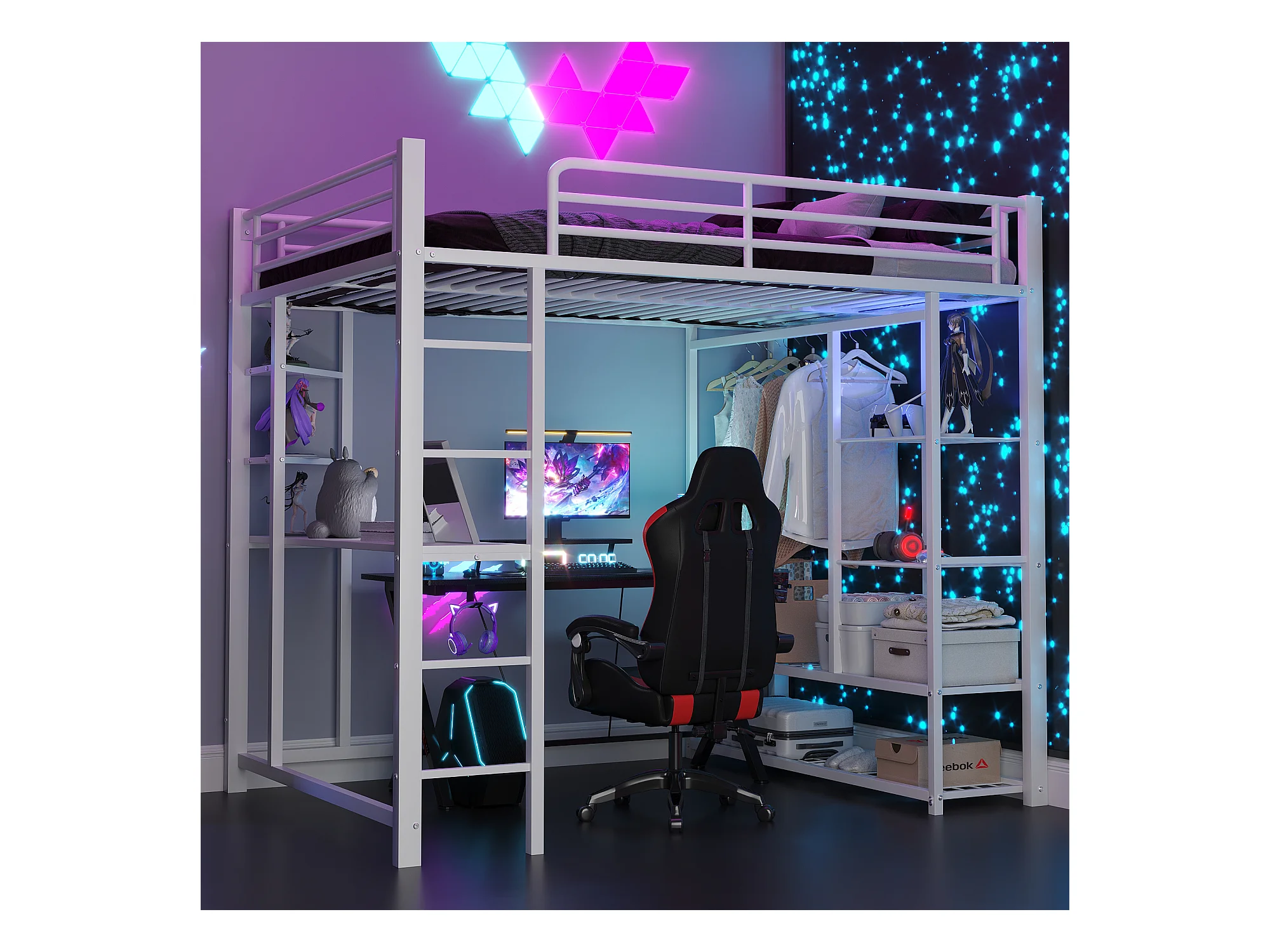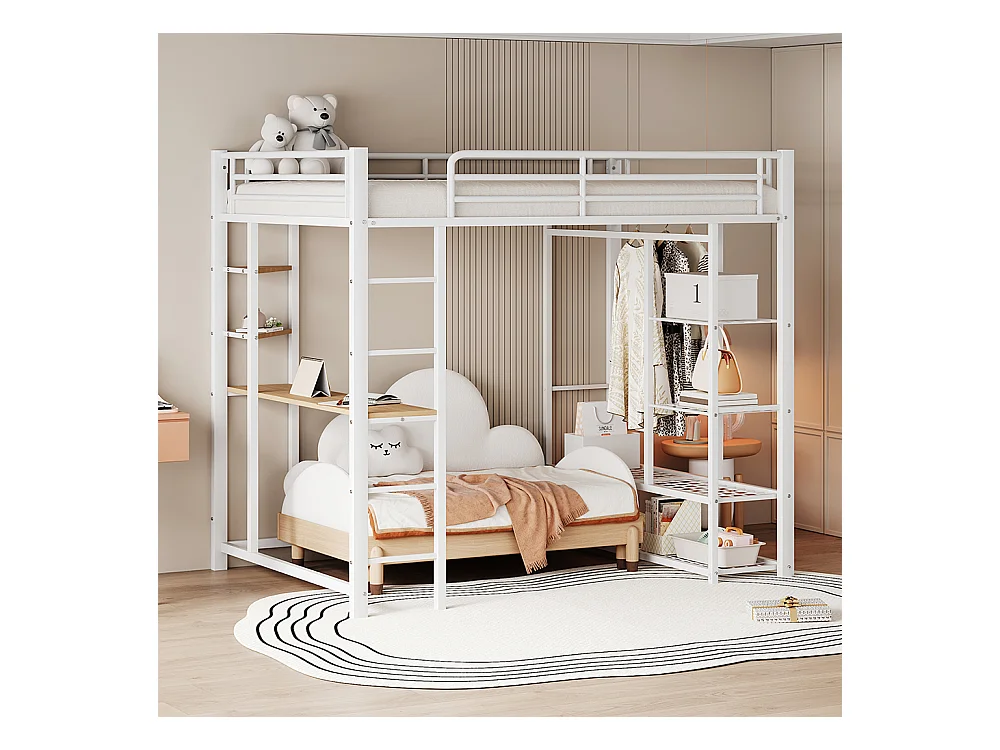 Lit enfant Lit 140x200 Dormant en hauteur avec échelle avec table et rangement Métal Blanc