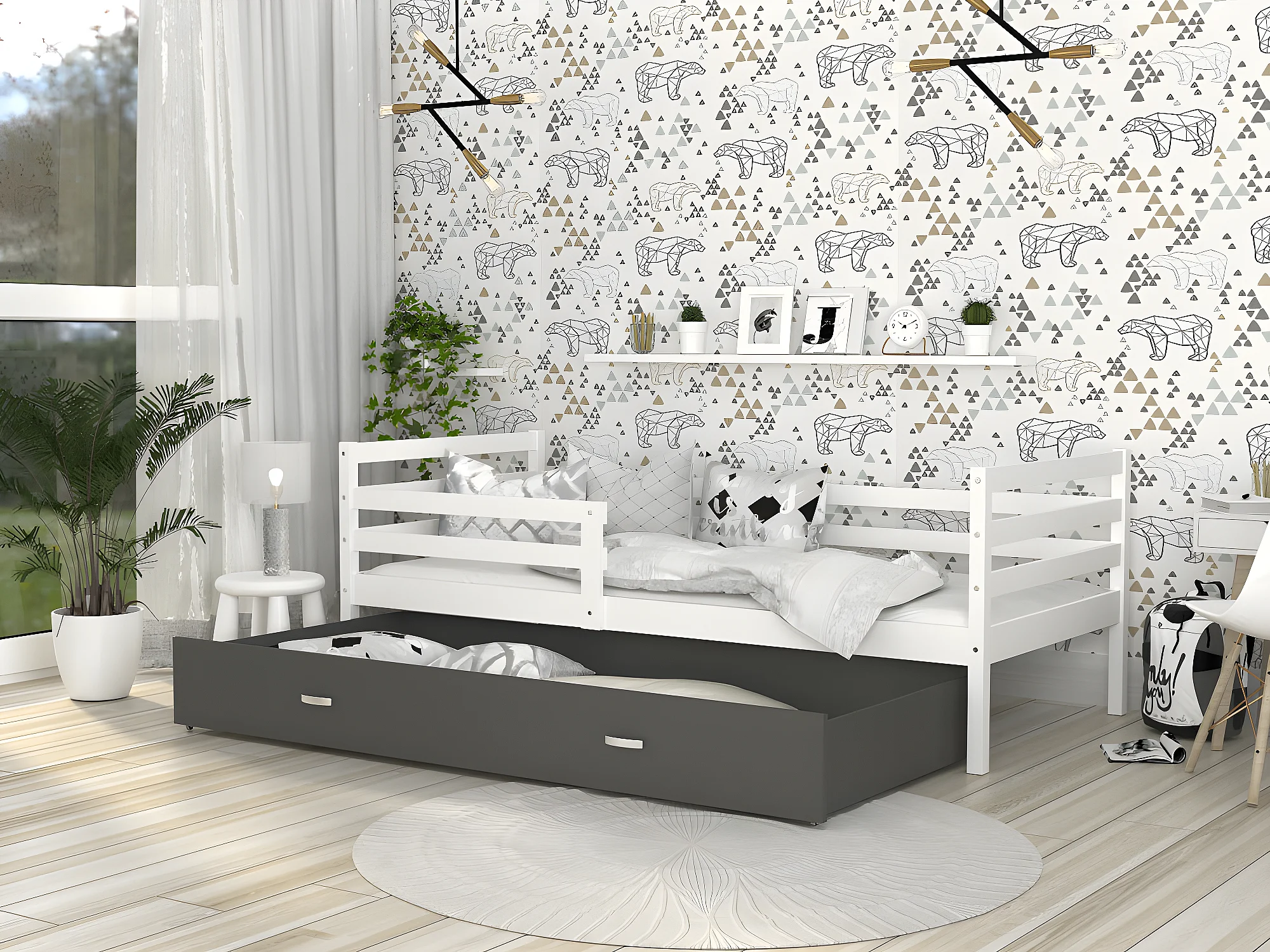 Lit Enfant Milo 90x190 Blanc - gris Livré avec sommiers, tiroir et matelas en mousse de 7cm