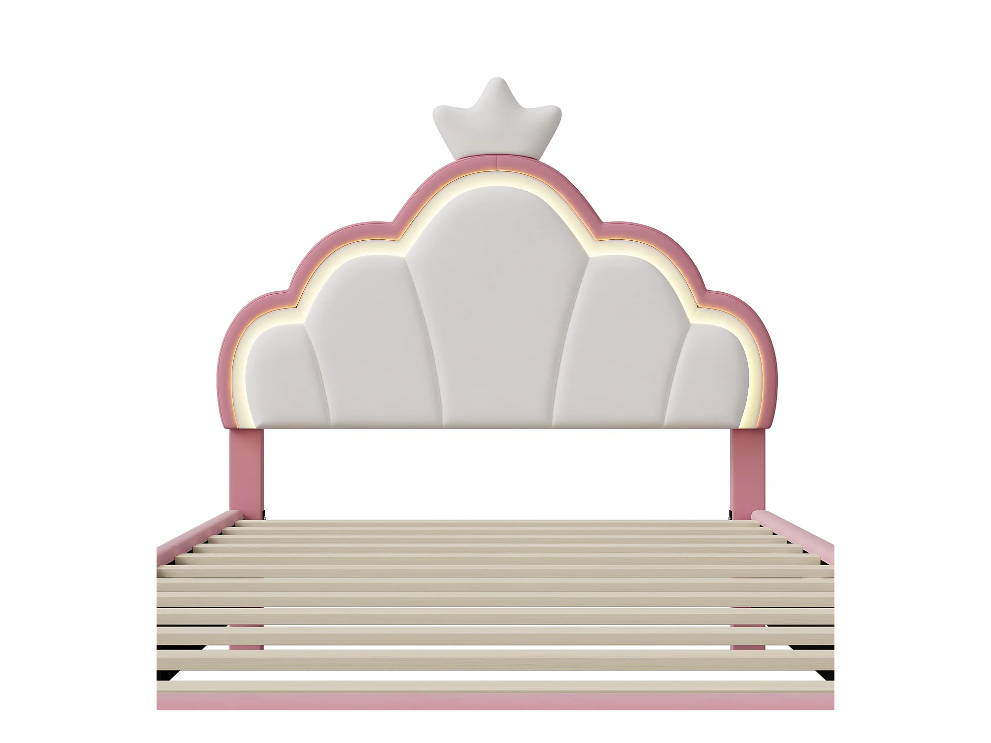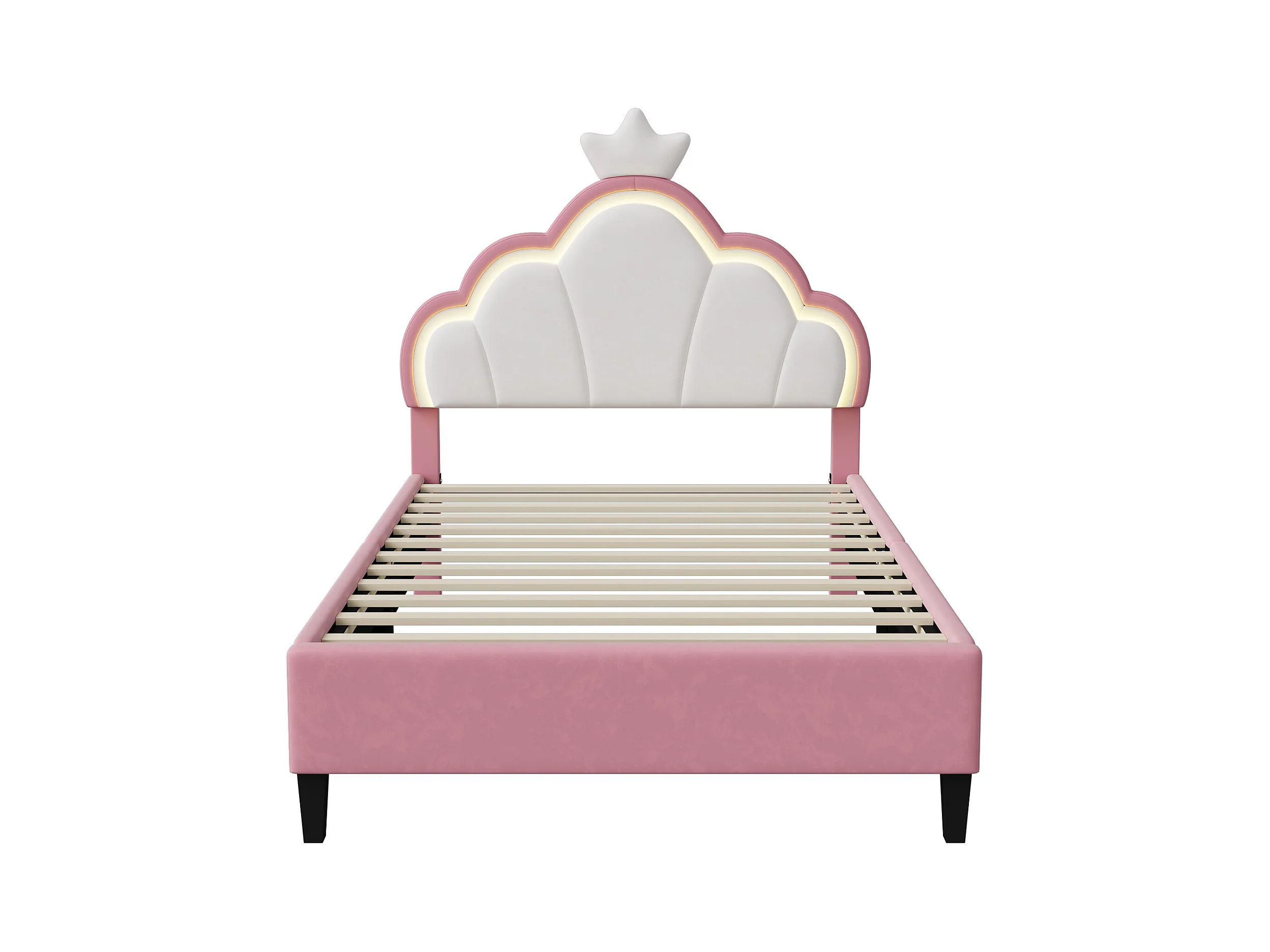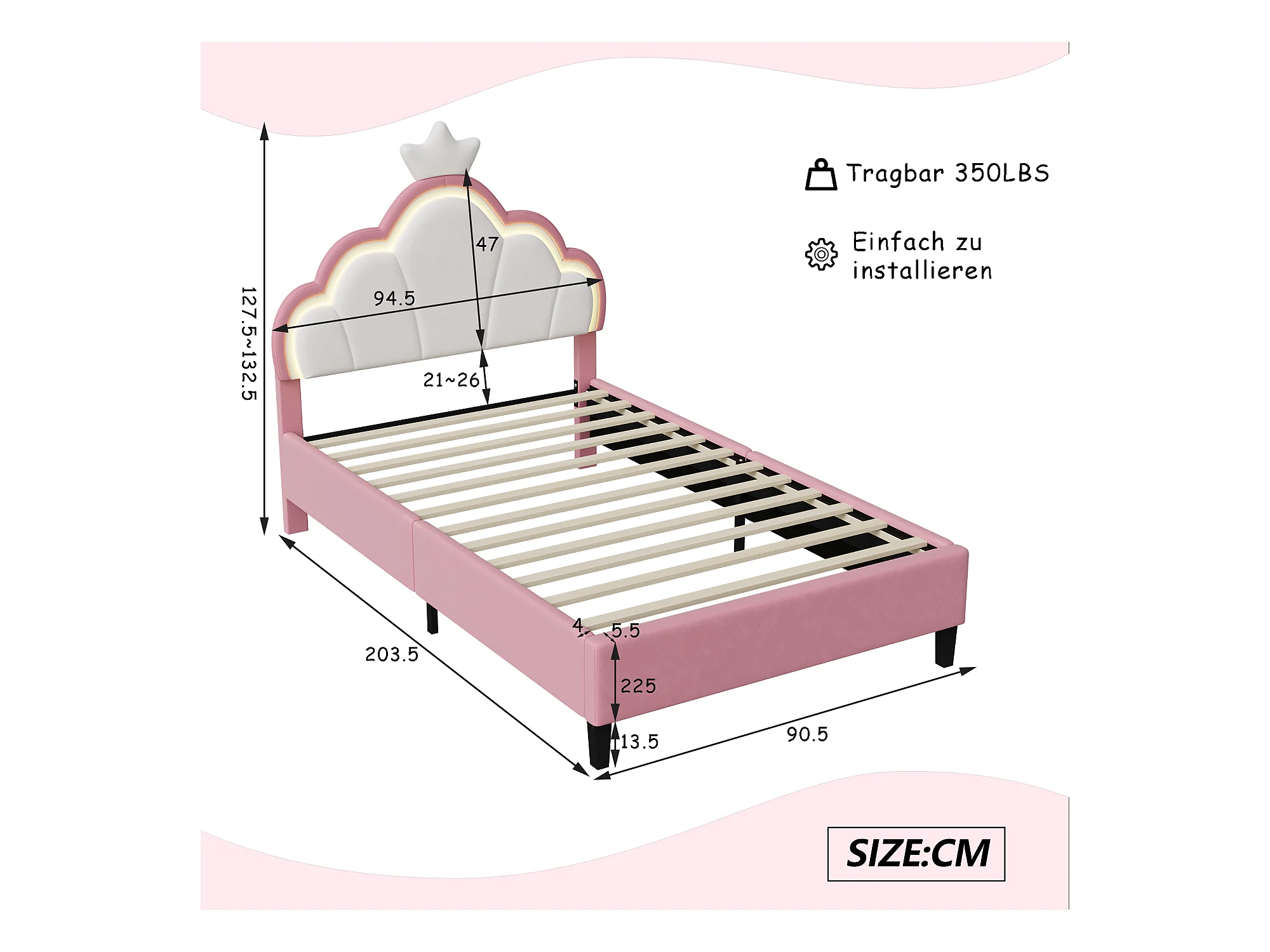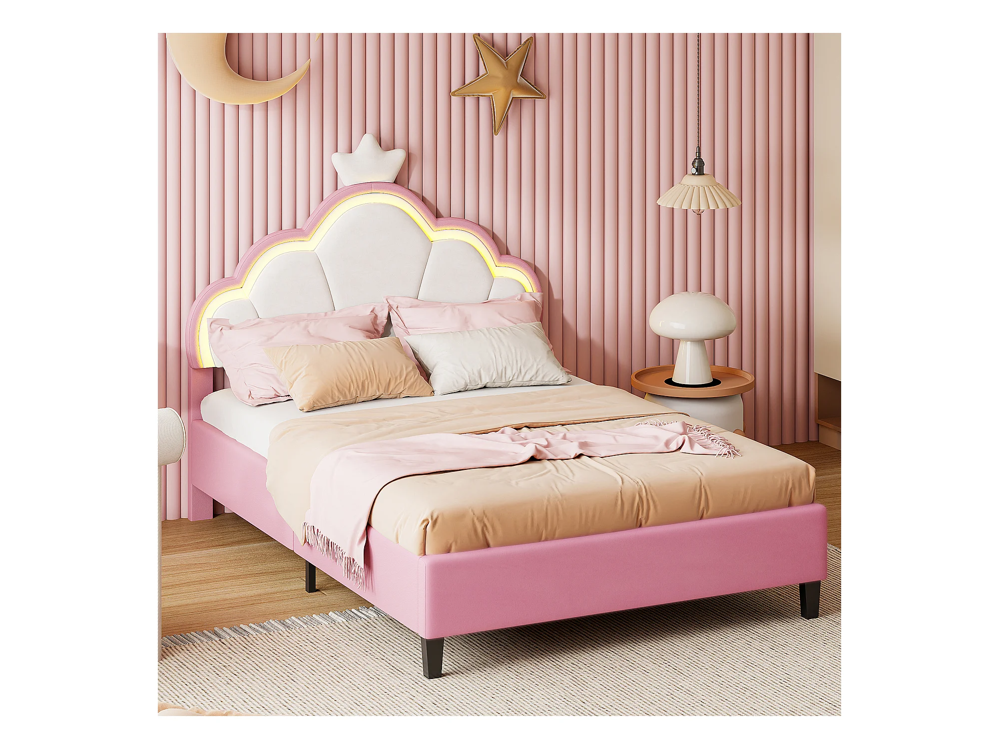 Lit Enfant Princesse et Nuage avec LED RGB-Lit Fille 90x200cm-Tête de Lit Couronne Réglable, Contrôle APP- Velours Anti-Tache et Structure Bois Massif-Rose/Blanc