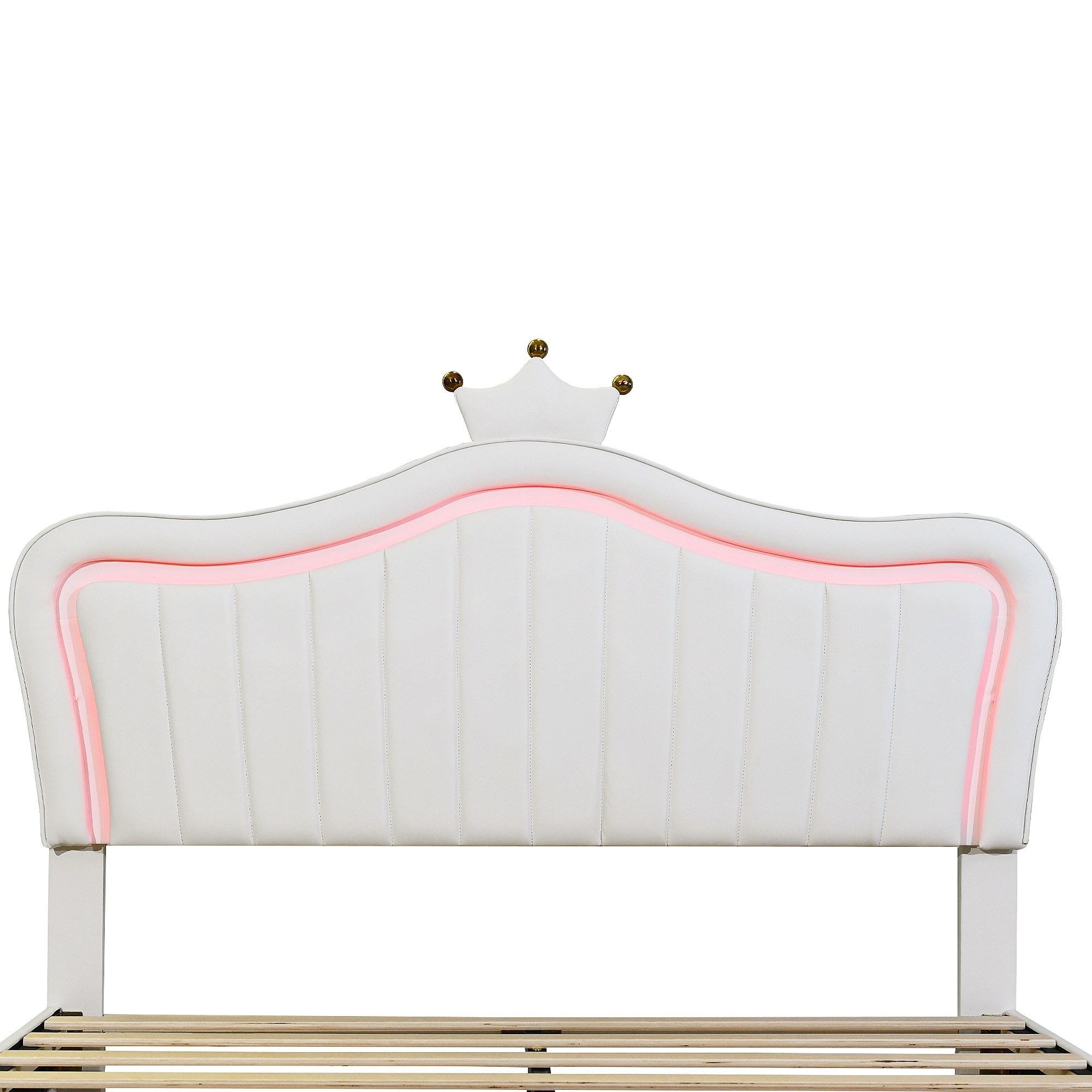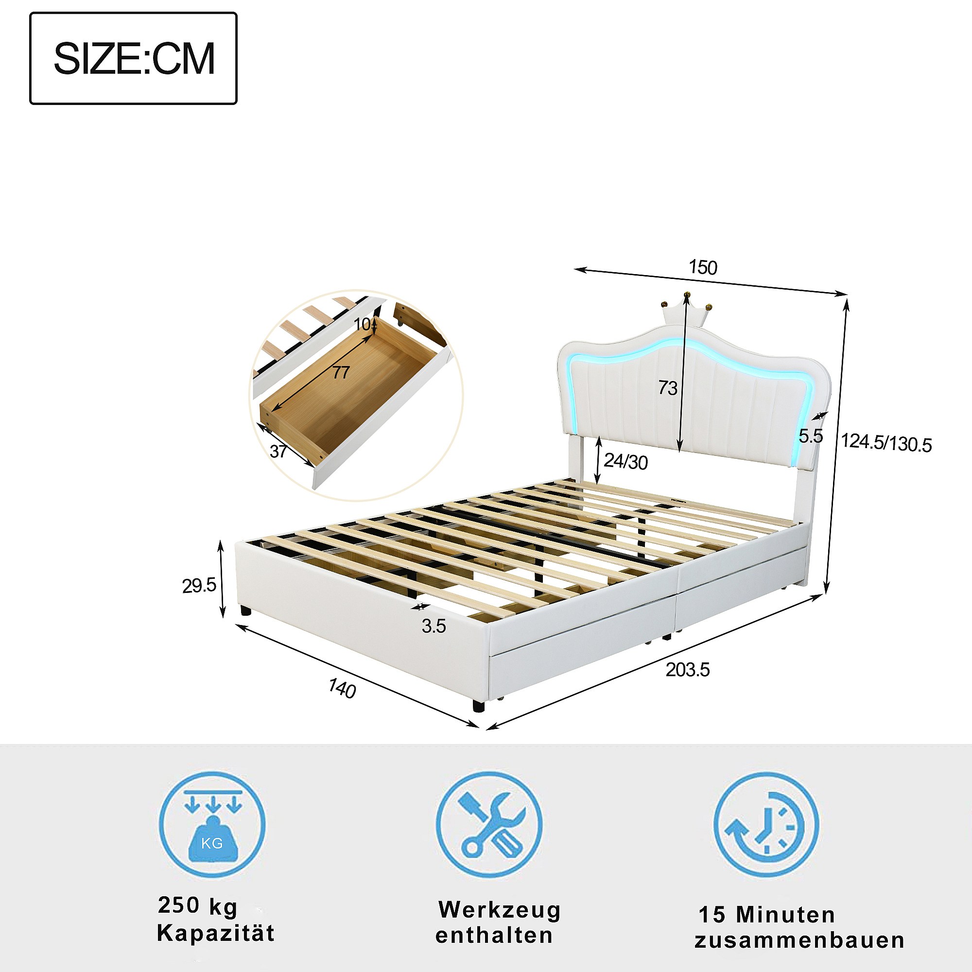 Lit enfant rembourré 140x200 cm, lit fille couronne blanche, PU cuir, tiroirs, LED et sommier inclus