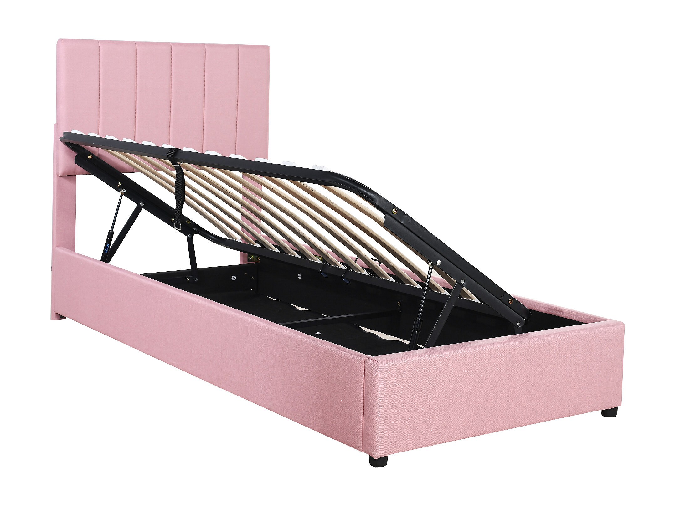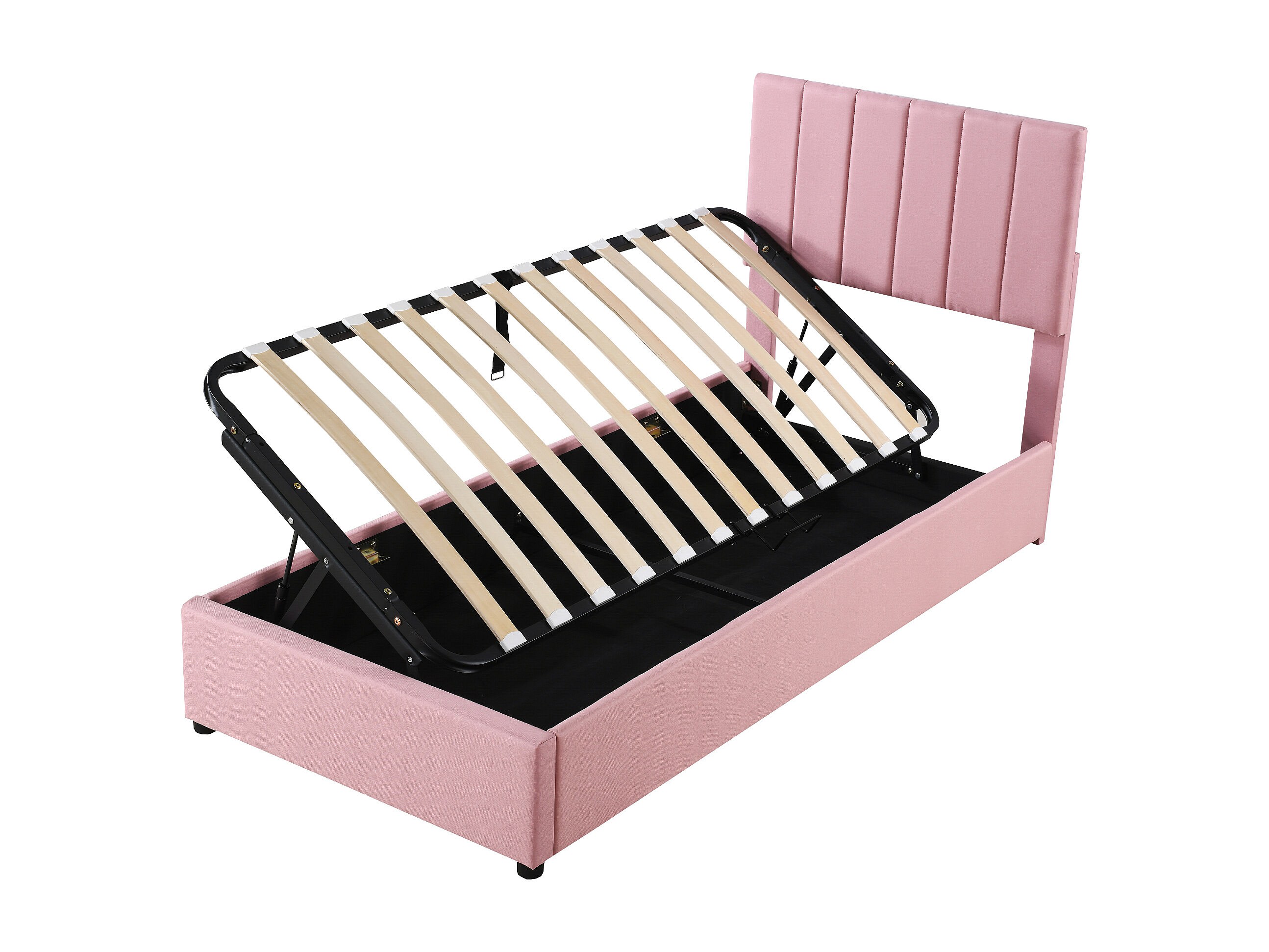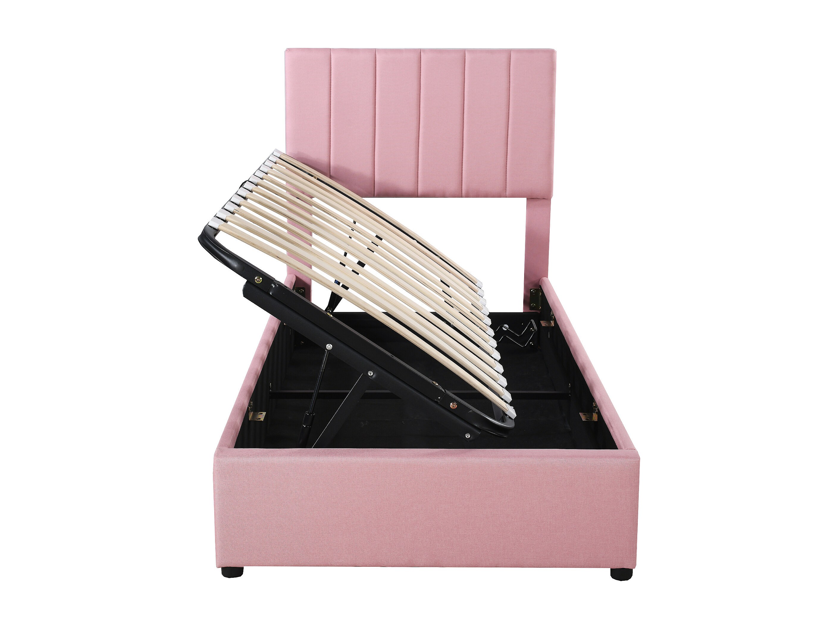 Lit enfant rembourré 90x200 cm avec coffre hydraulique, sommier inclus, velours lin rose, lit multifonction